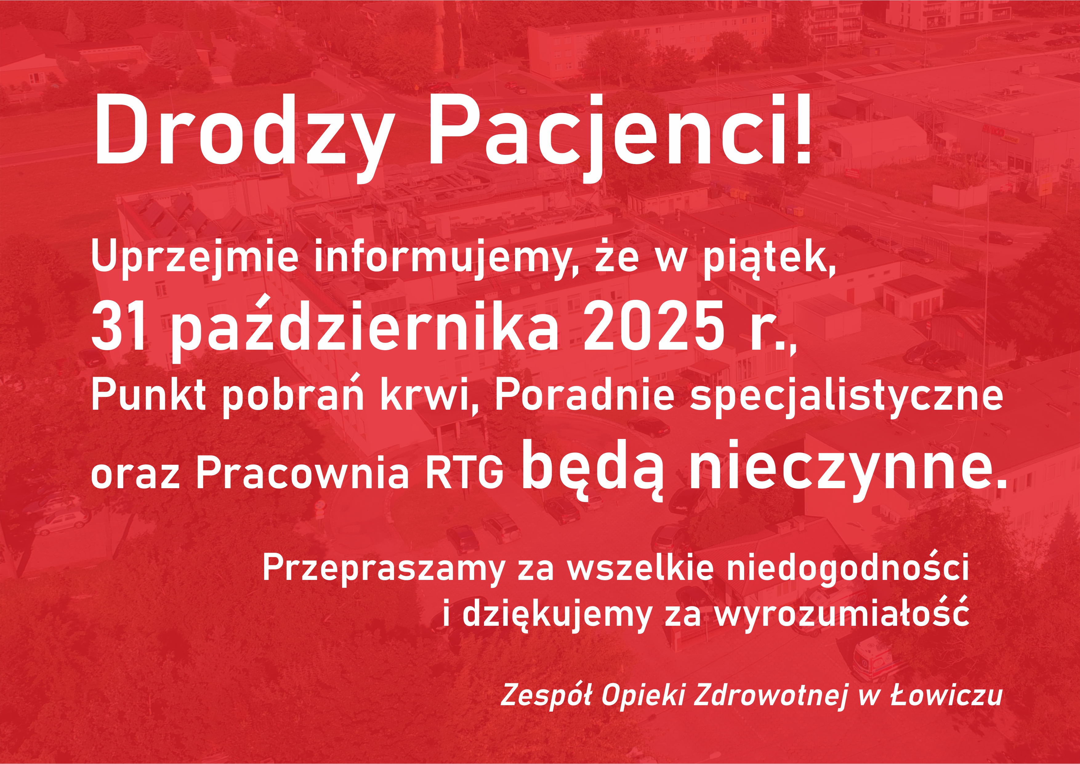 Niedostępność pracowni specjalistycznych, punktu pobrań krwi i Pracowni RTG w piątek, 31 października 2025 r.