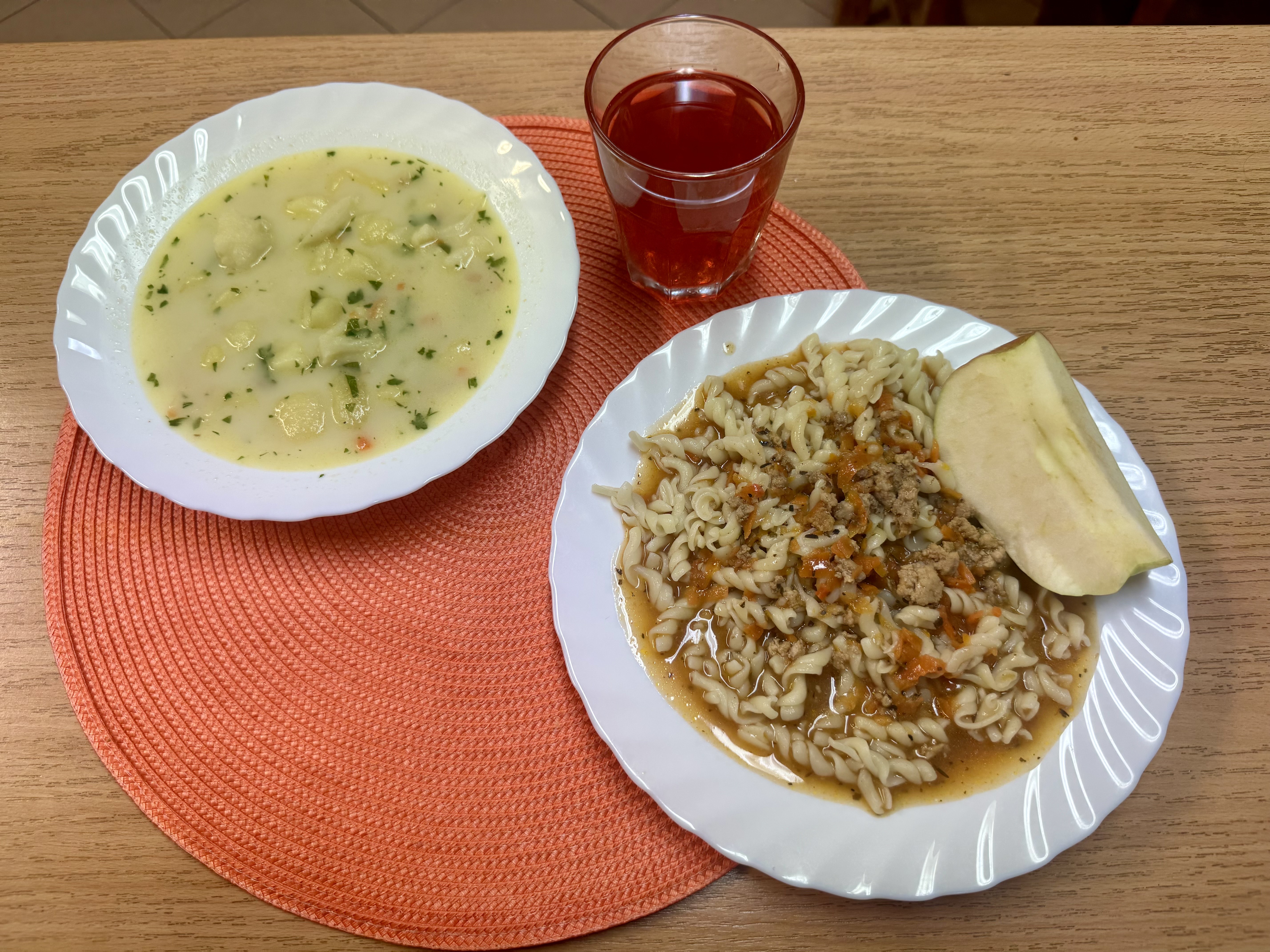 | Zupa ogórkowa z ziemniakami 300ml Makaron Spaghetti z sosem bolognese Jabłko 140g Kompot owocowy b/c 250ml |