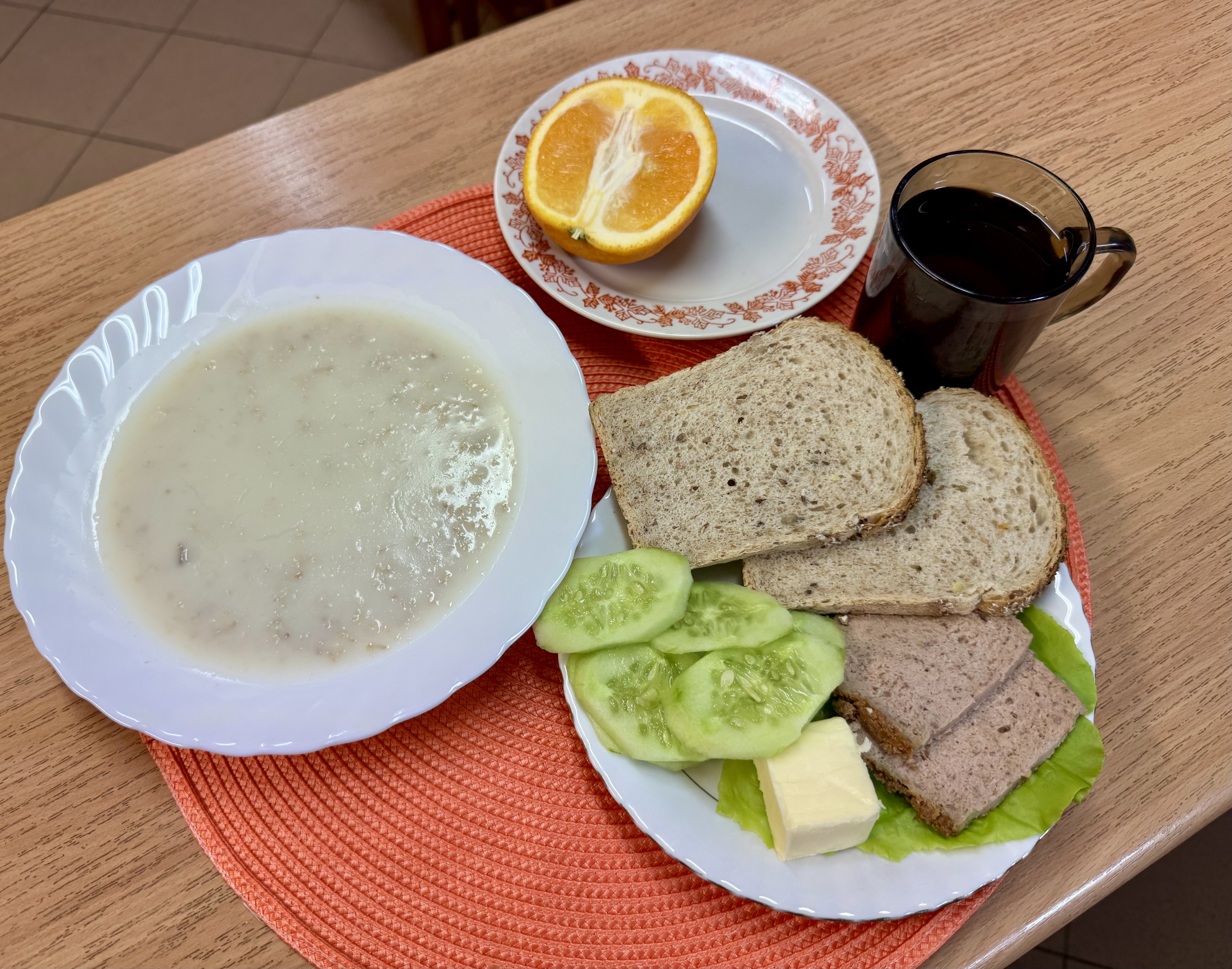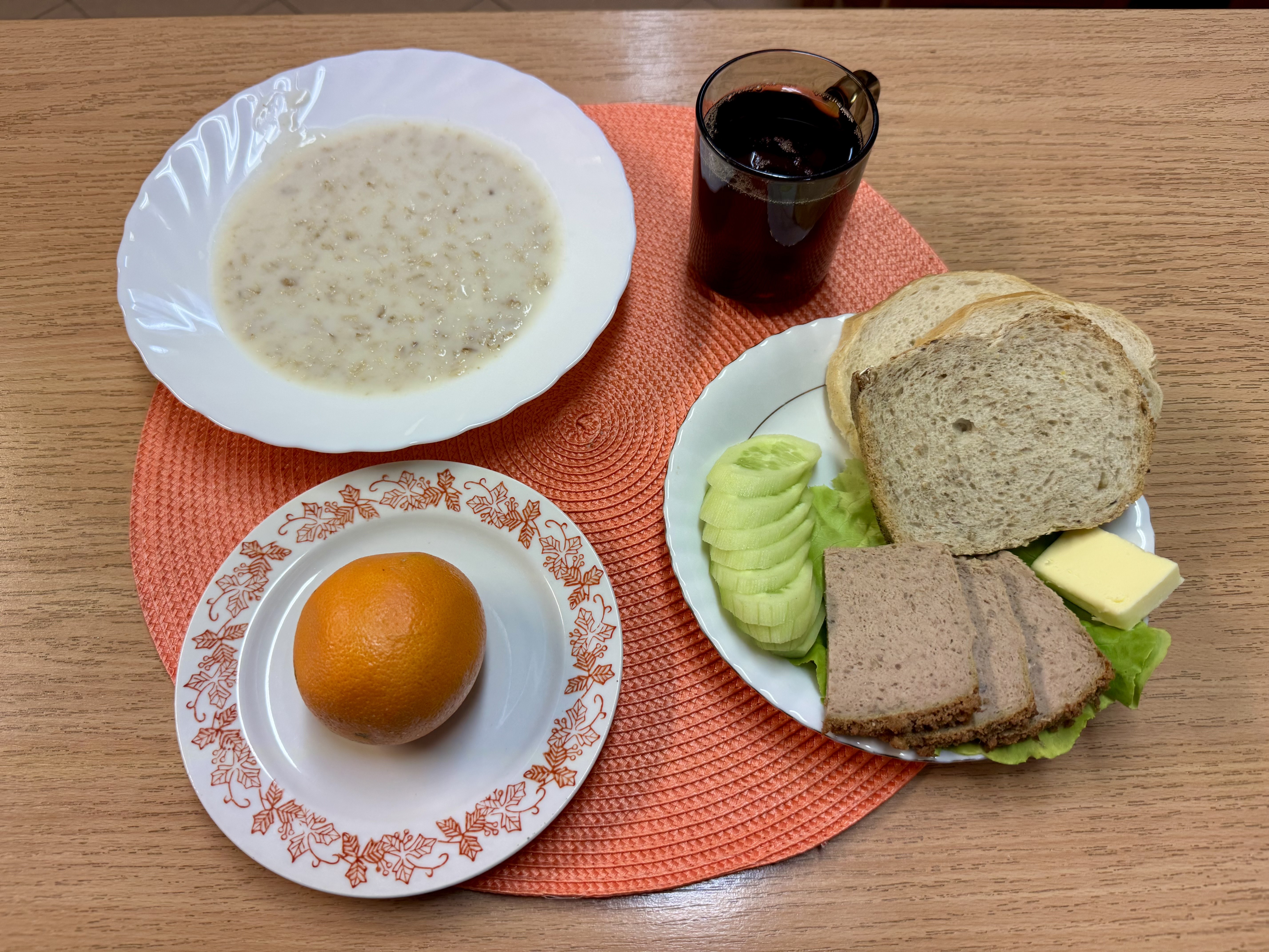| Zupa ml. z płatkami owsianymi 300ml (GLU, MLE) Herbata z cukrem 250ml Chleb razowy 30g (GLU, SOJ) Chleb zwykły 100g (GLU, SOJ) Masło 10g (MLE) Pasztet pieczony 60g (MLE) Owoc 70g ogórek świeży 90g Sałata |