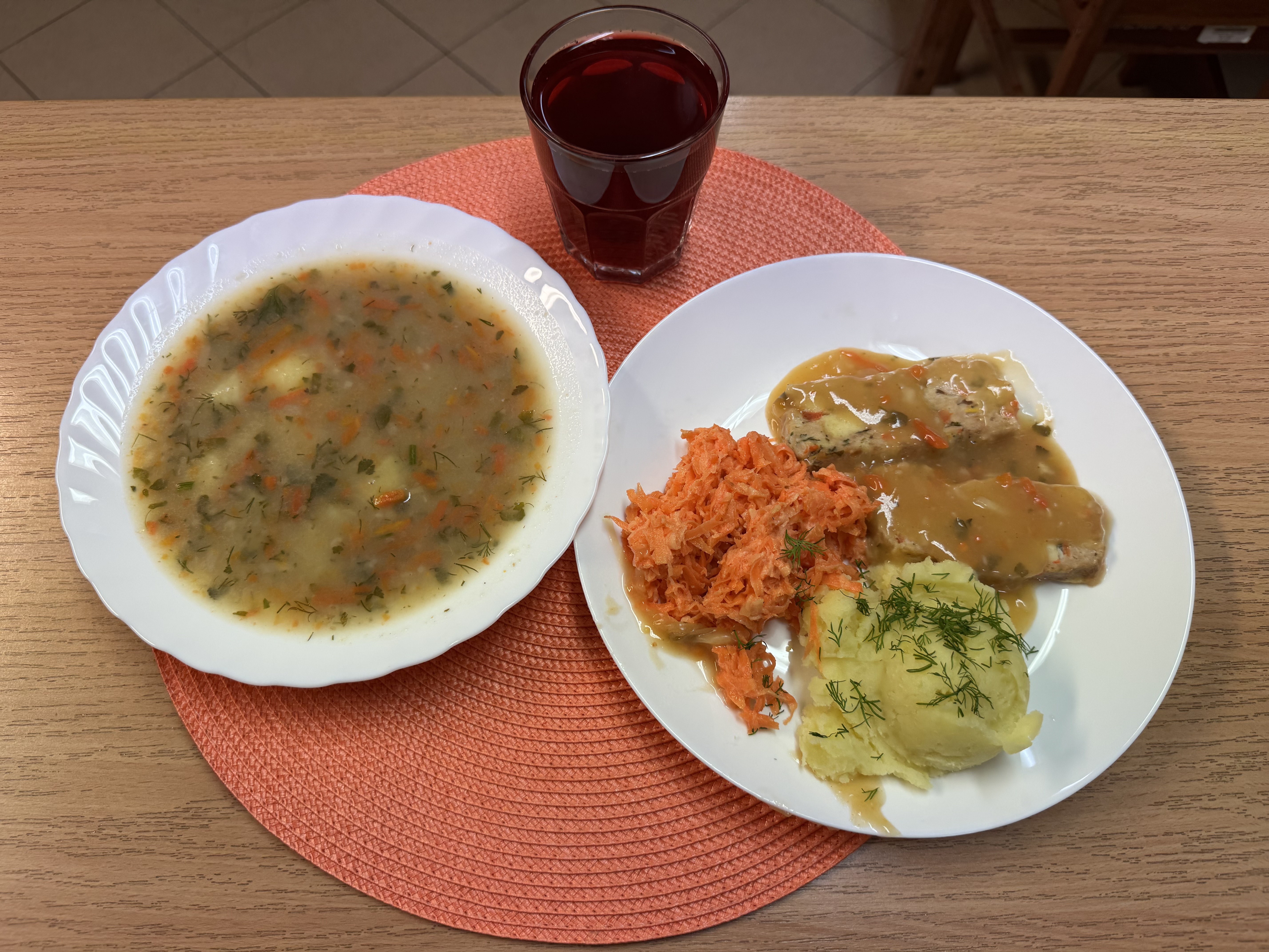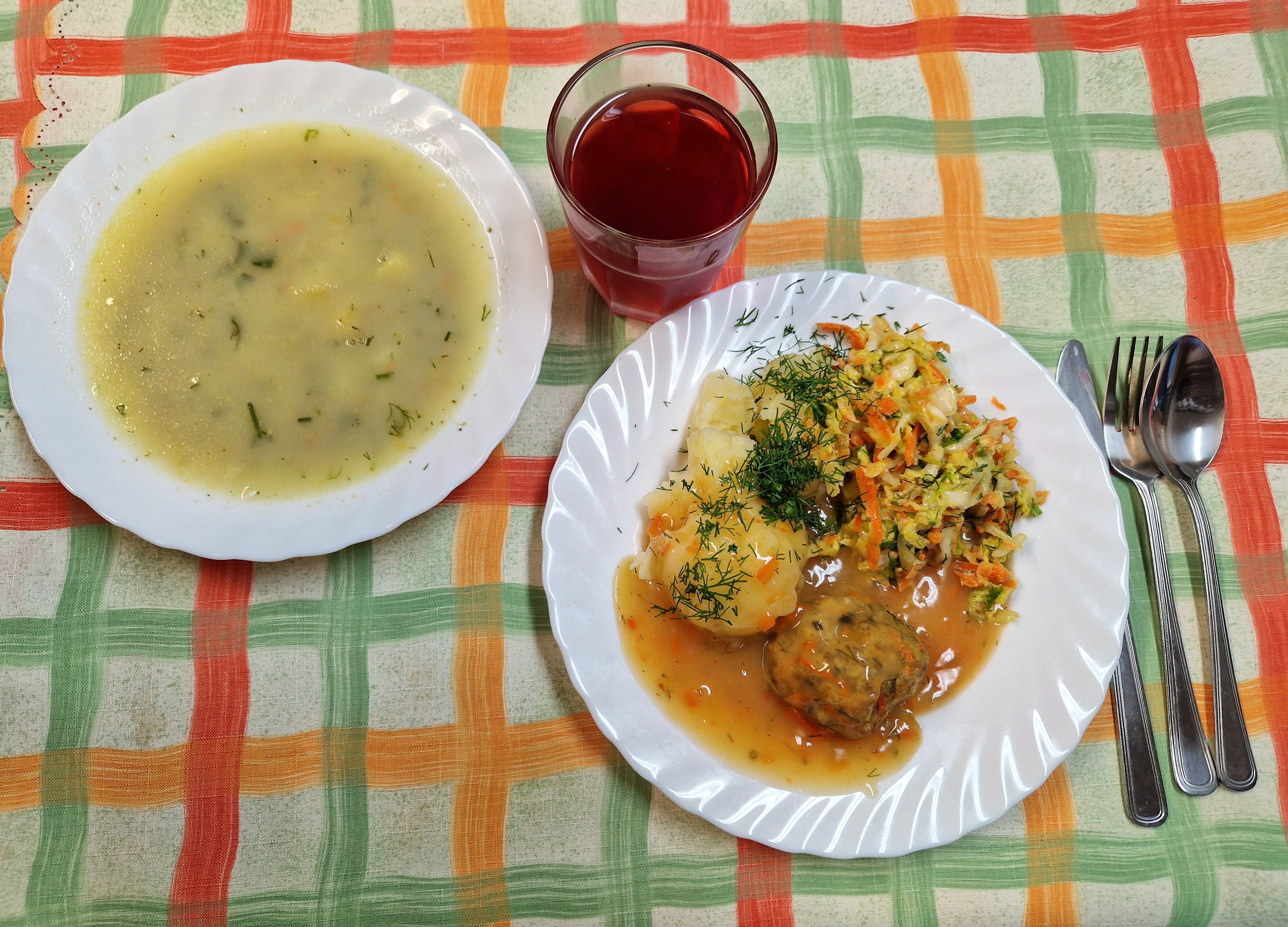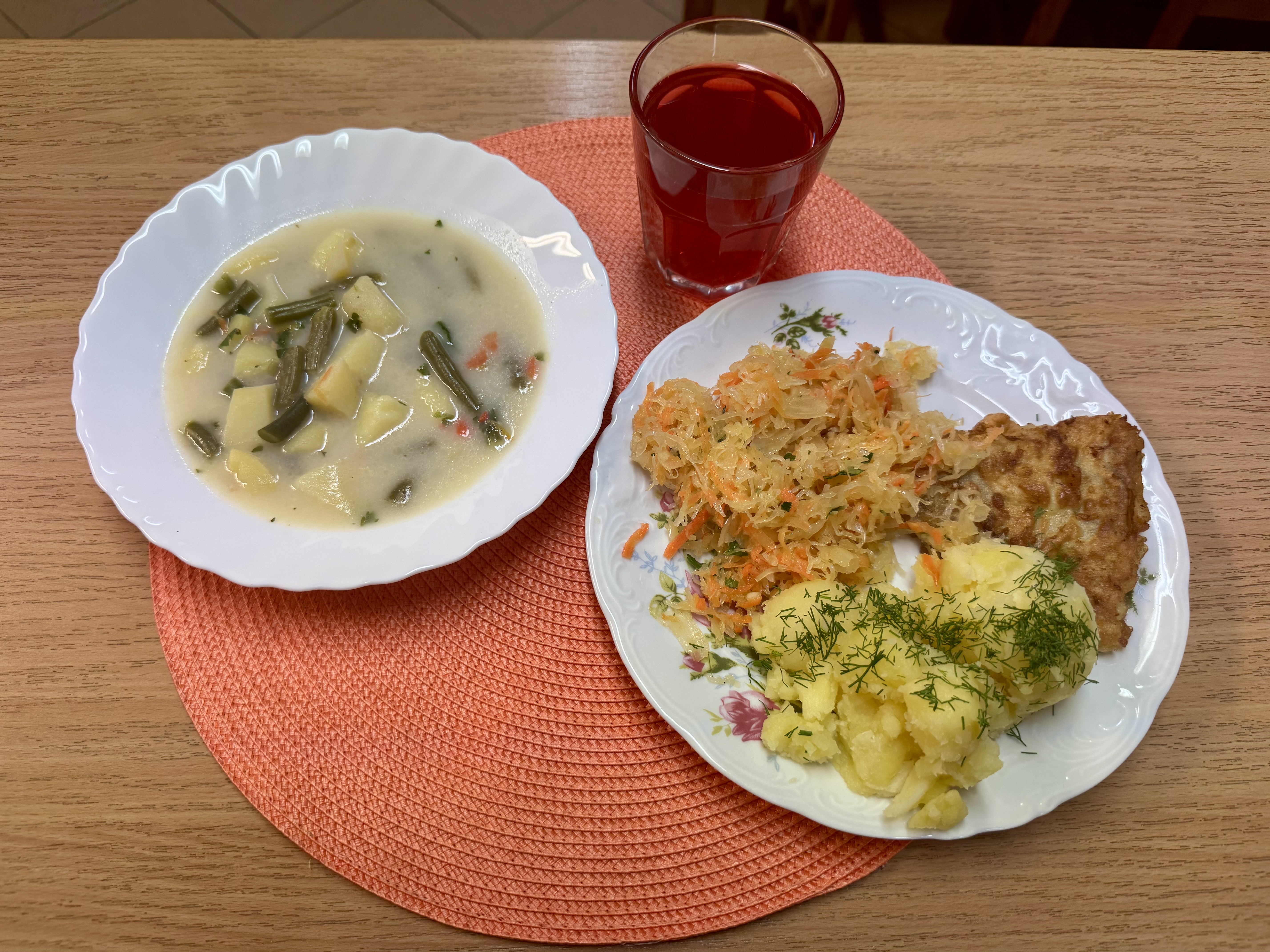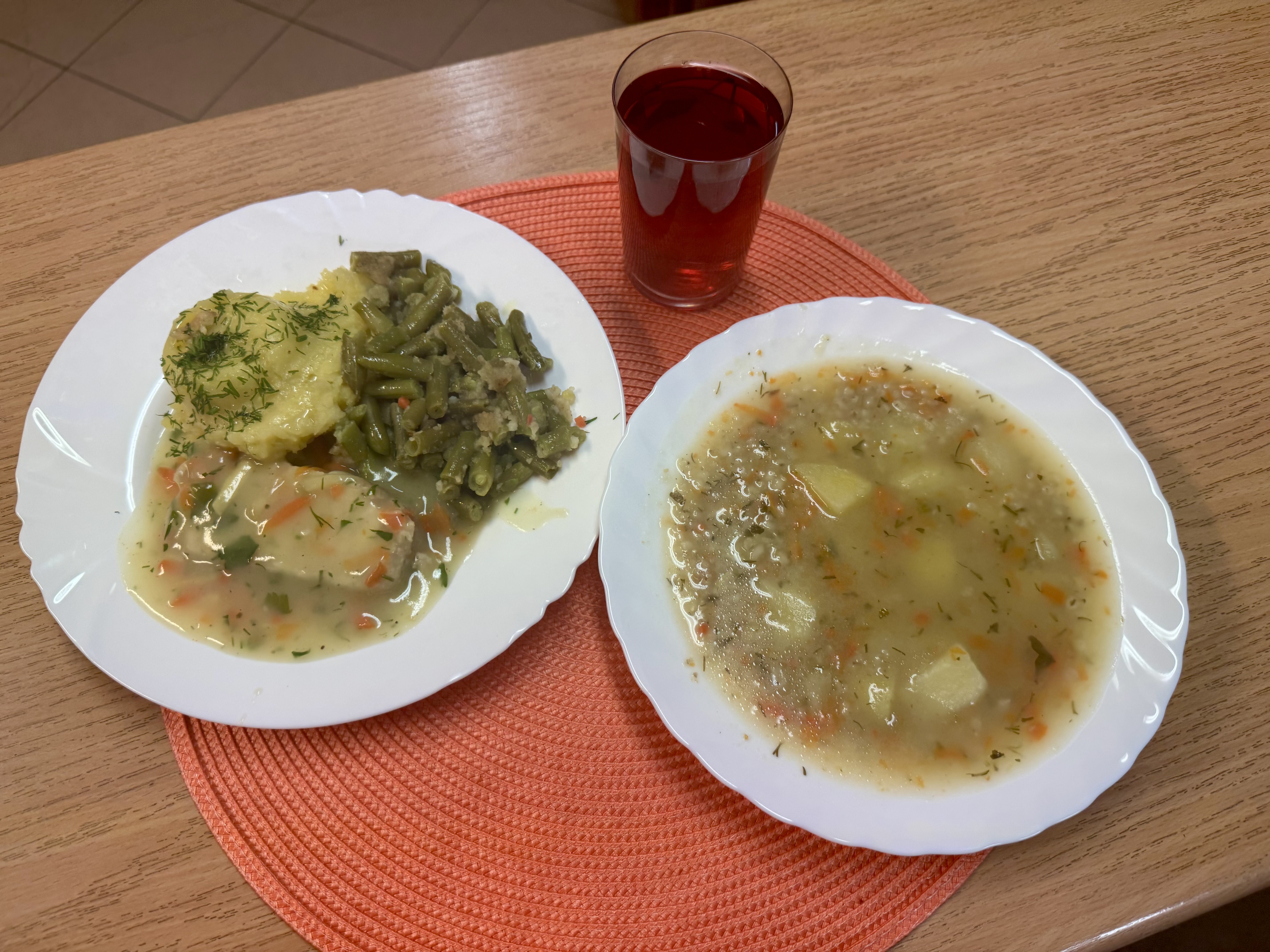 | Krupnik z kaszy jęczmiennej (GLU, MLE) Rolada drobiowa 90g Ziemniaki 200g Fasolka szparagowa 140g Kompot owocowy 250ml |
