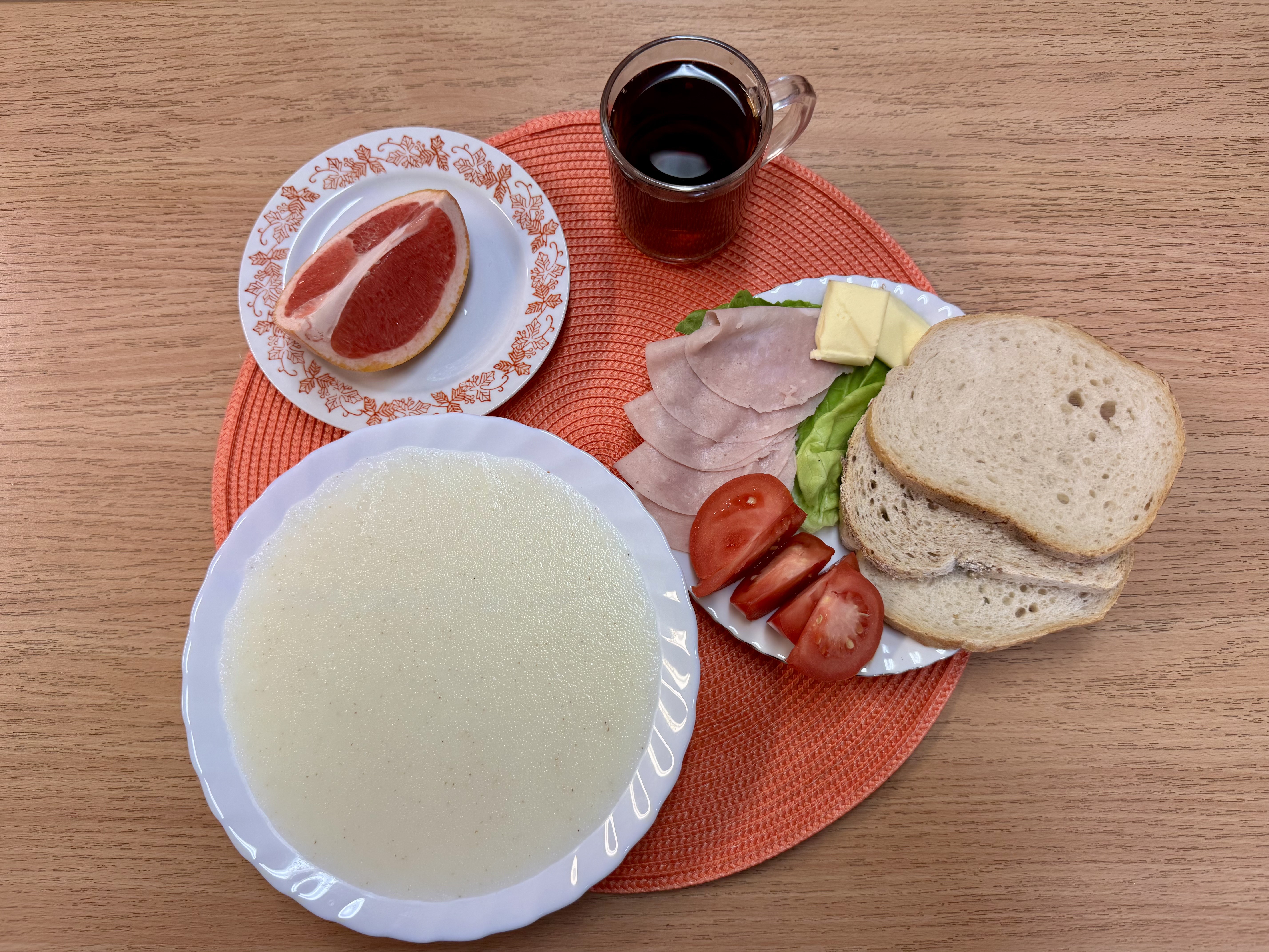 | Zupa ml. z kaszą manną 300ml (GLU, MLE) Herbata z cukrem 250ml Chleb zwykły 100g (GLU, SOJ) Chleb razowy 30g (GLU) Masło 10g (MLE) Łopatka prasowana - wędlina 50g (SOJ, SEL) Pomidor 70g Sałata masłowa 20g Owoc 70g |