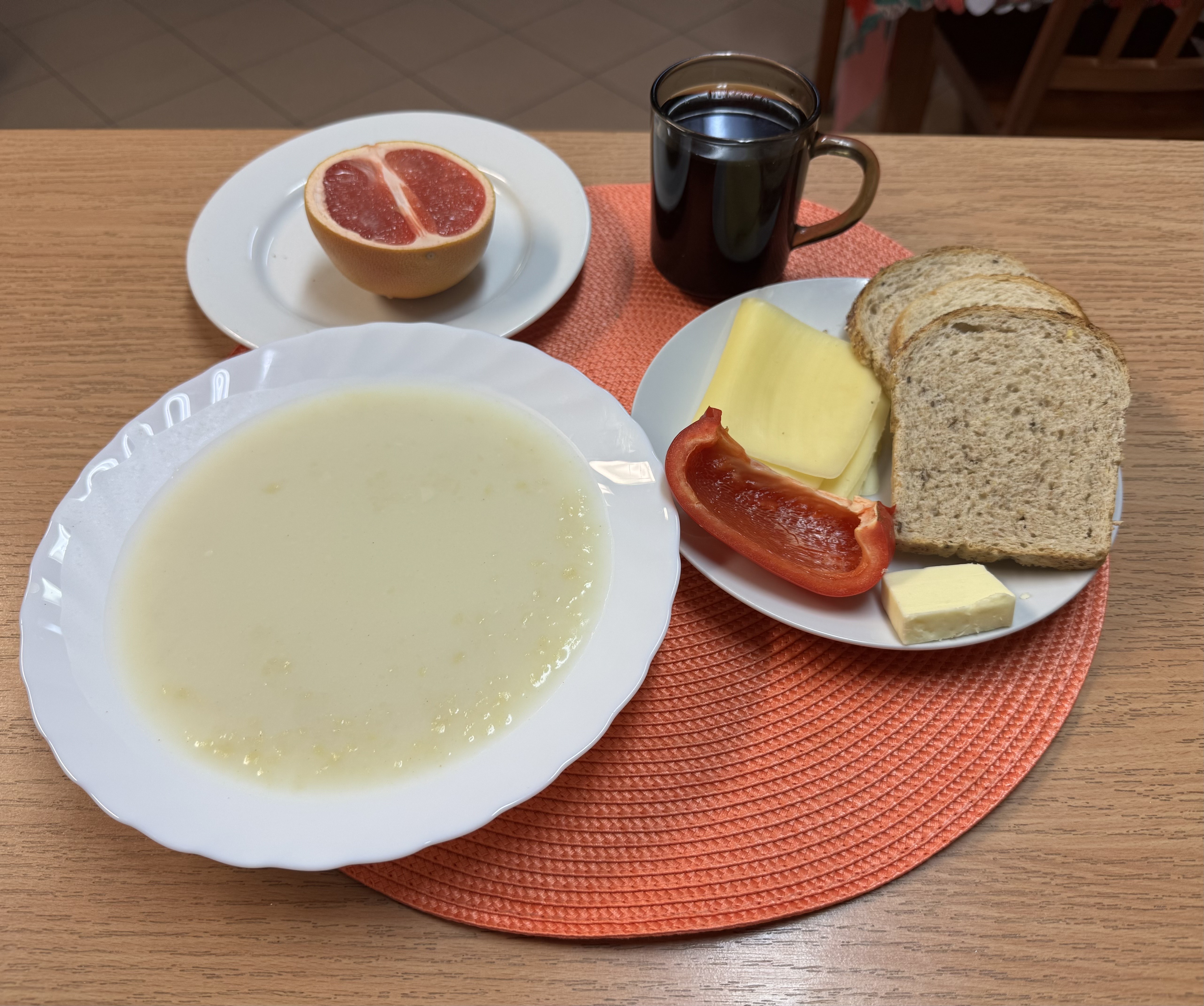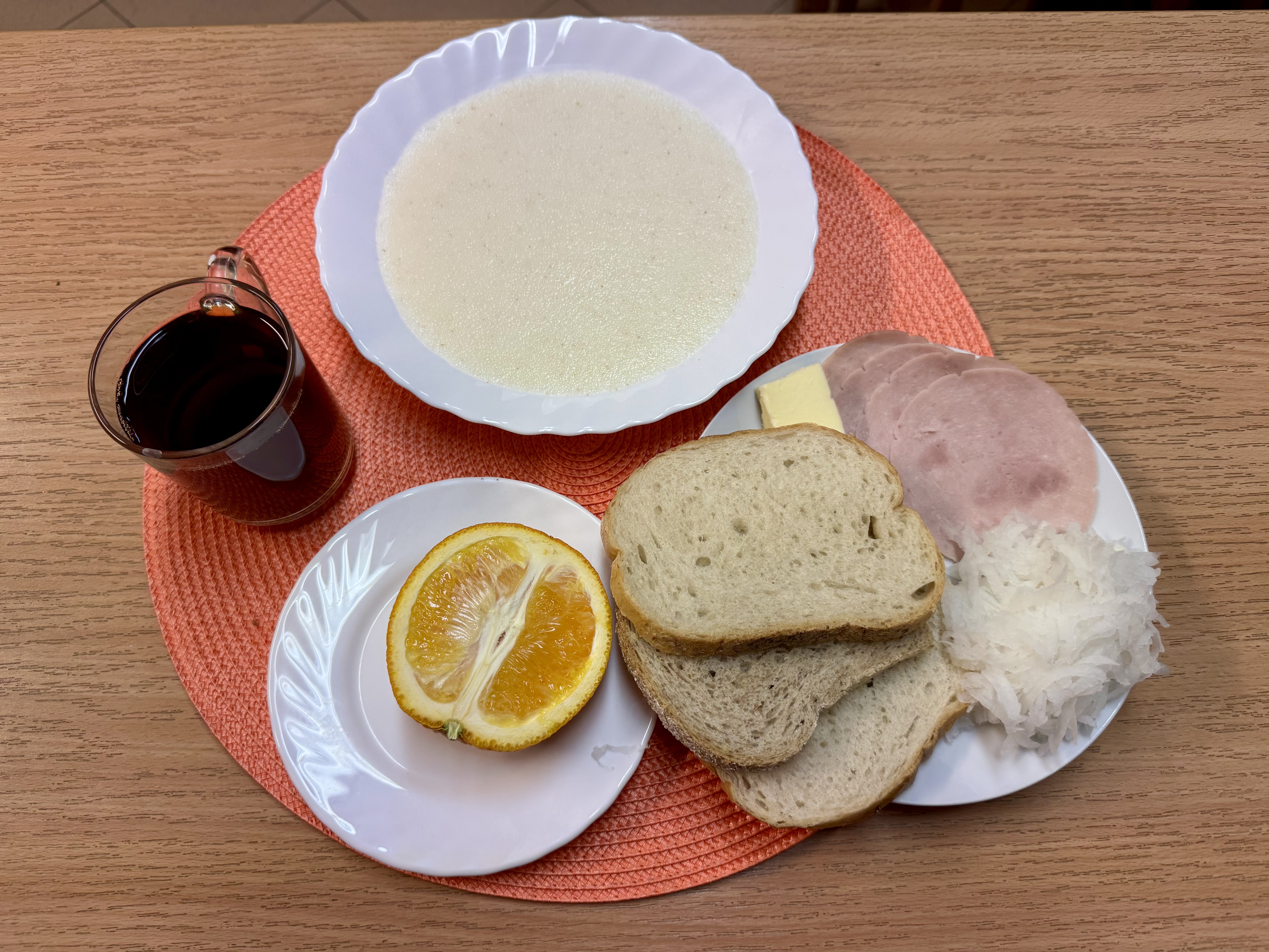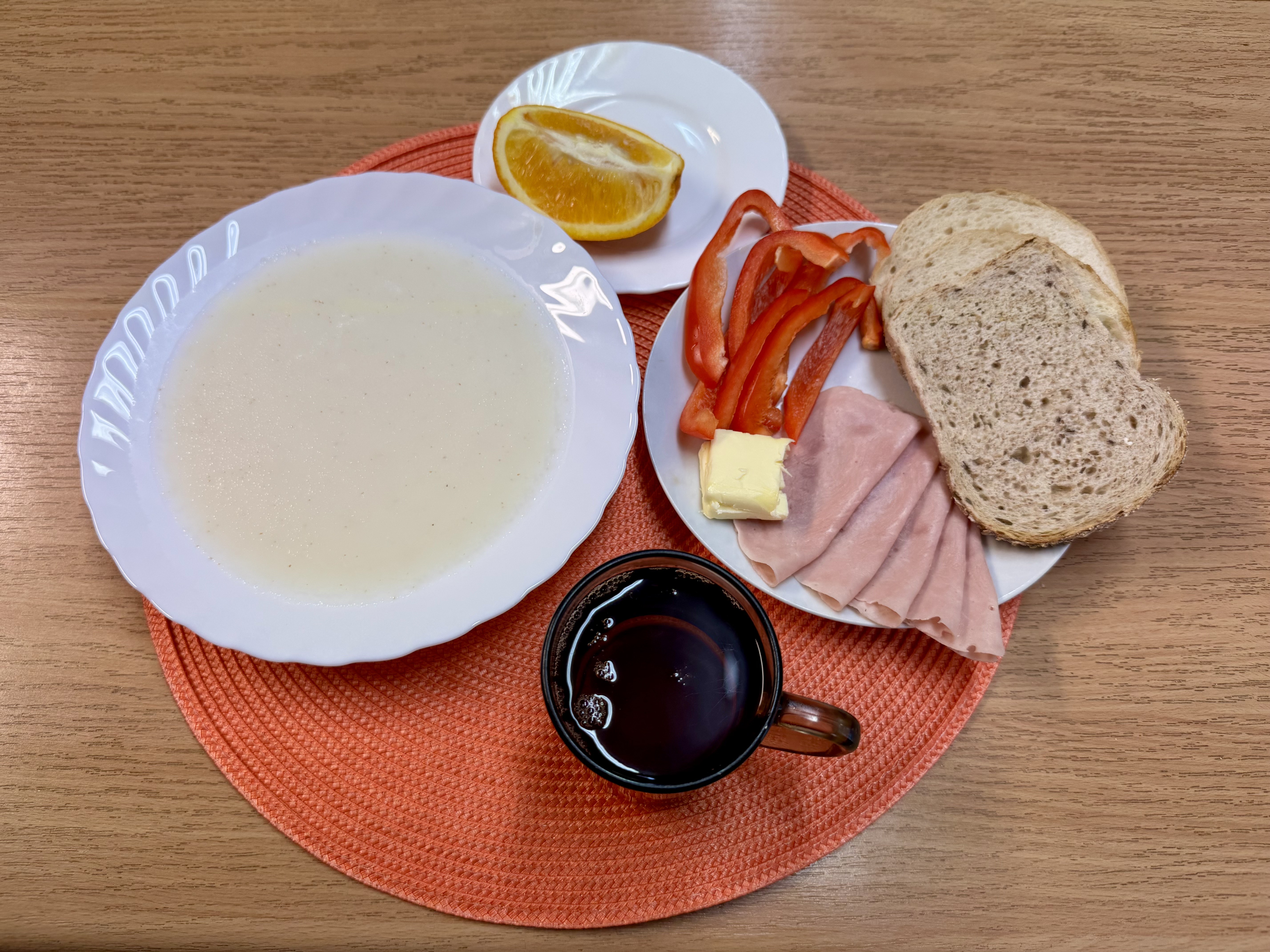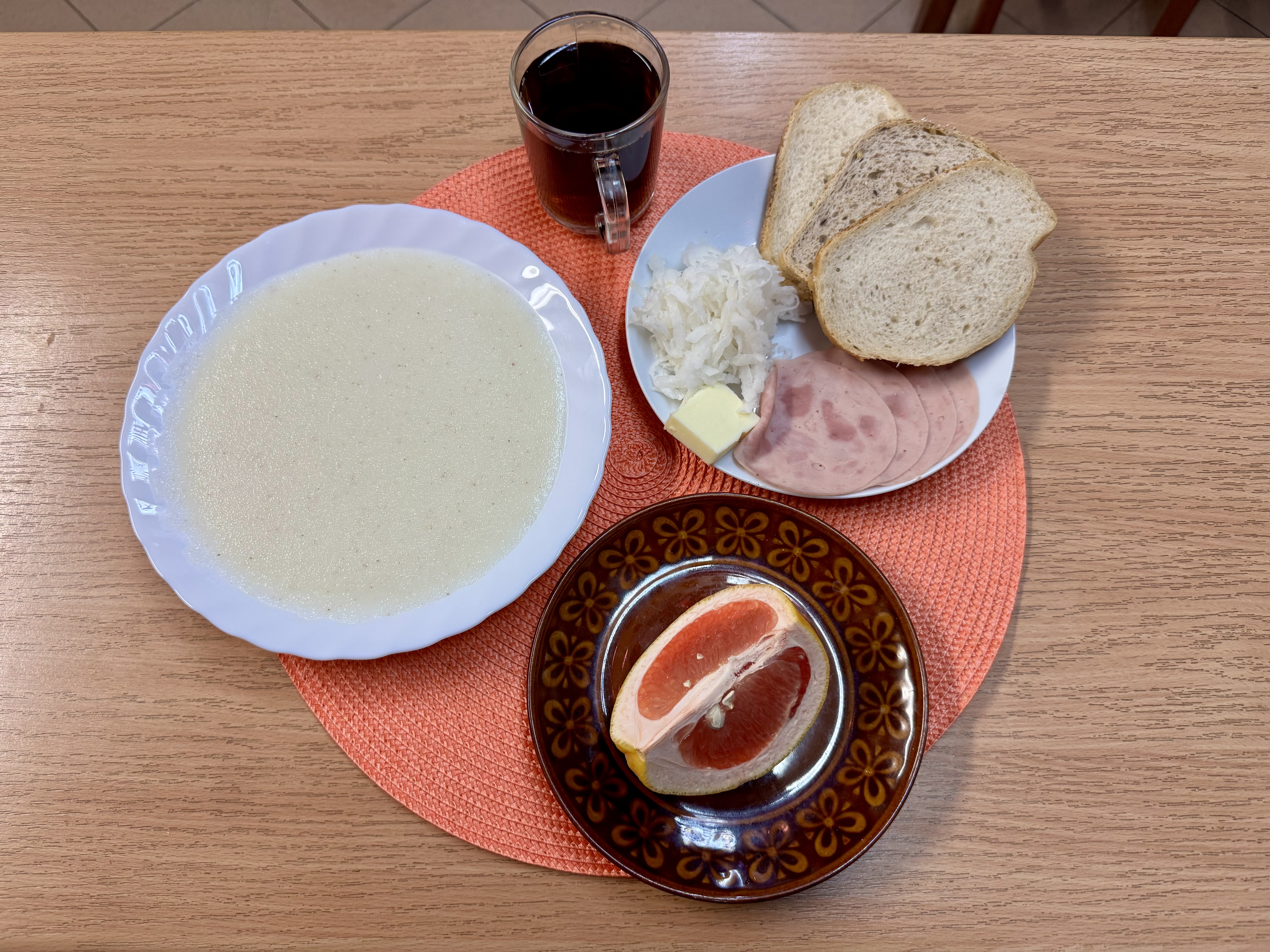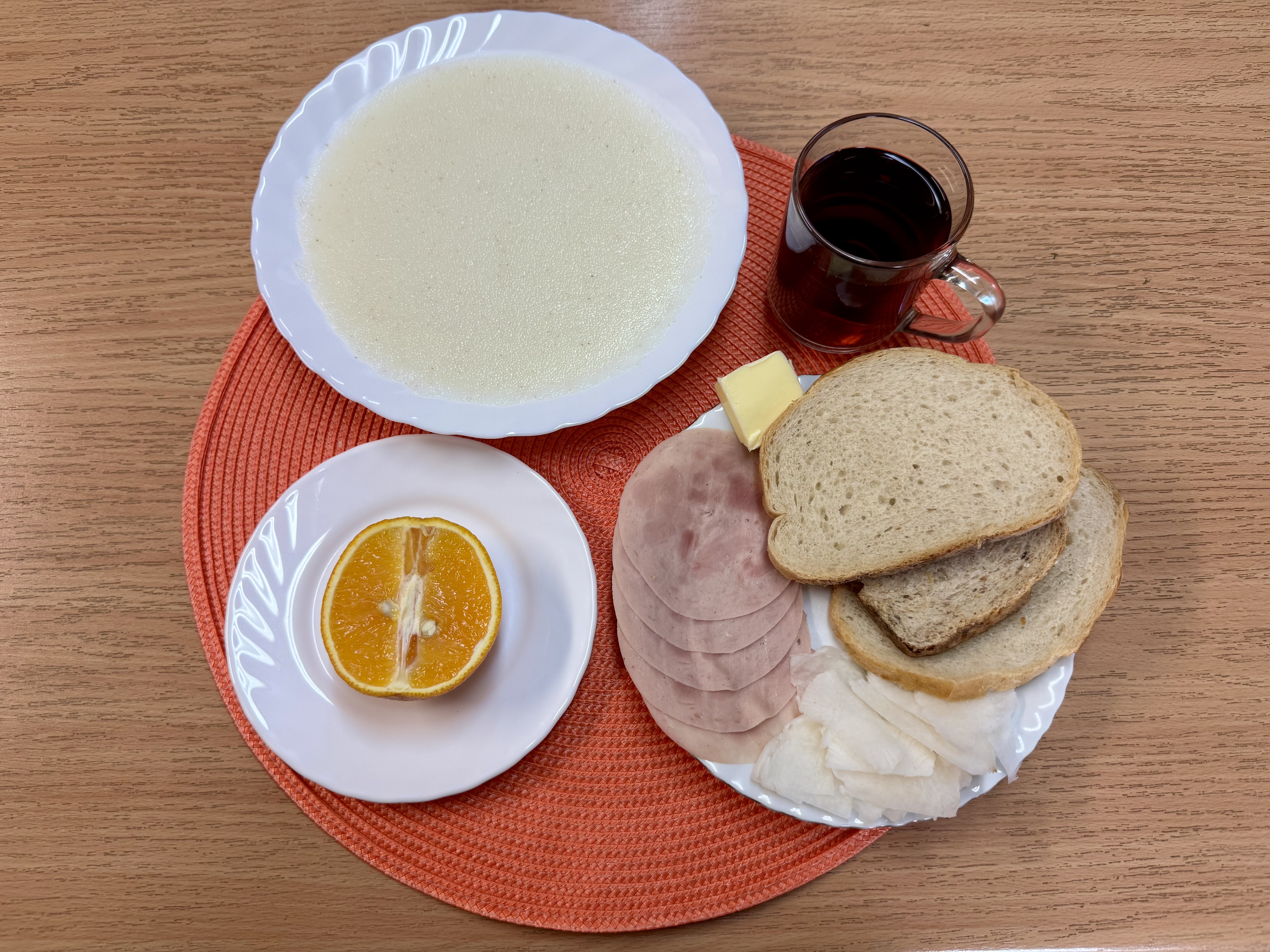 | Zupa ml. z kaszą manną 300ml (GLU, MLE) Herbata z cukrem 250ml Chleb zwykły 100g (GLU, SOJ) Chleb razowy 30g (GLU) Masło 10g (MLE) Łopatka prasowana - wędlina 50g (SOJ, SEL) Papryka 90g Owoc 70g |