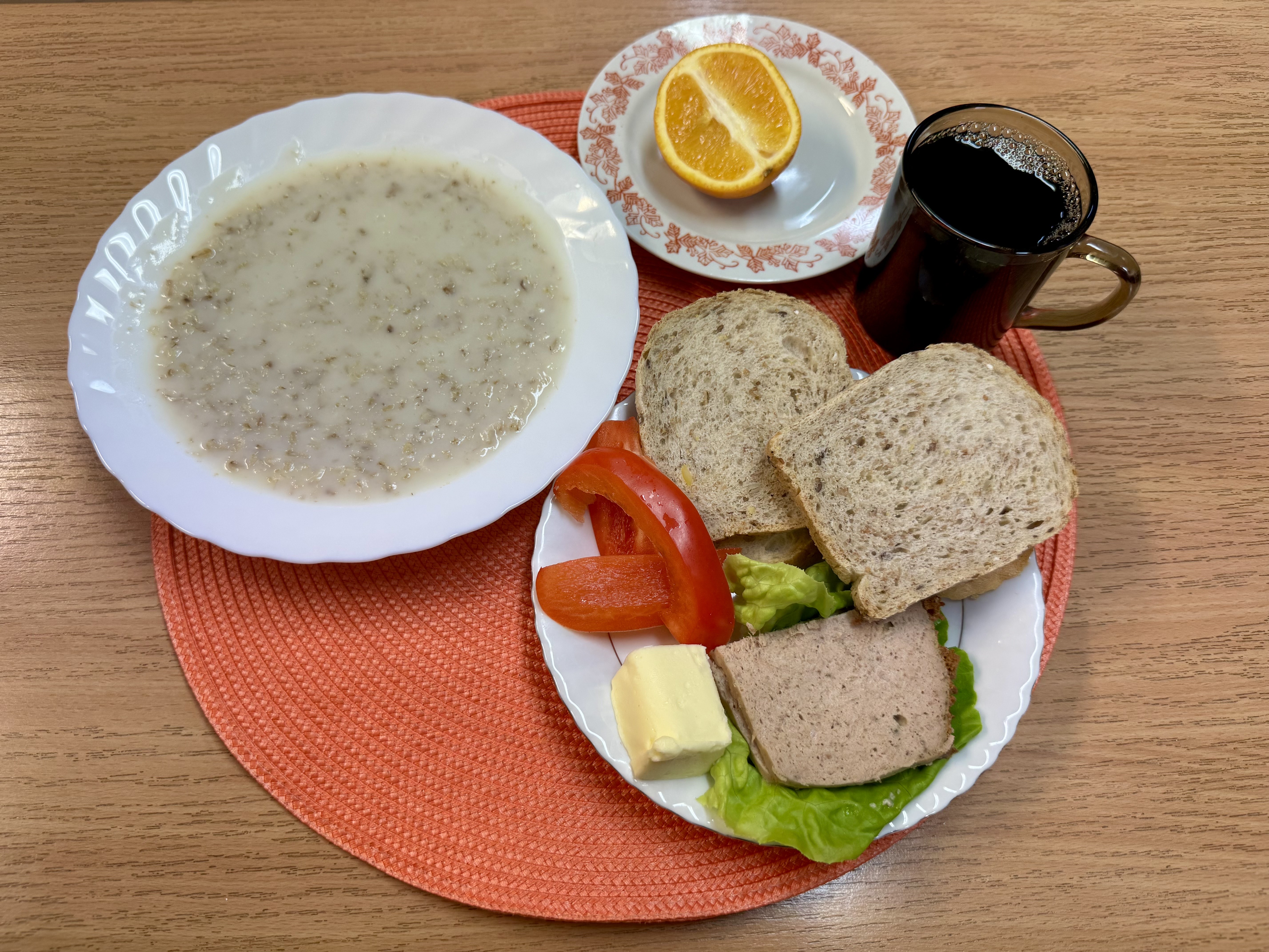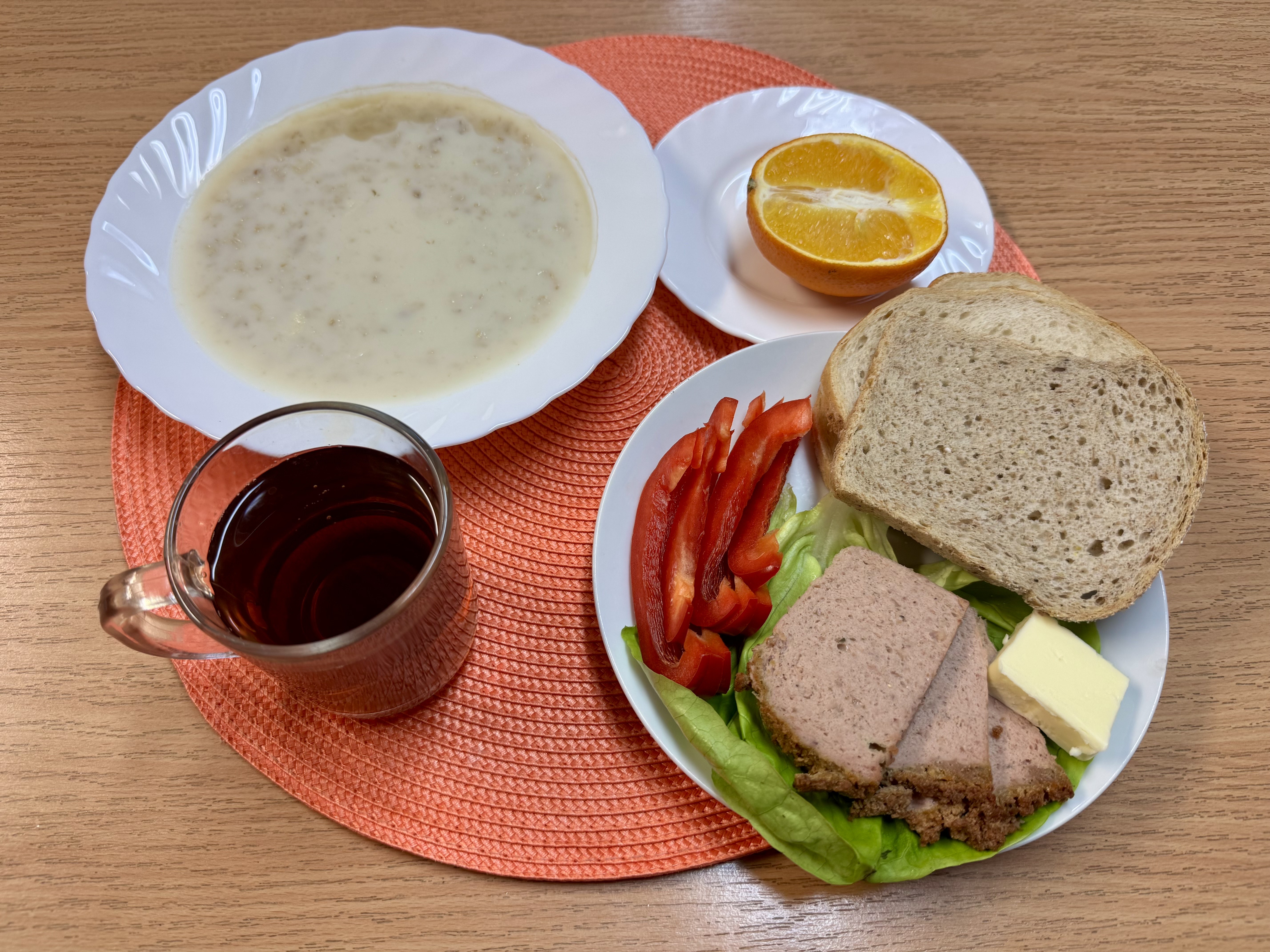 | Zupa ml. z płatkami owsianymi 300ml (GLU, MLE) Herbata z cukrem 250ml Chleb razowy 100 g (GLU) Masło 10g (MLE) Pasztet pieczony drobiowy 50g Papryka świeża 80g Sałata masłowa 20g Owoc 70g |