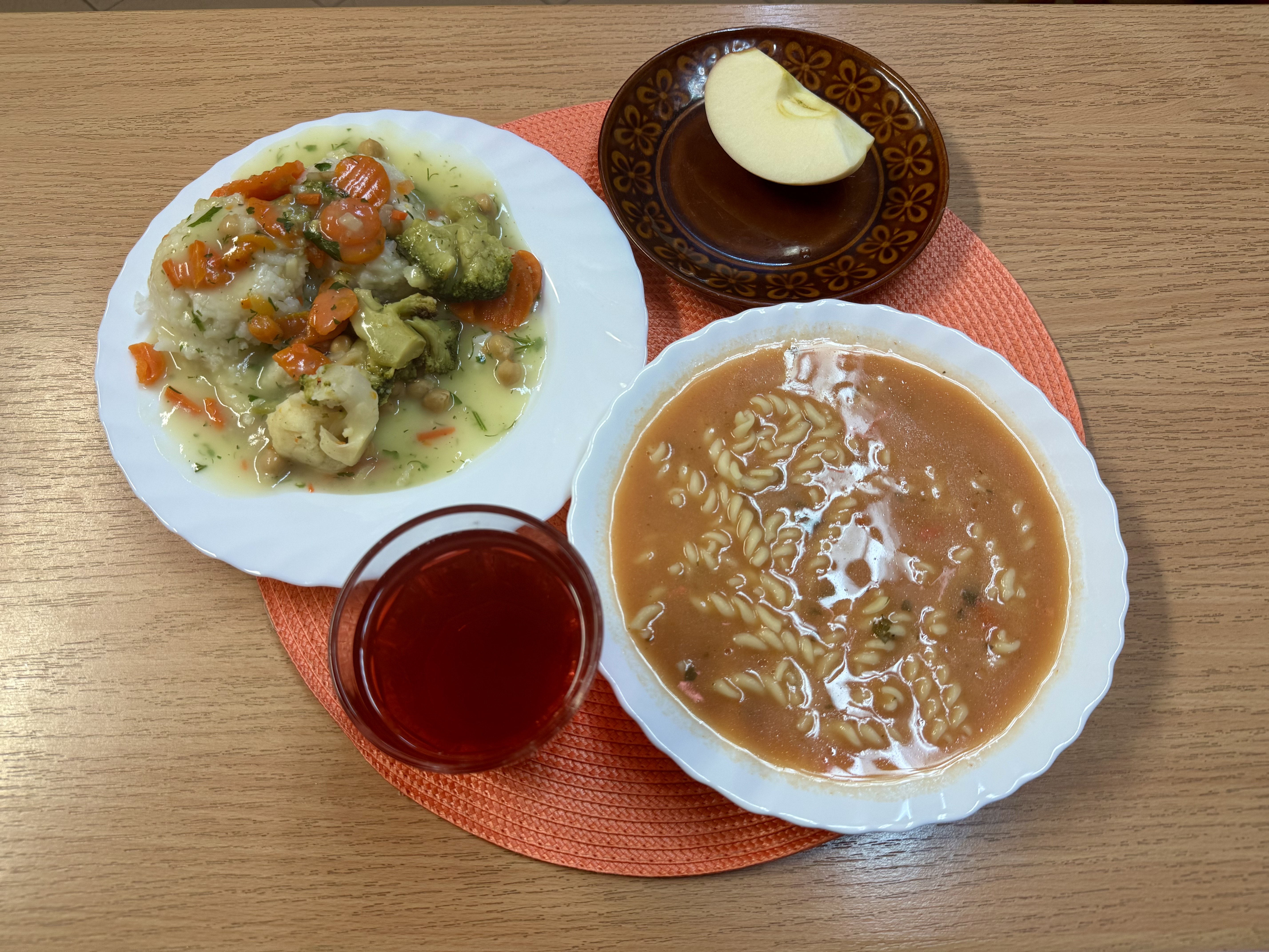 | Zupa pomidorowa z makaronem 300ml Risotto z warzywami i ciecierzycą (WEGE) 300g (GLU) Jabłko 150g Kompot owocowy b/c 250ml |