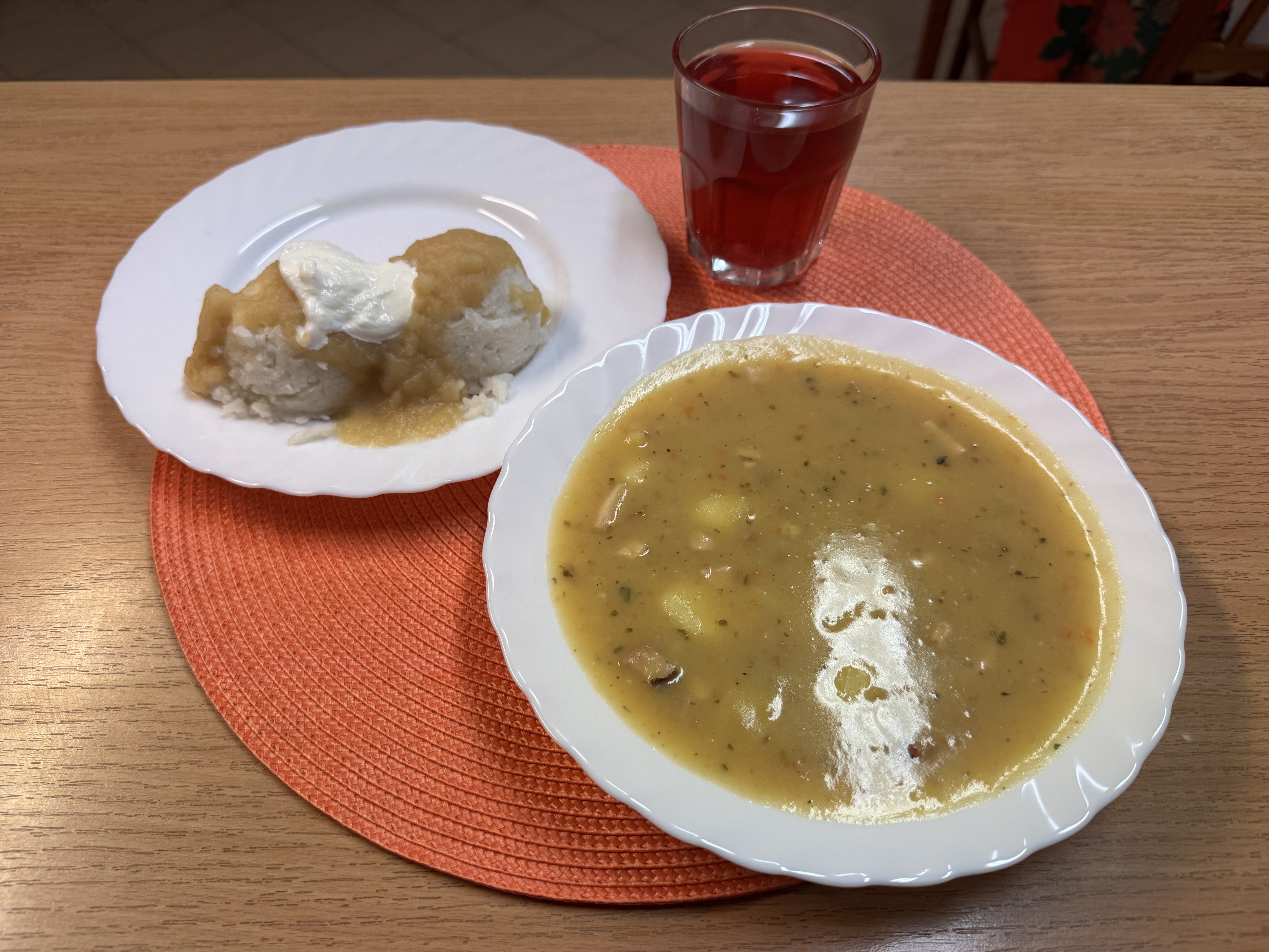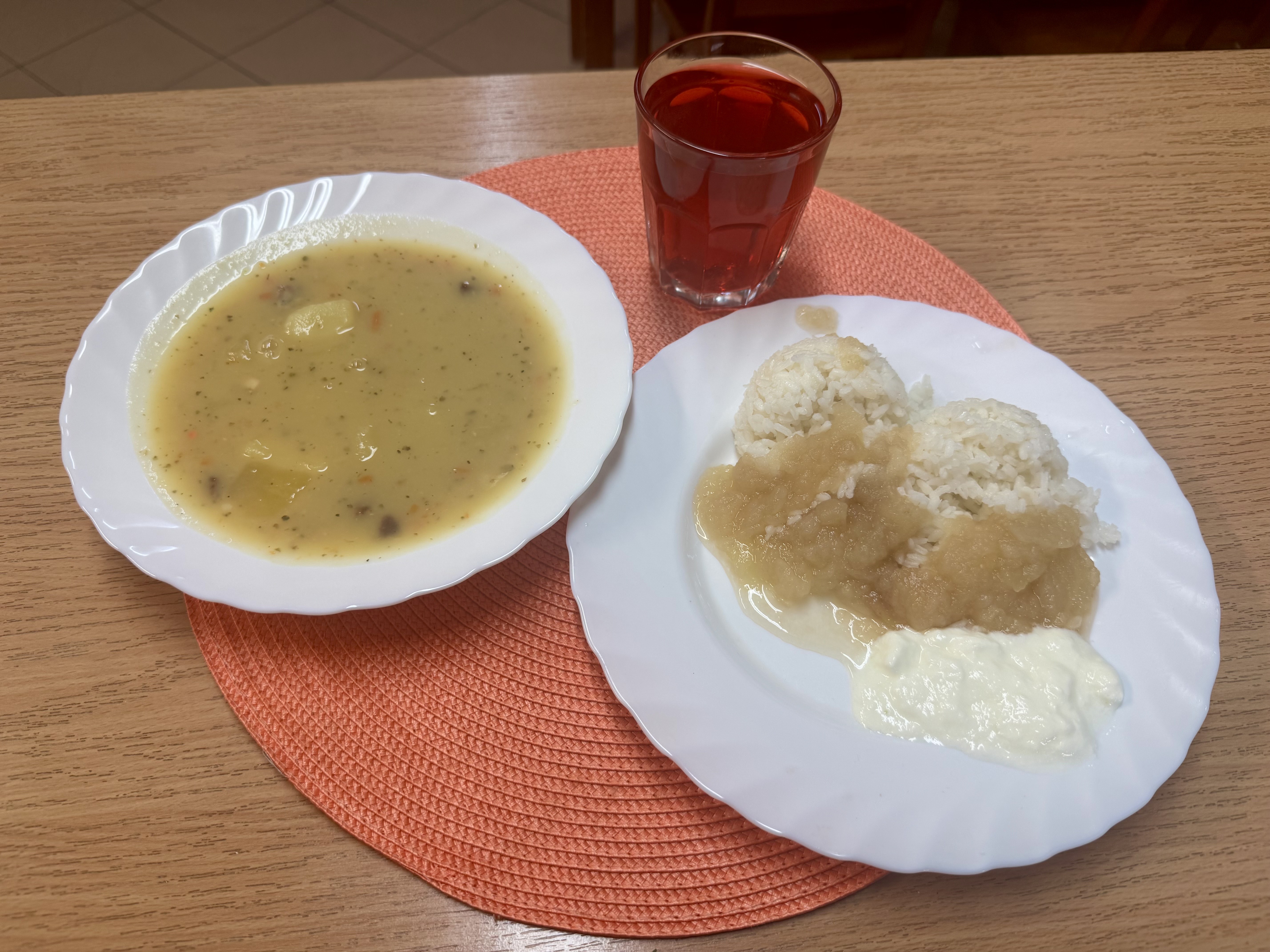 | Zupa grochówka z ziemniakami 300ml Ryż z jabłkiem i cynamonem 300g Jogurt naturalny 50g (MLE) Kompot owocowy 250ml |