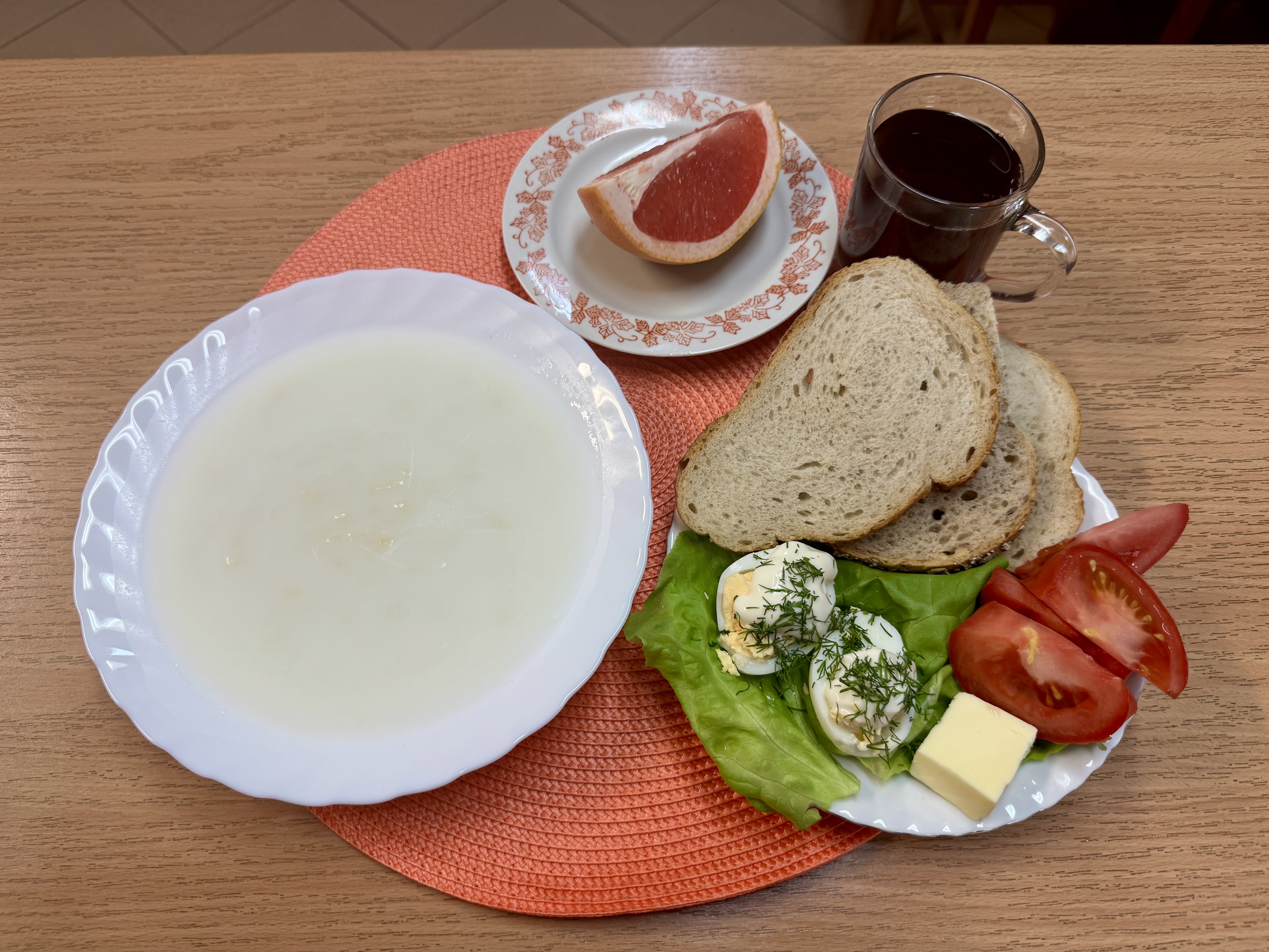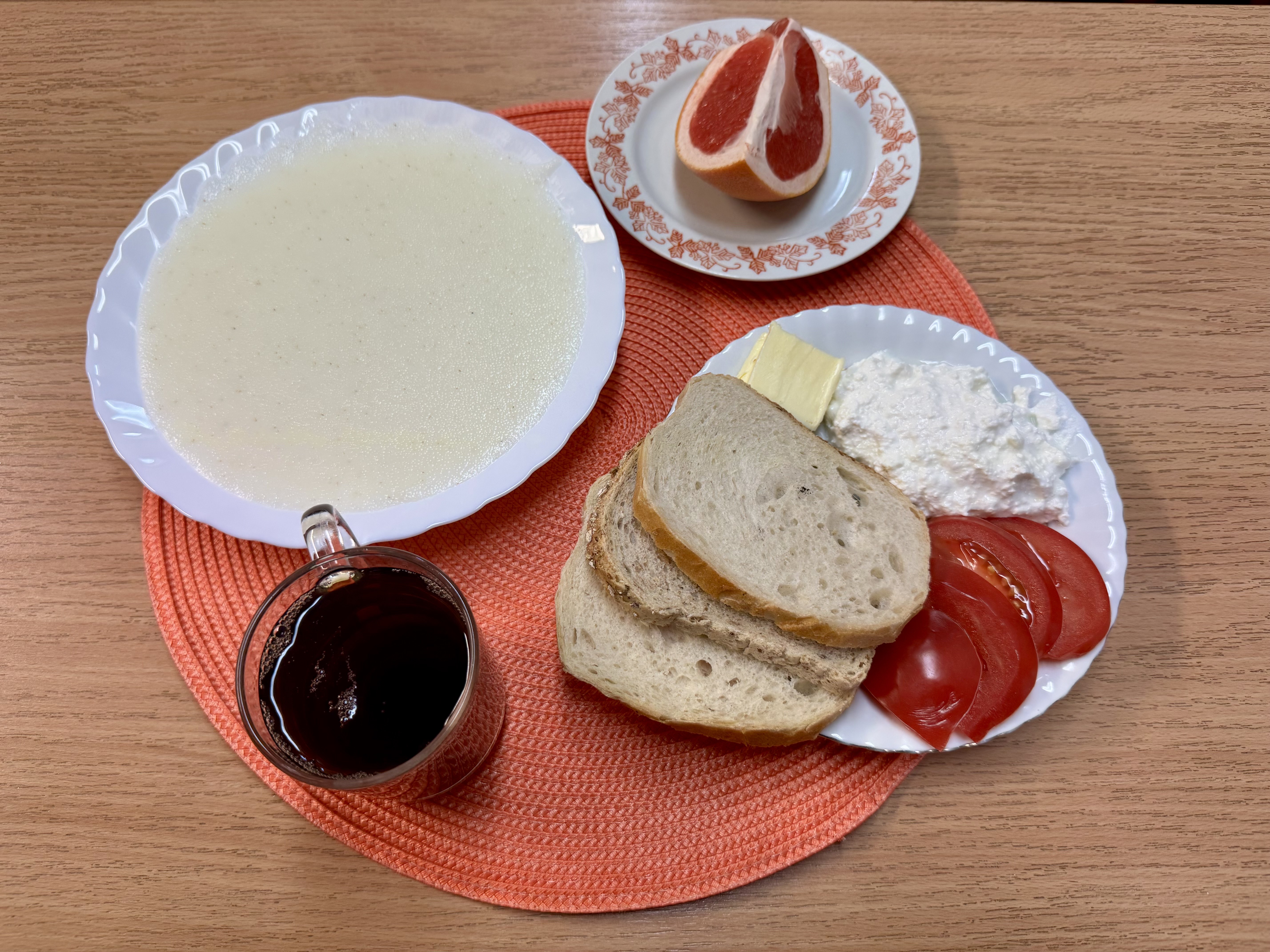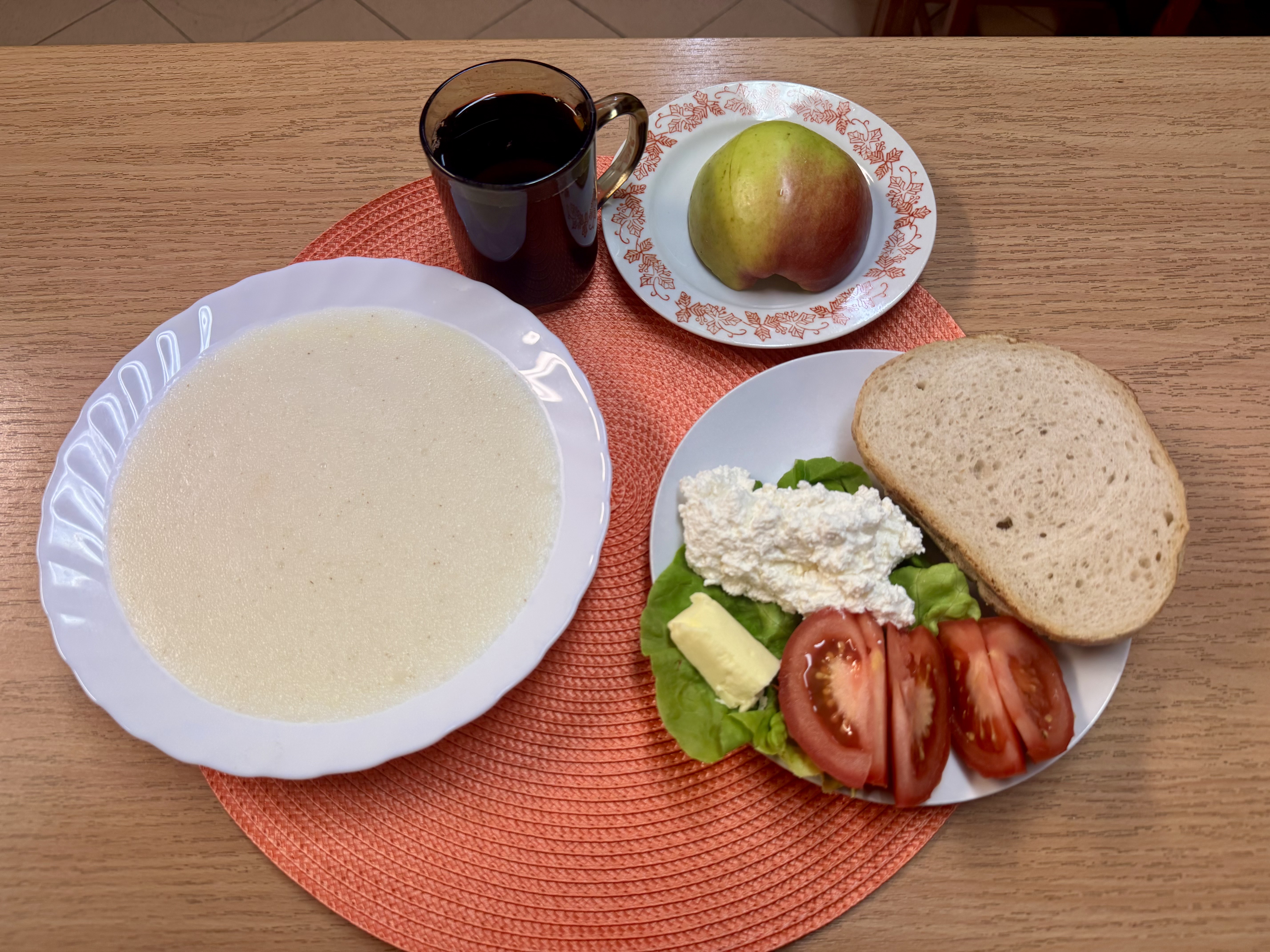 | Zupa ml. z kaszą manną 300ml (GLU, MLE) Herbata z cukrem 250ml Chleb zwykły 100g (GLU, SOJ, JAJ) Chleb razowy 30g (GLU, SOJ) Masło 10g (MLE) Pasta twarogowa 60g (MLE) Owoc 70g Pomidor 90g |