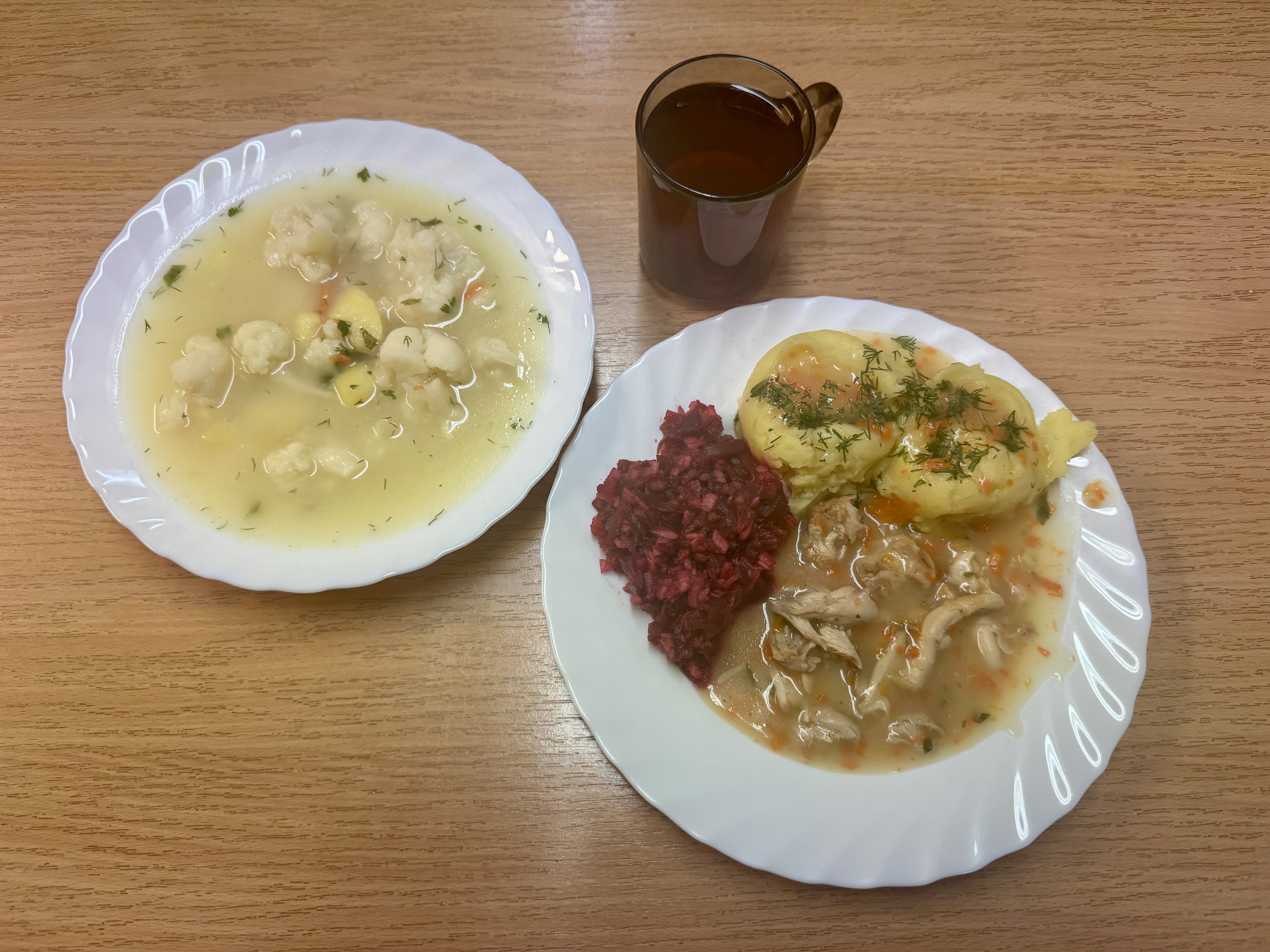 | Zupa kalafiorowa z ziemniakami 300 ml (MLE) Gulasz drobiowy 150g (GLU) Ziemniaki 200g Sałatka z buraków i jabłka z olejem 140g Kompot owocowy 250ml |
