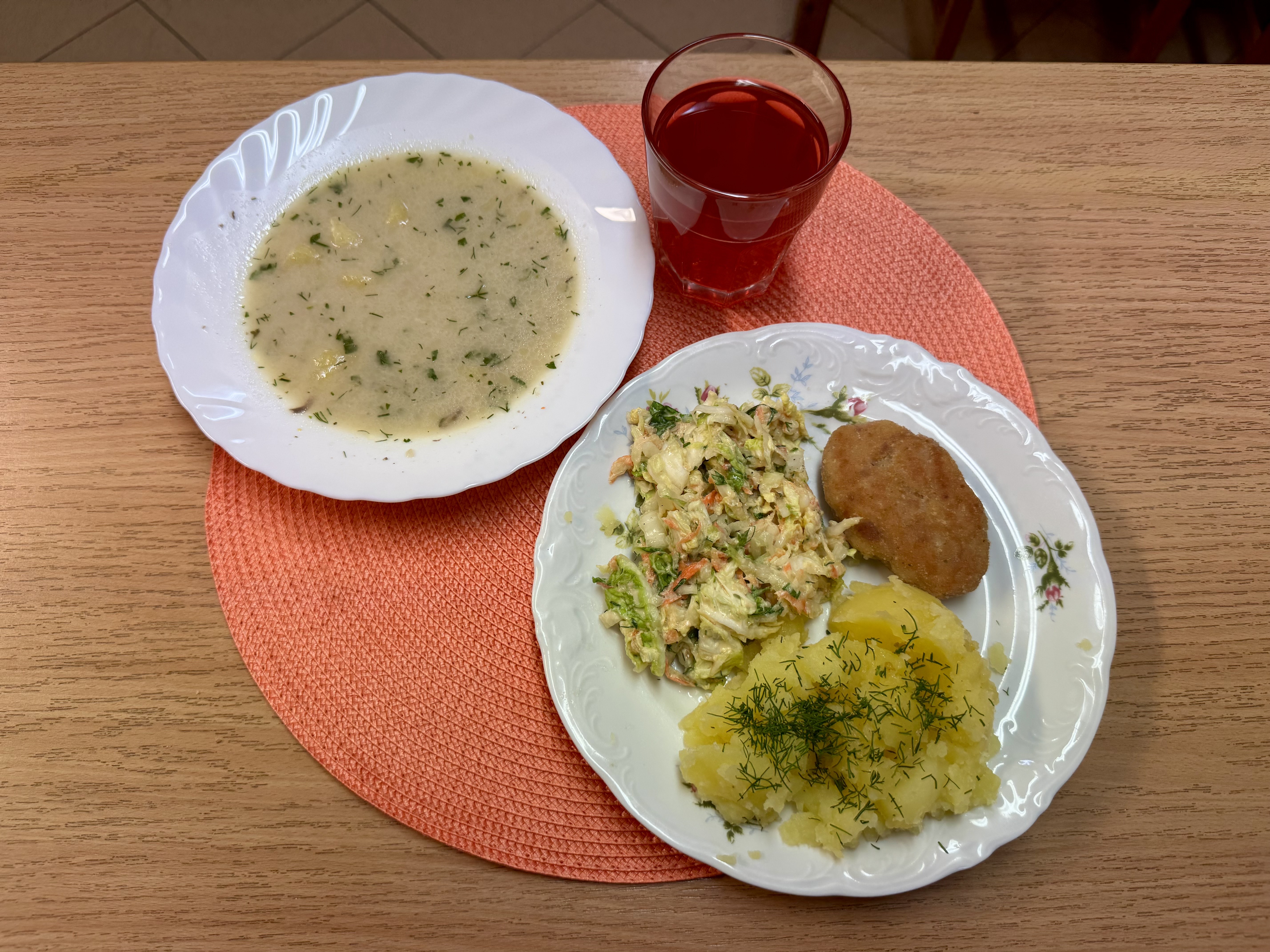 | Zupa pieczarkowa z ziemniakami 300ml (MLE) Pulpet drobiowy gotowany na parze (GLU, JAJ) Ziemniaki 200g (S02) Surówka z kapusty pekińskiej z marchewką i olejem 140g Kompot owocowy b/c 250ml |