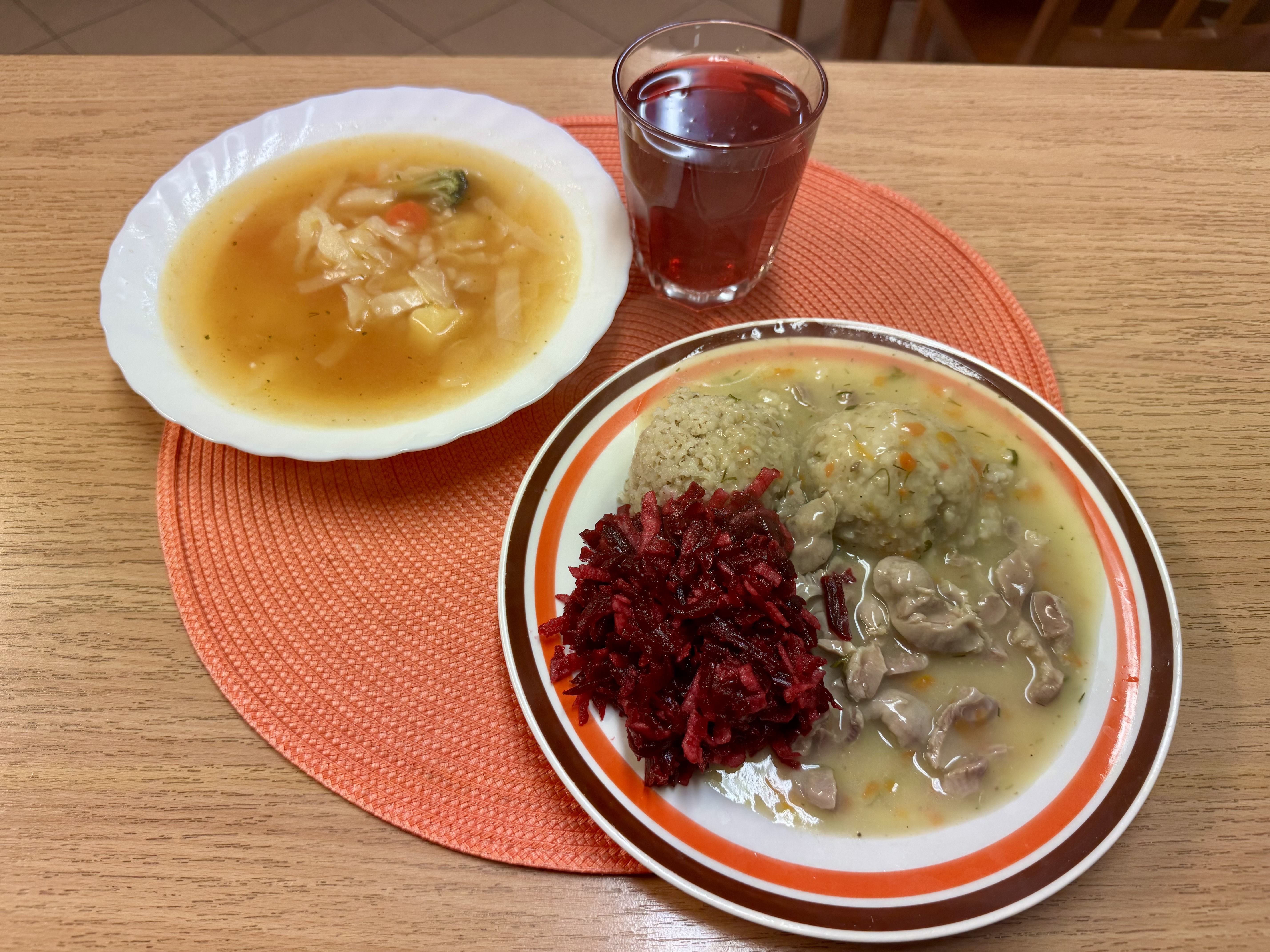 | Zupa pejzanka z ziemniakami 300ml (MLE) Gulasz z żołądków drobiowych duszony b/mąki 150g (GLU) Kasza jęczmienna 200g (GLU) Surówka z buraczków i jabłka z olejem 140g Kompot owocowy b/c 250ml |