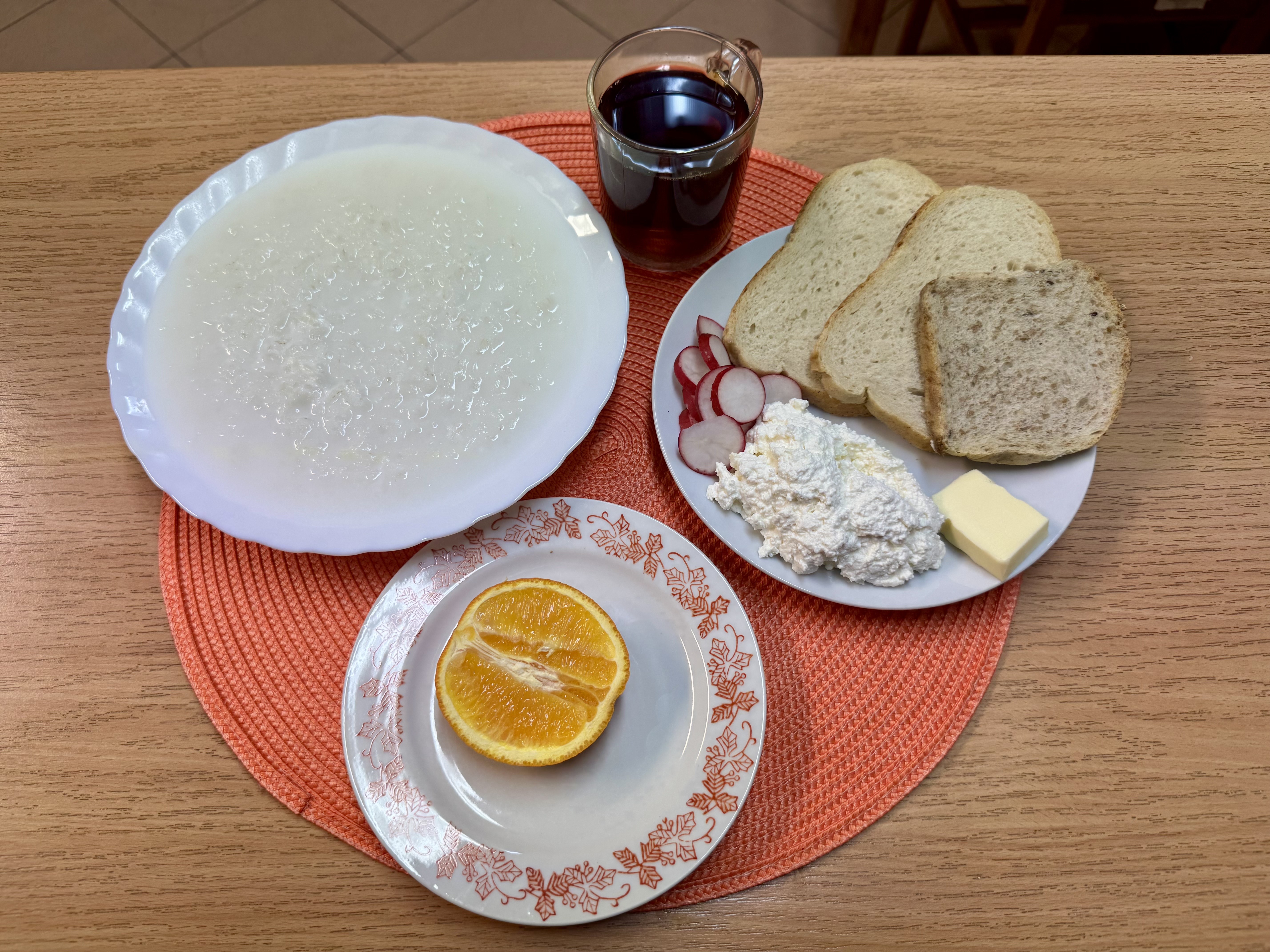 | Zupa ml. z ryżem 300ml (MLE) Herbata z cukrem 250ml Chleb zwykły 100g (GLU, SOJ) Chleb razowy 30g (GLU) Masło 10g (MLE) Twaróg 50g (MLE) Rzodkiewka 90g Owoc 70g |