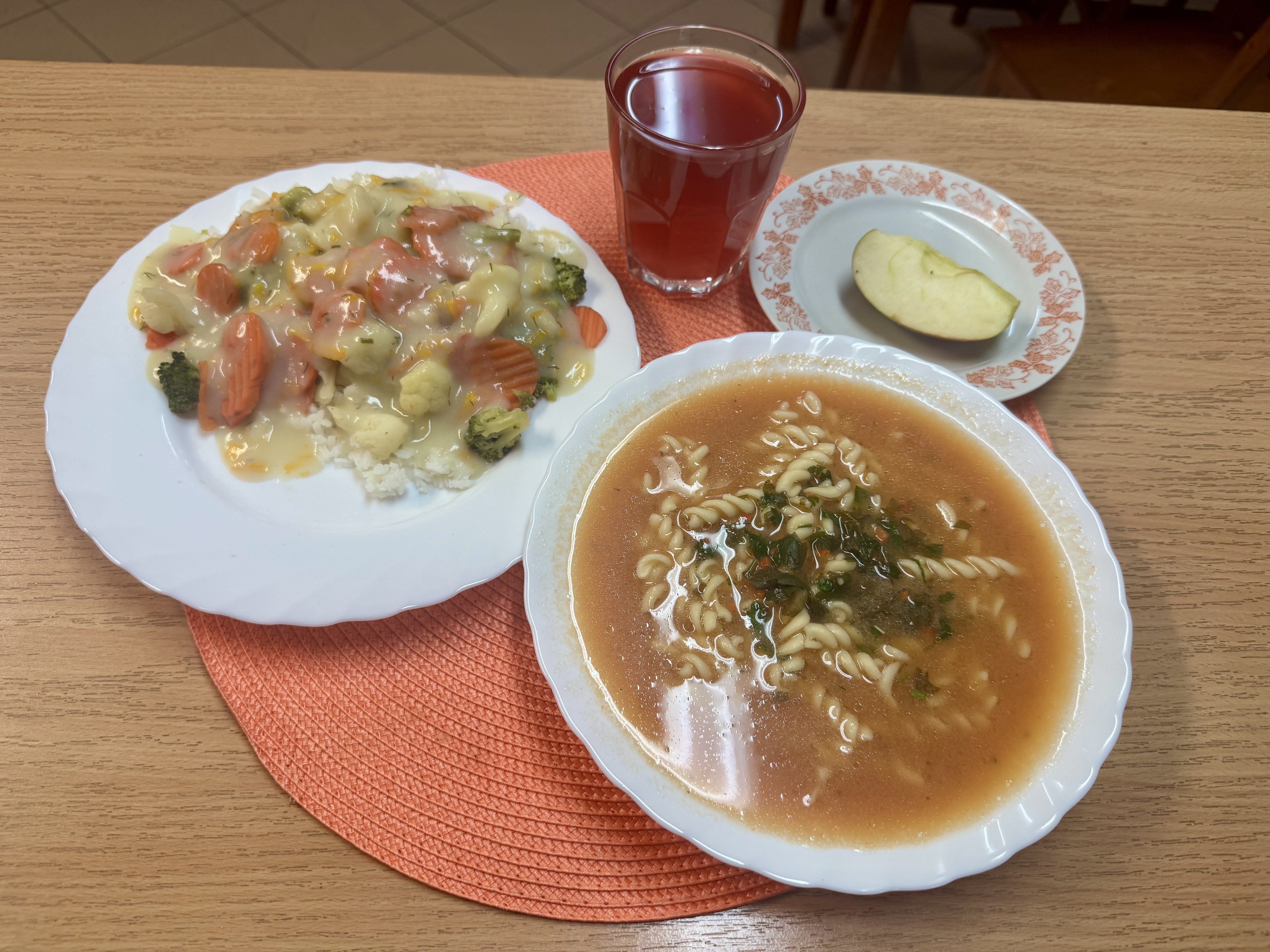 | Zupa pomidorowa z makaronem 300ml Risotto z warzywami 300g (GLU) Jabłko 150g Kompot owocowy 250ml |