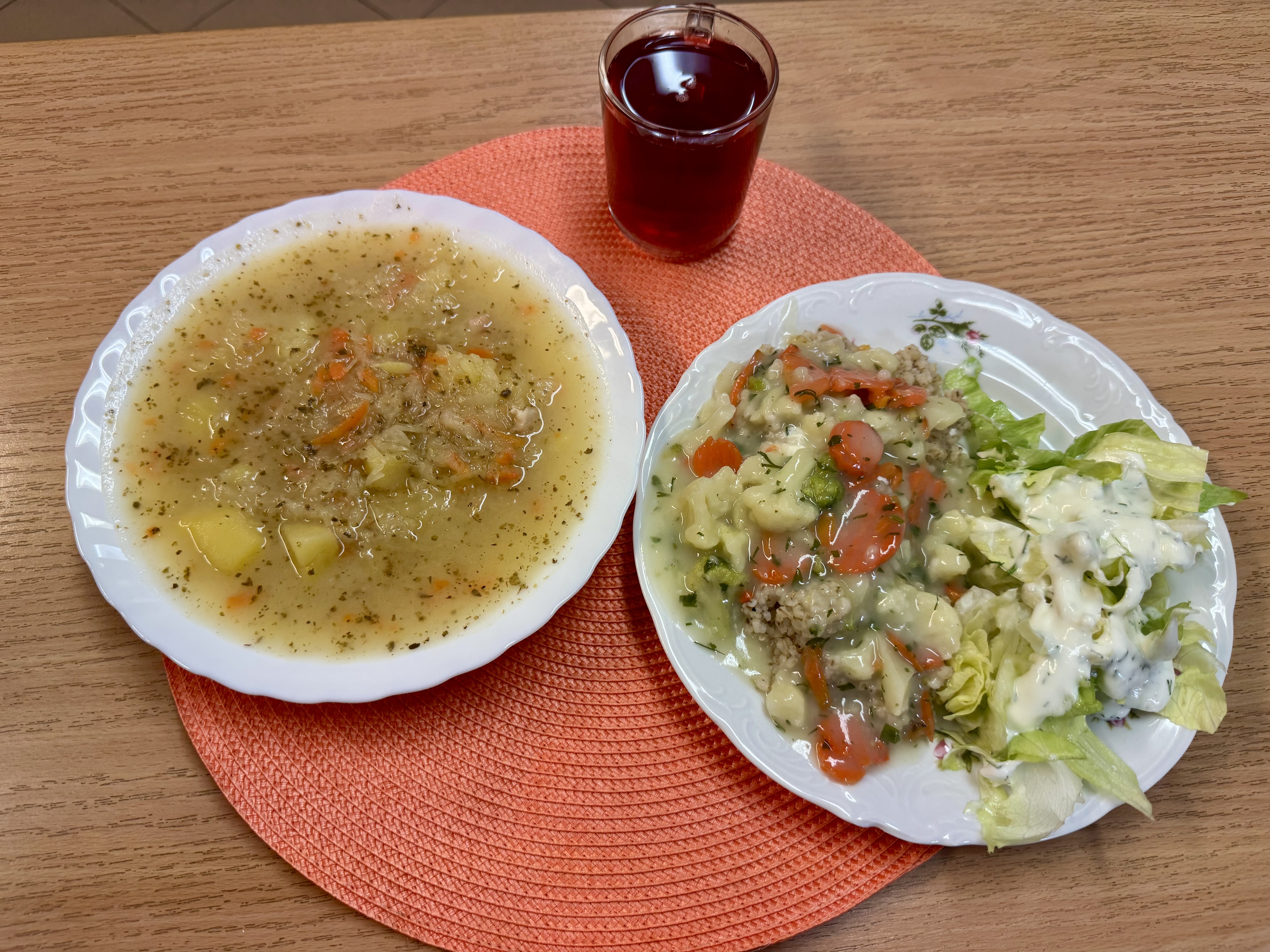 | Zupa kapuśniak z ziemniakami 300ml Kaszotto z warzywami (WEGE) 300g (GLU) Sałata z jogurtem 100g (MLE) Kompot owocowy 250ml |