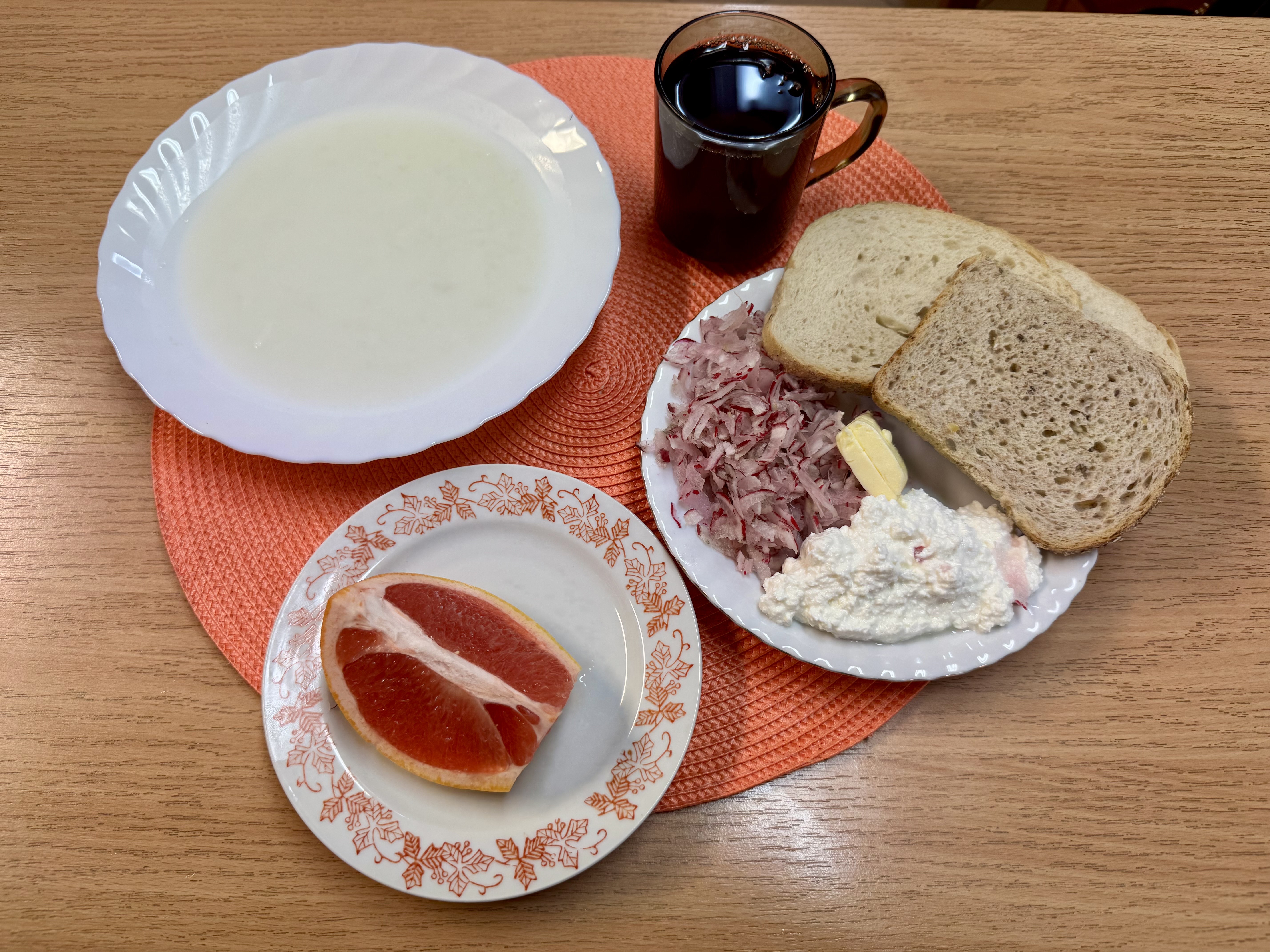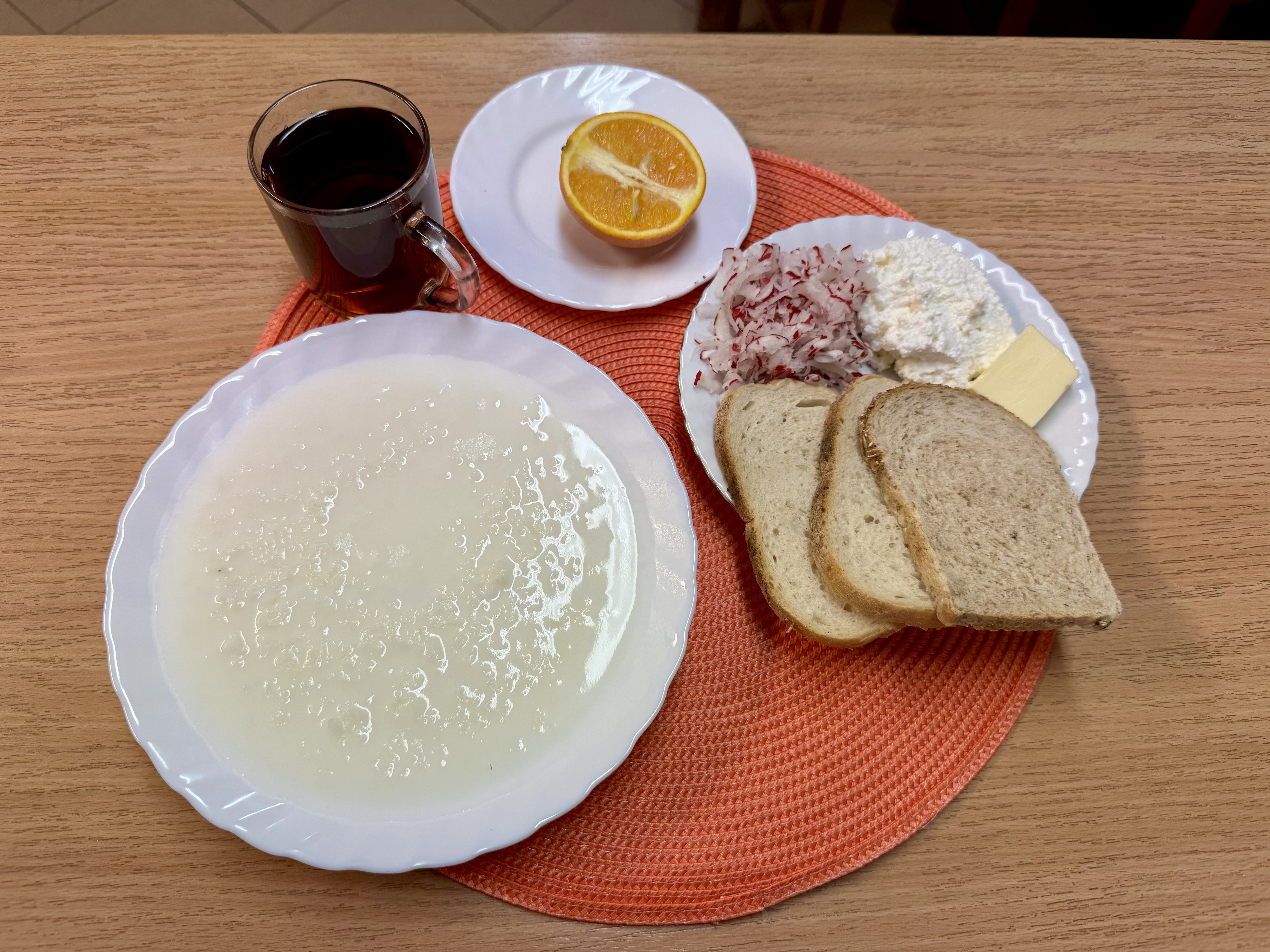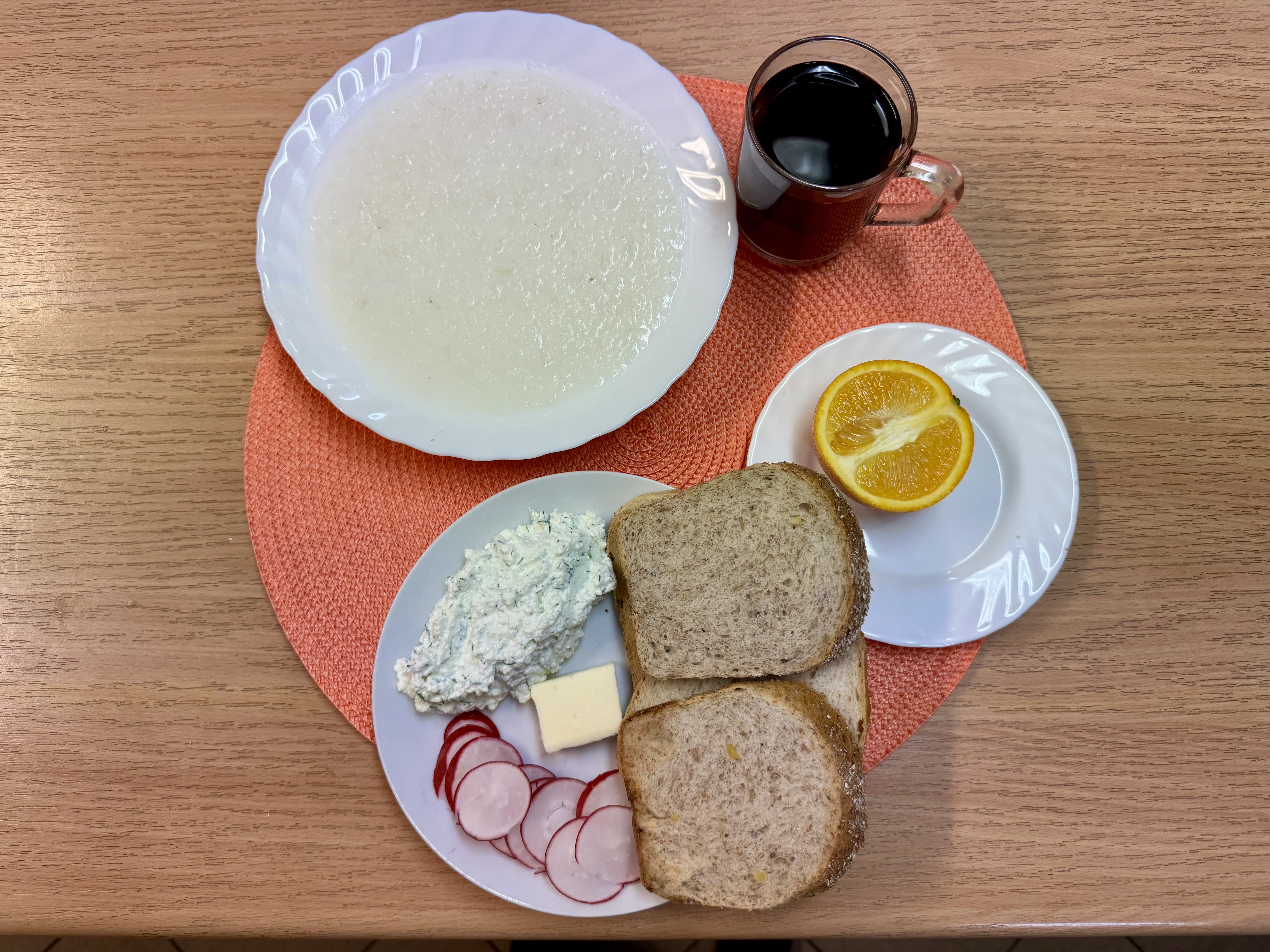 | Zupa ml. z ryżem 300ml (MLE) Herbata z cukrem 250ml Chleb zwykły 100g (GLU, SOJ) Chleb razowy 30g (GLU) Masło 10g (MLE) Twaróg 50g (MLE) Rzodkiewka 90g Owoc 70g |