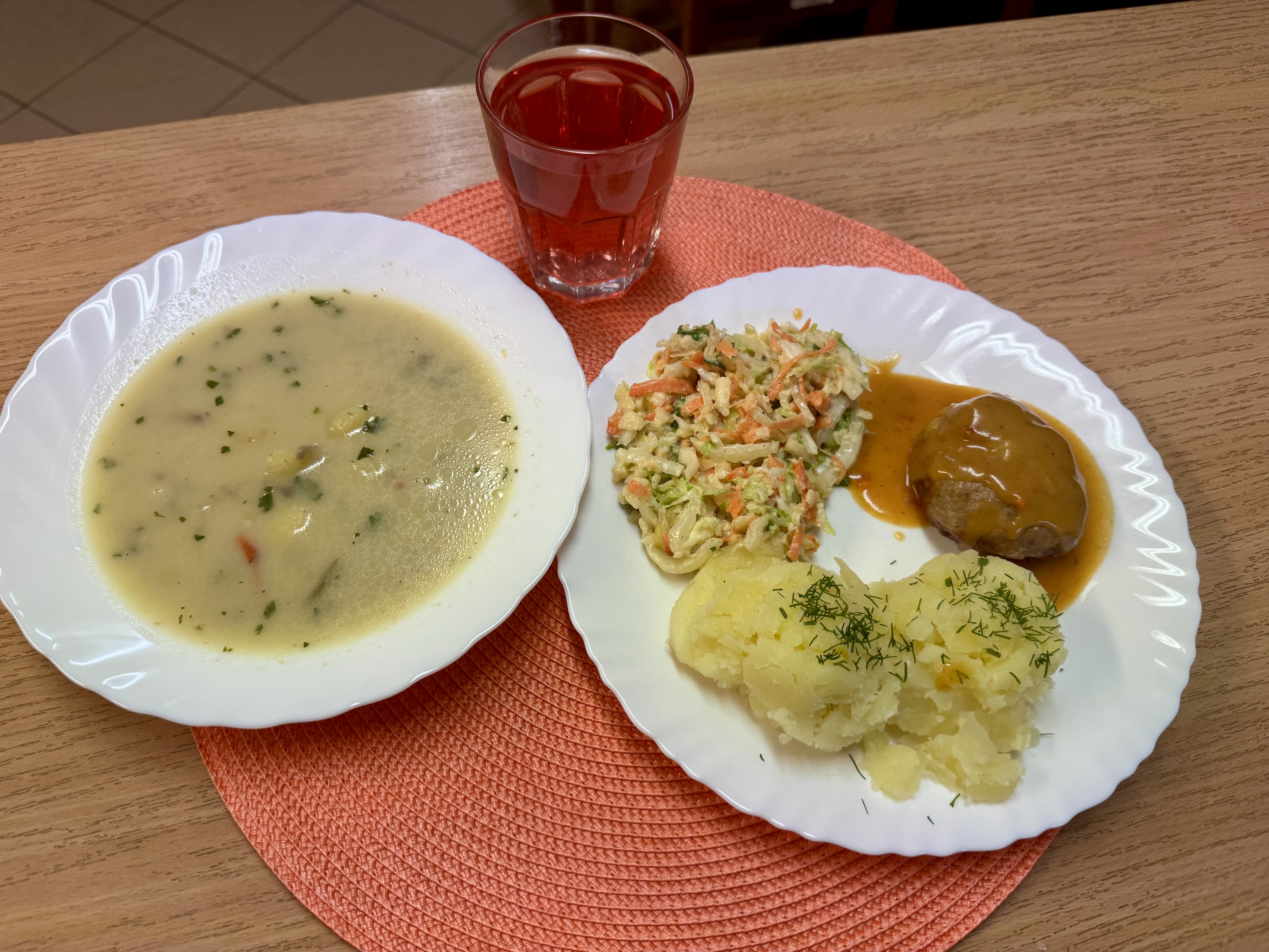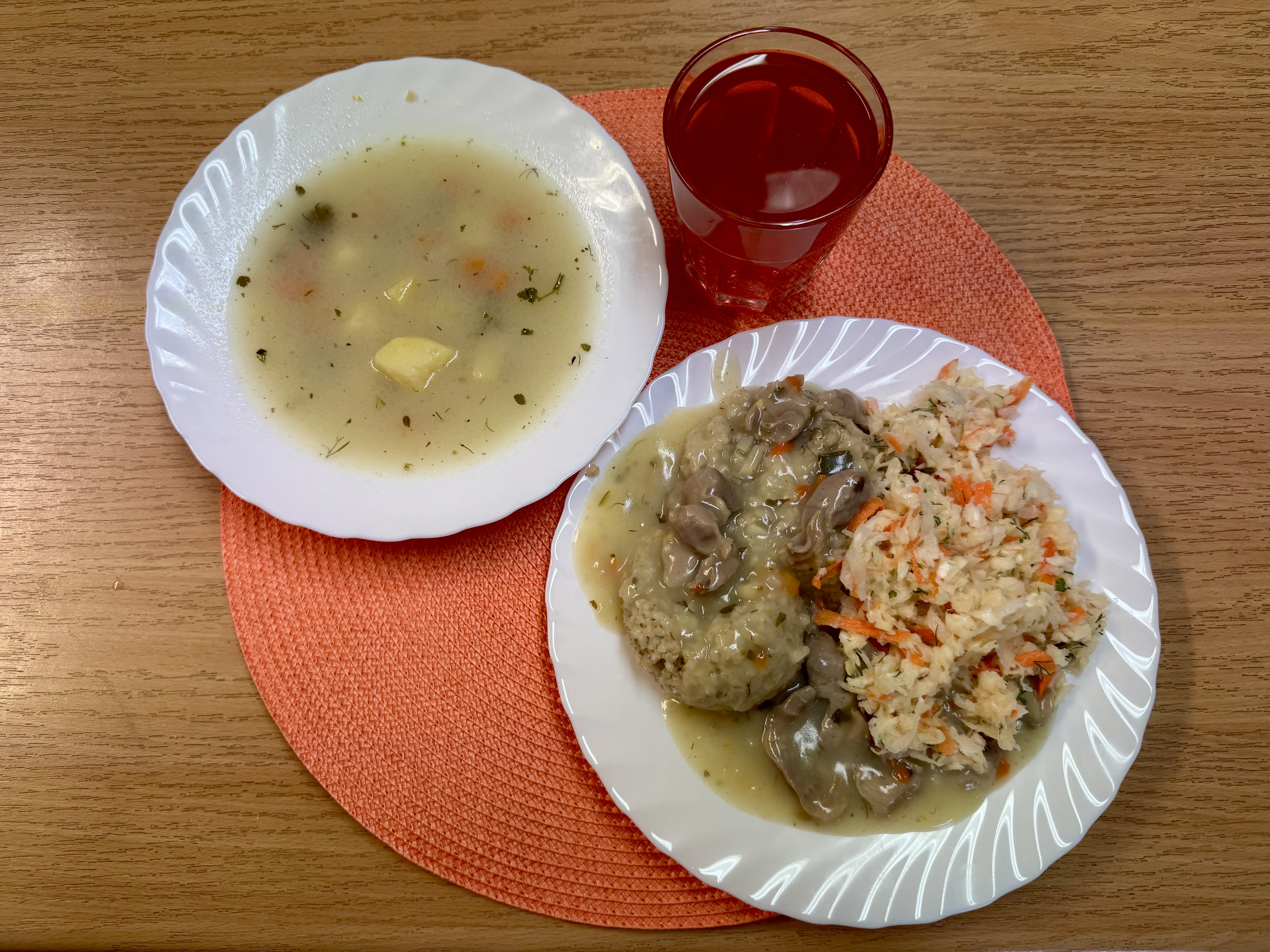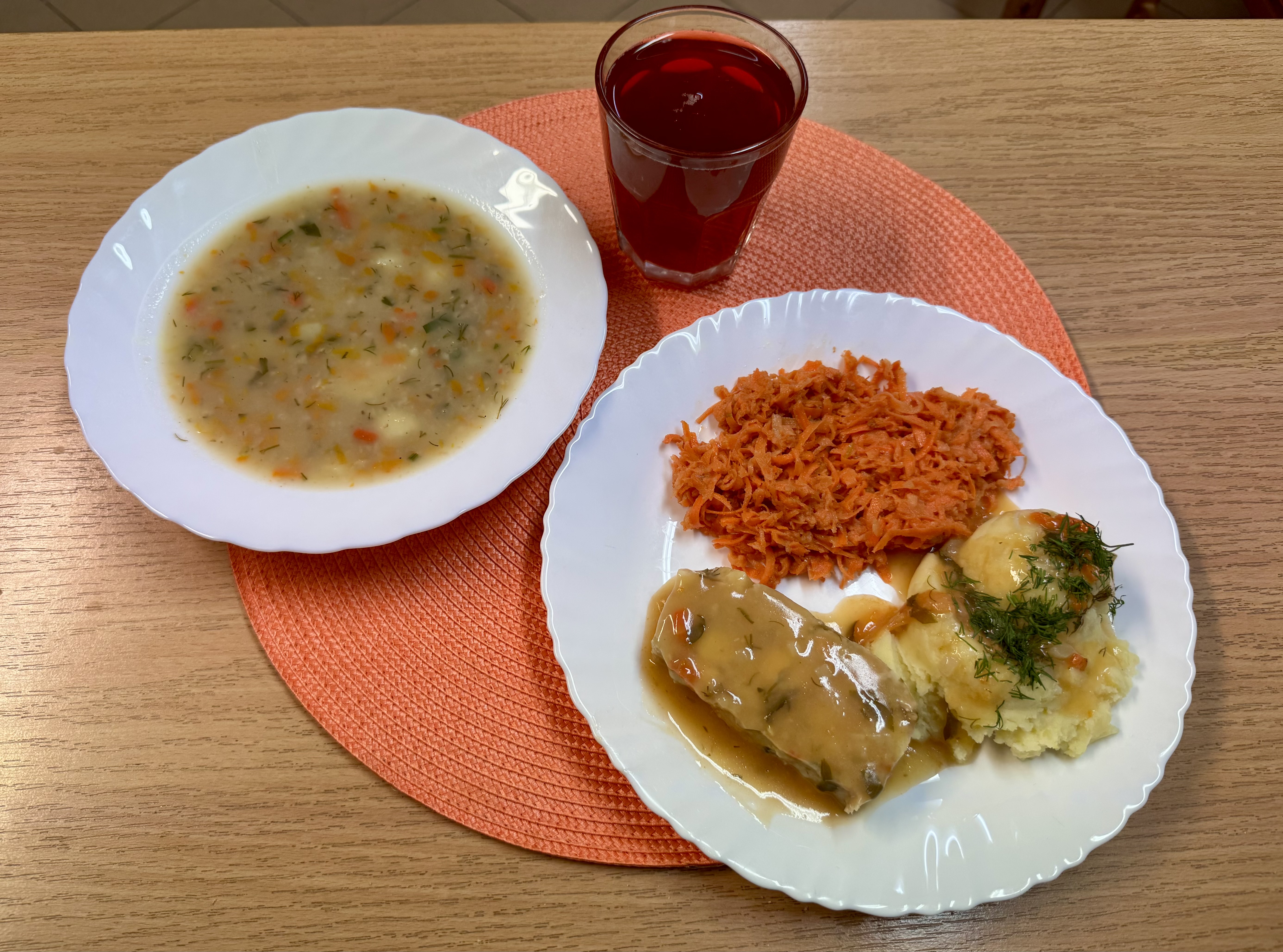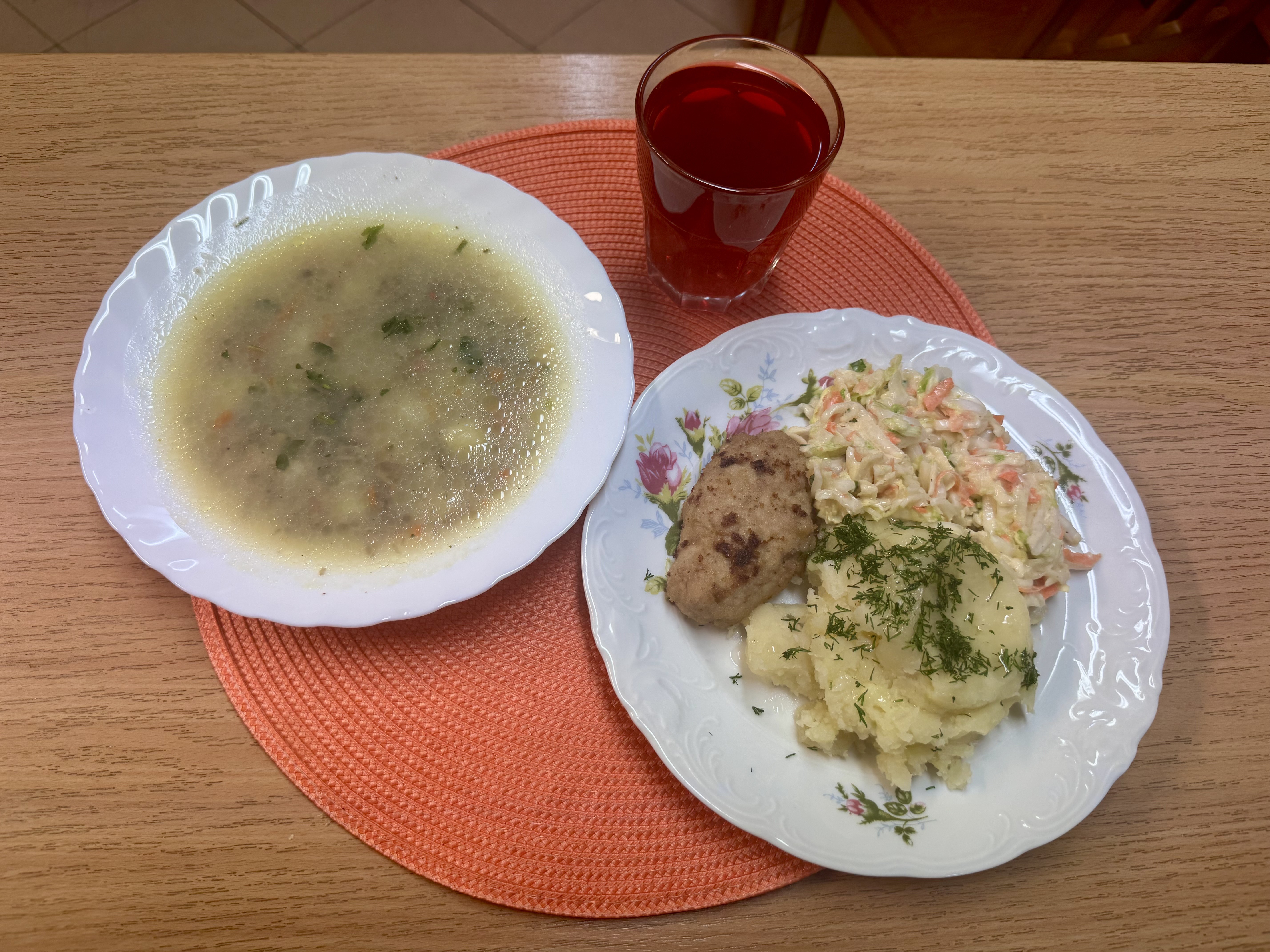 | Krupnik z kaszy jęczmiennej (GLU, MLE) Rolada drobiowa 90g Ziemniaki 200g Surówka z marchewki i jabłka z olejem 140g Kompot owocowy 250ml |