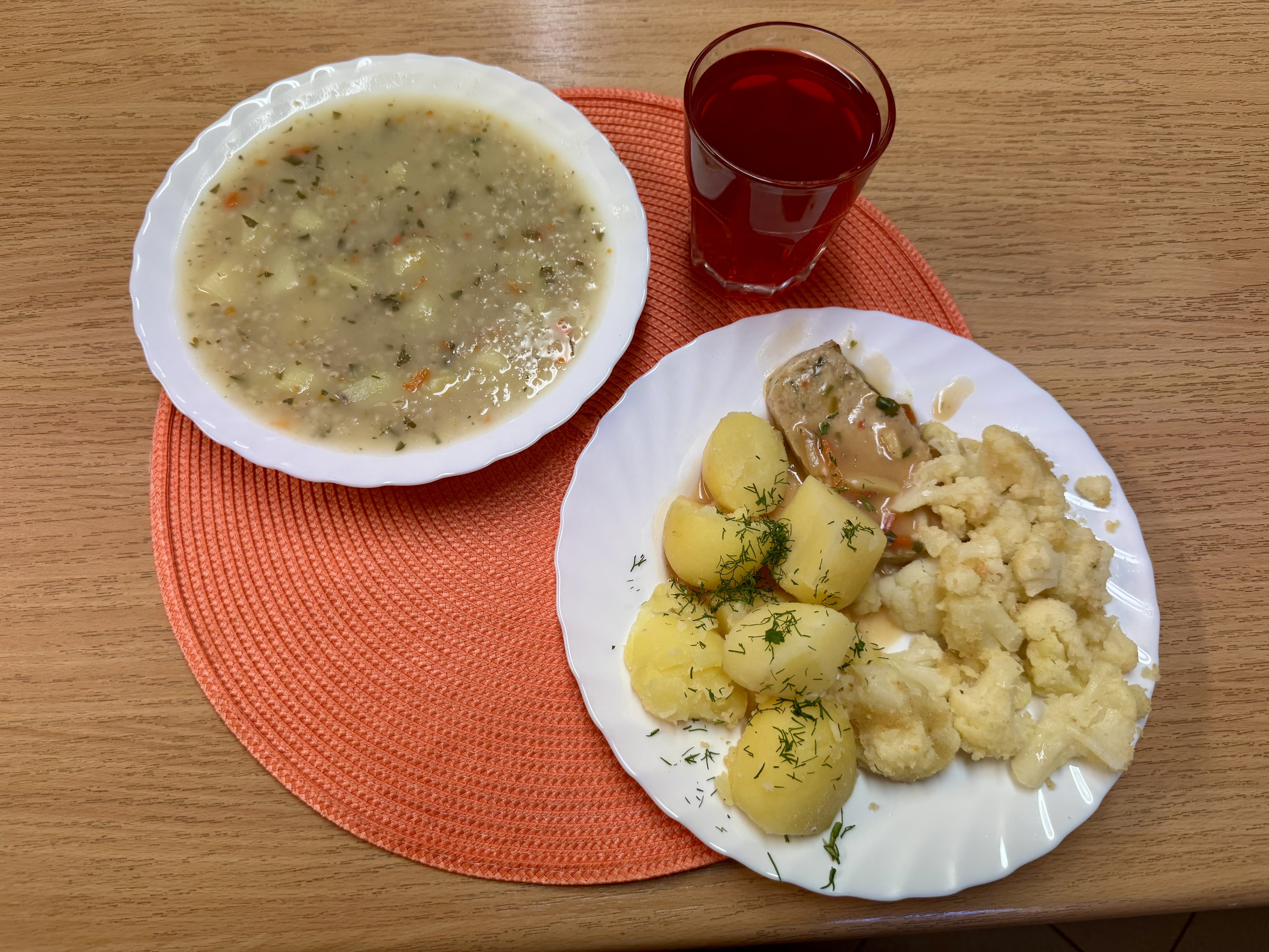 | Krupnik z kaszy jęczmiennej z ziemniakami (GLU, MLE) Rolada drobiowa mielona z marchewką i pietruszką gotowana na parze 90g Ziemniaki 200g Kalafior gotowany 140g Kompot owocowy 250ml |
