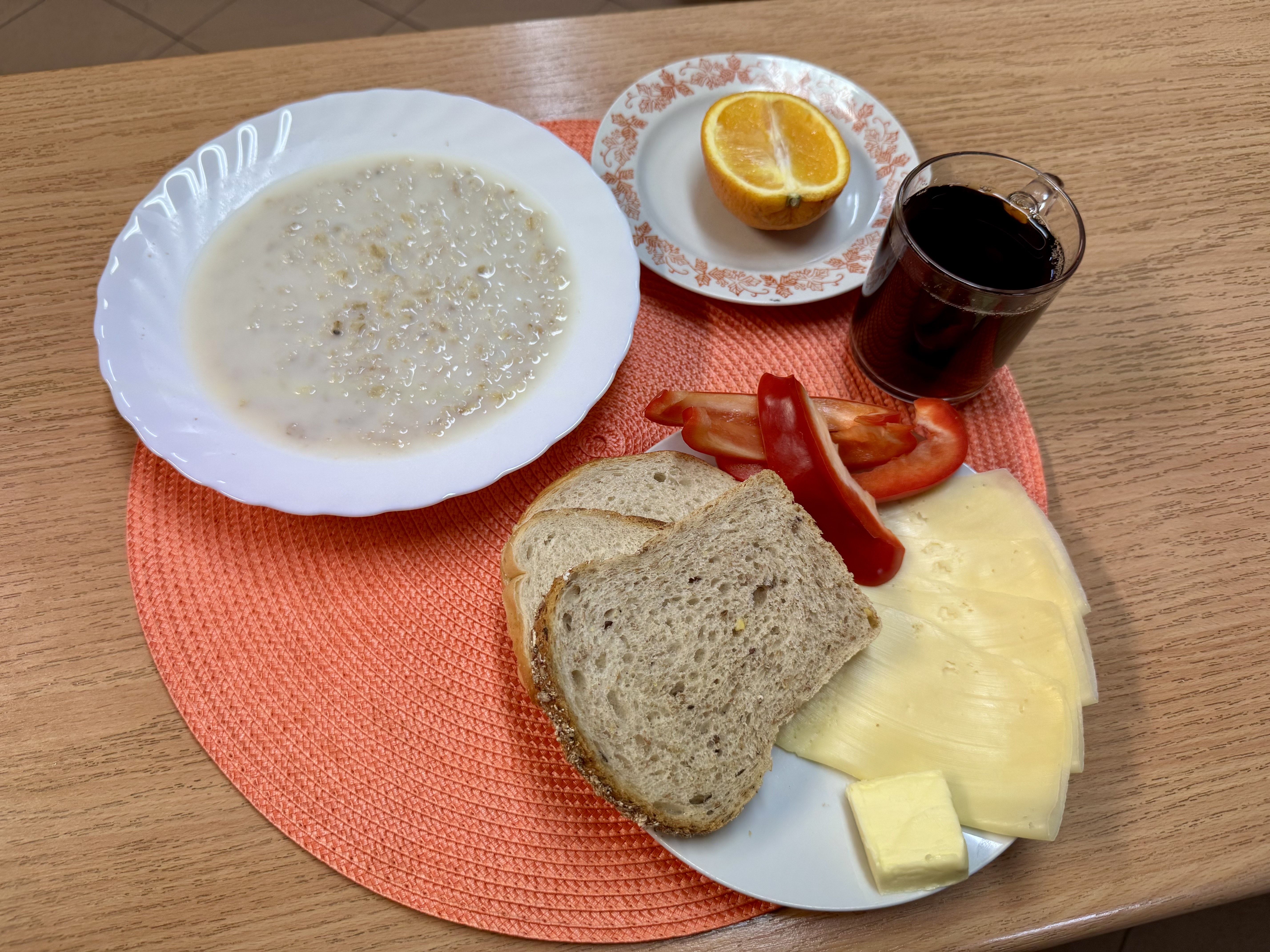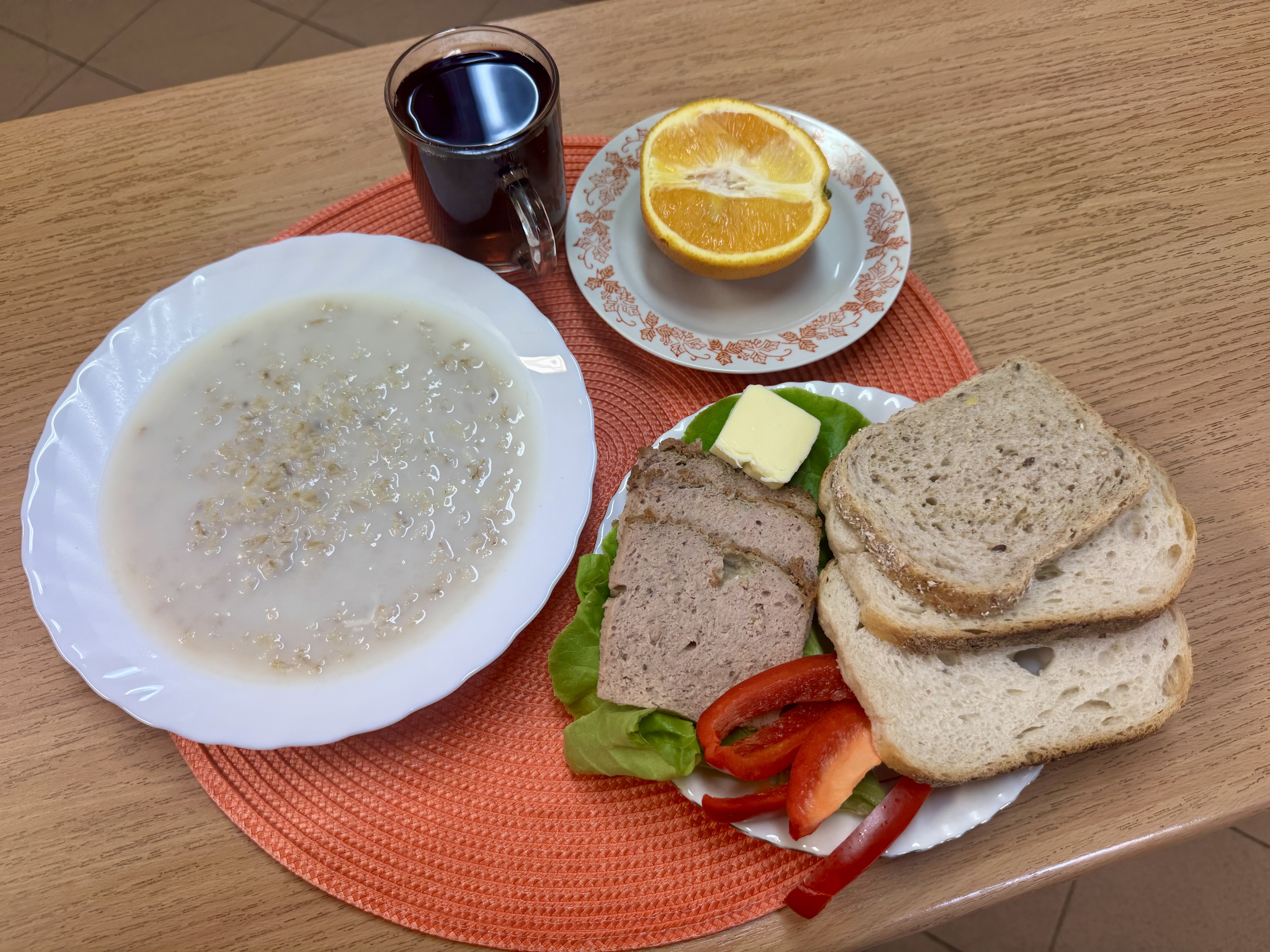 | Zupa ml. z płatkami owsianymi 300ml (GLU, MLE) Herbata z cukrem 250ml Chleb razowy 100 g (GLU) Masło 10g (MLE) Pasztet pieczony drobiowy 50g Papryka świeża 80g Sałata masłowa 20g Owoc 70g |