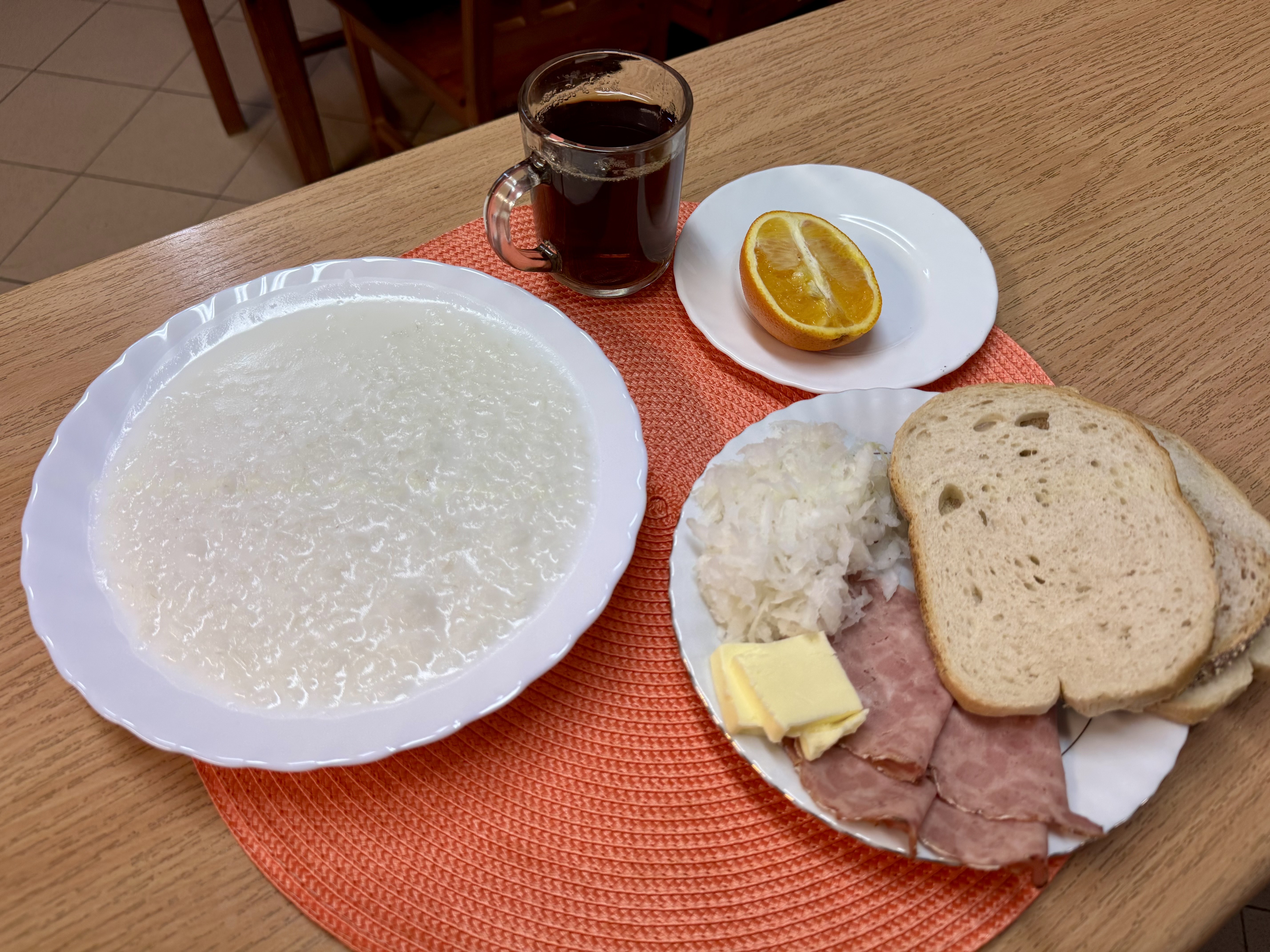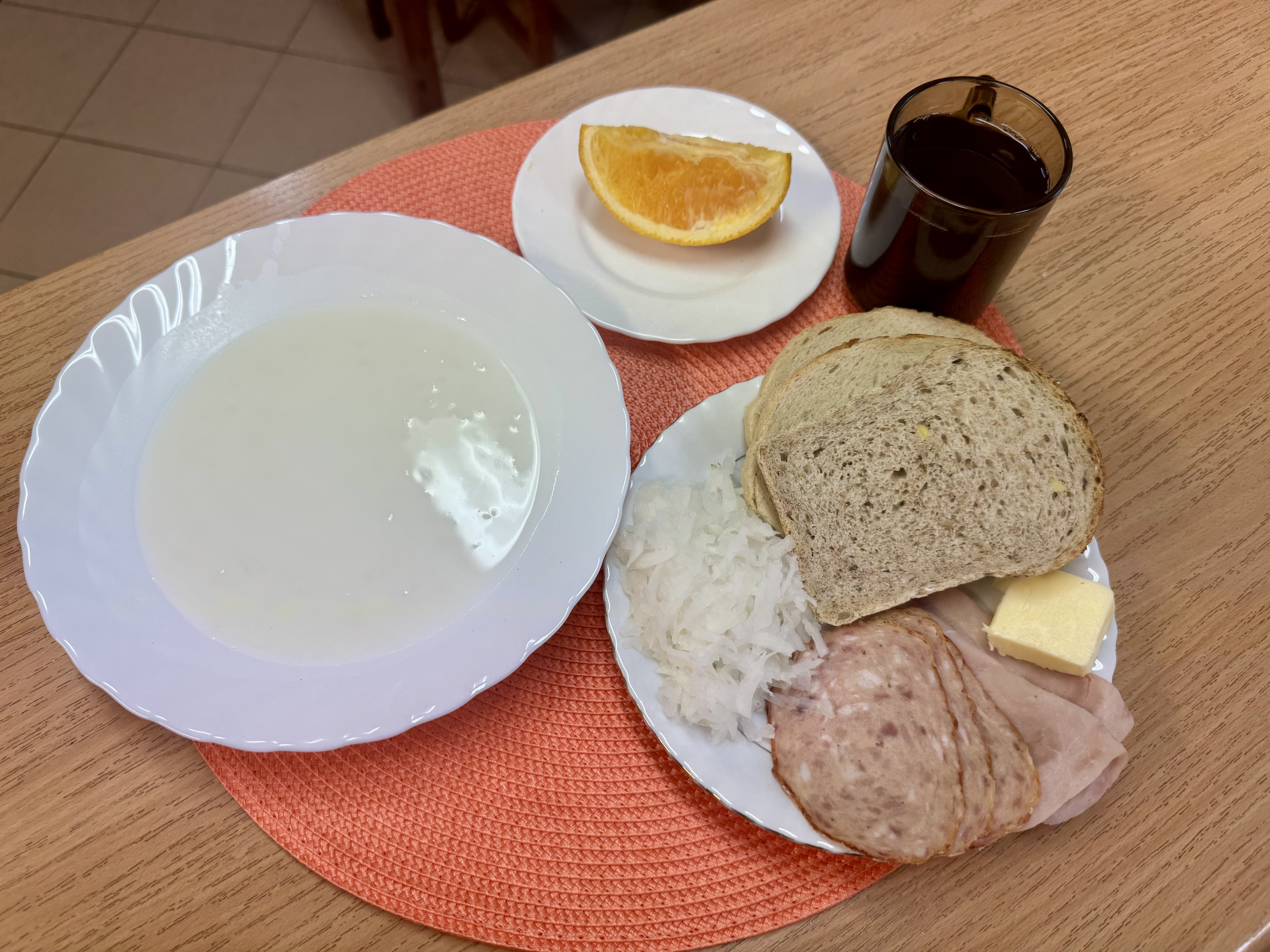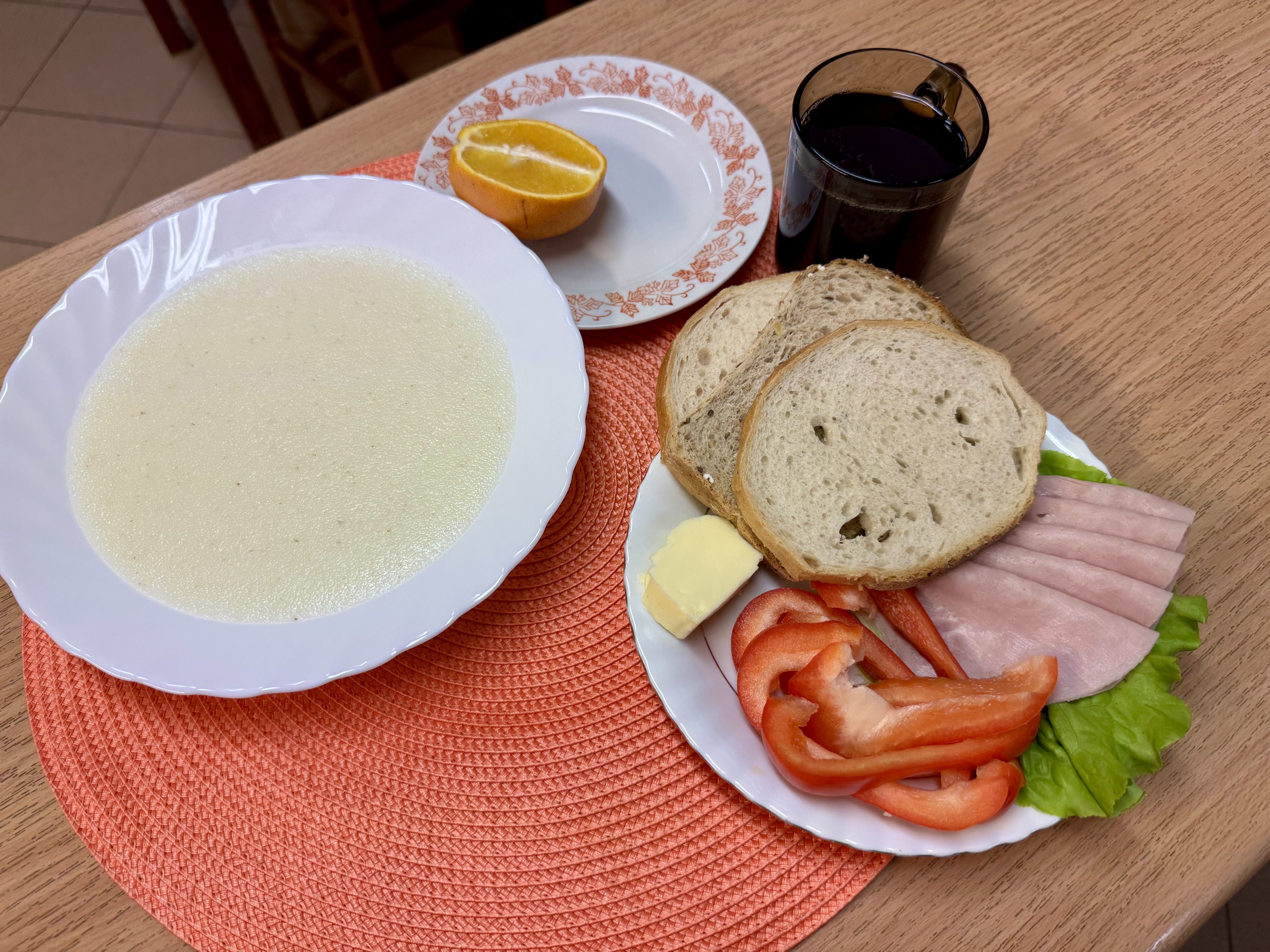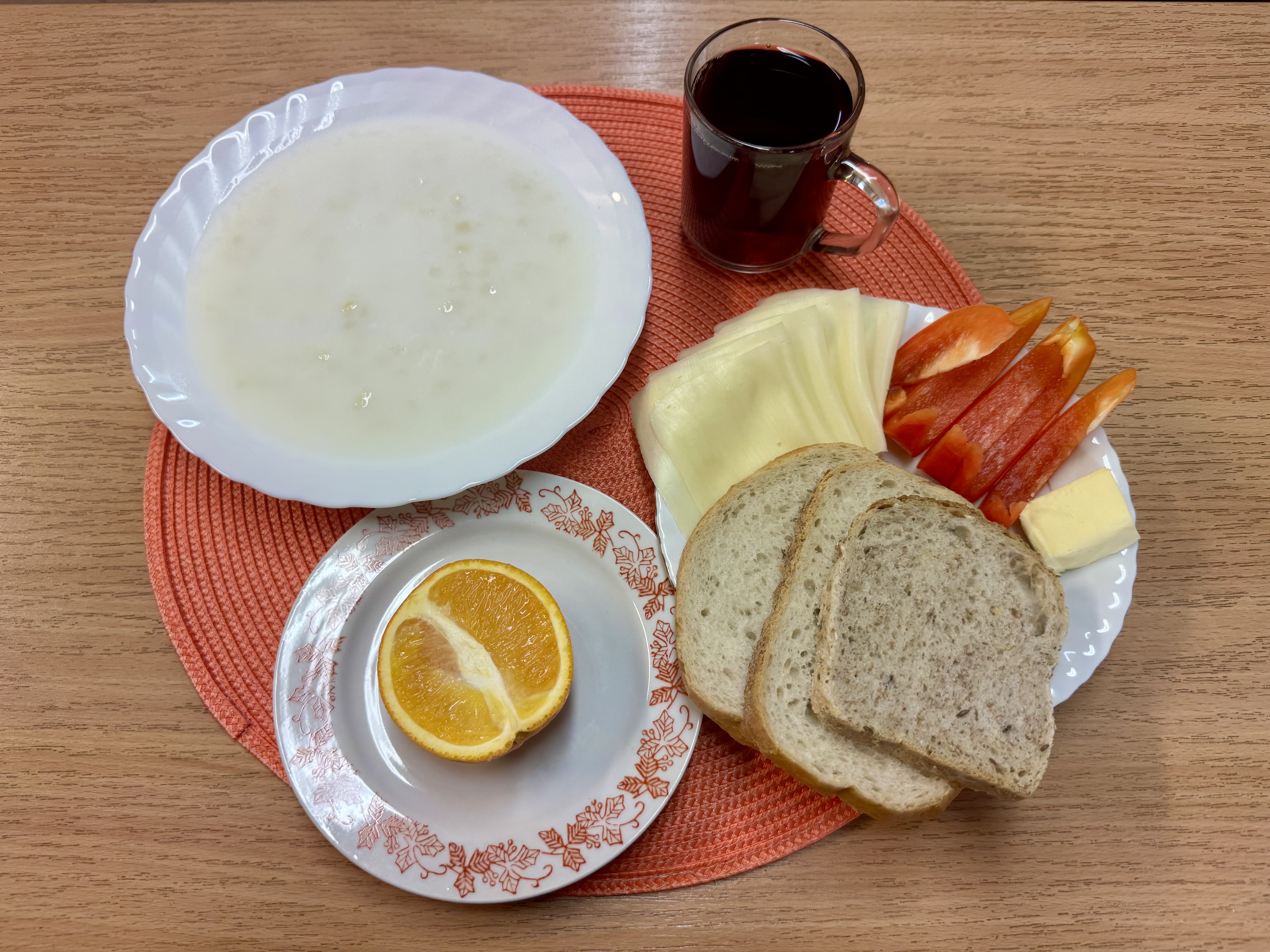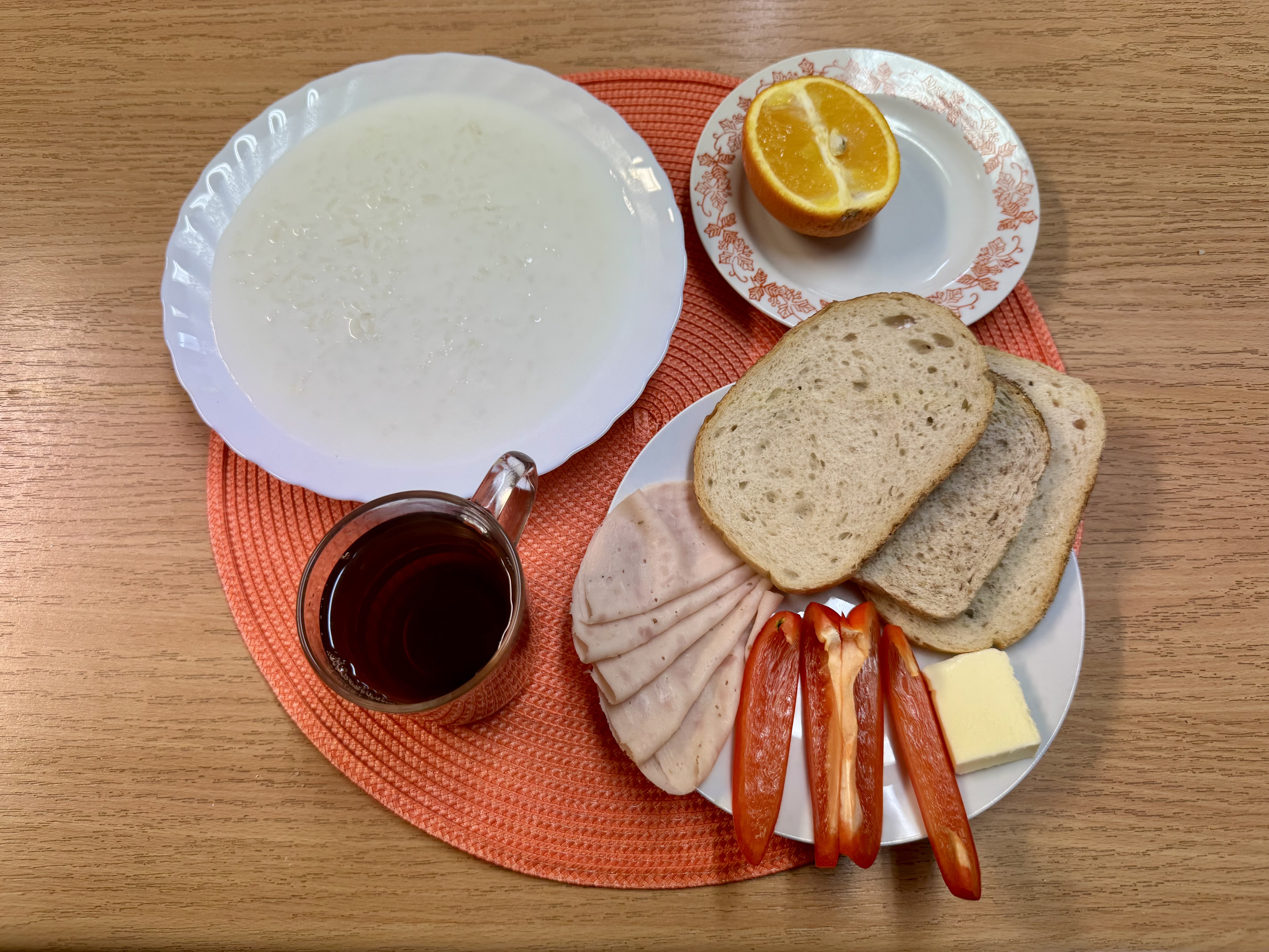 | Zupa ml. z kaszą manną 300ml (GLU, MLE) Herbata z cukrem 250ml Chleb zwykły 100g (GLU, SOJ) Chleb razowy 30g (GLU) Masło 10g (MLE) Łopatka prasowana - wędlina 50g (SOJ, SEL) Papryka 90g Owoc 70g |