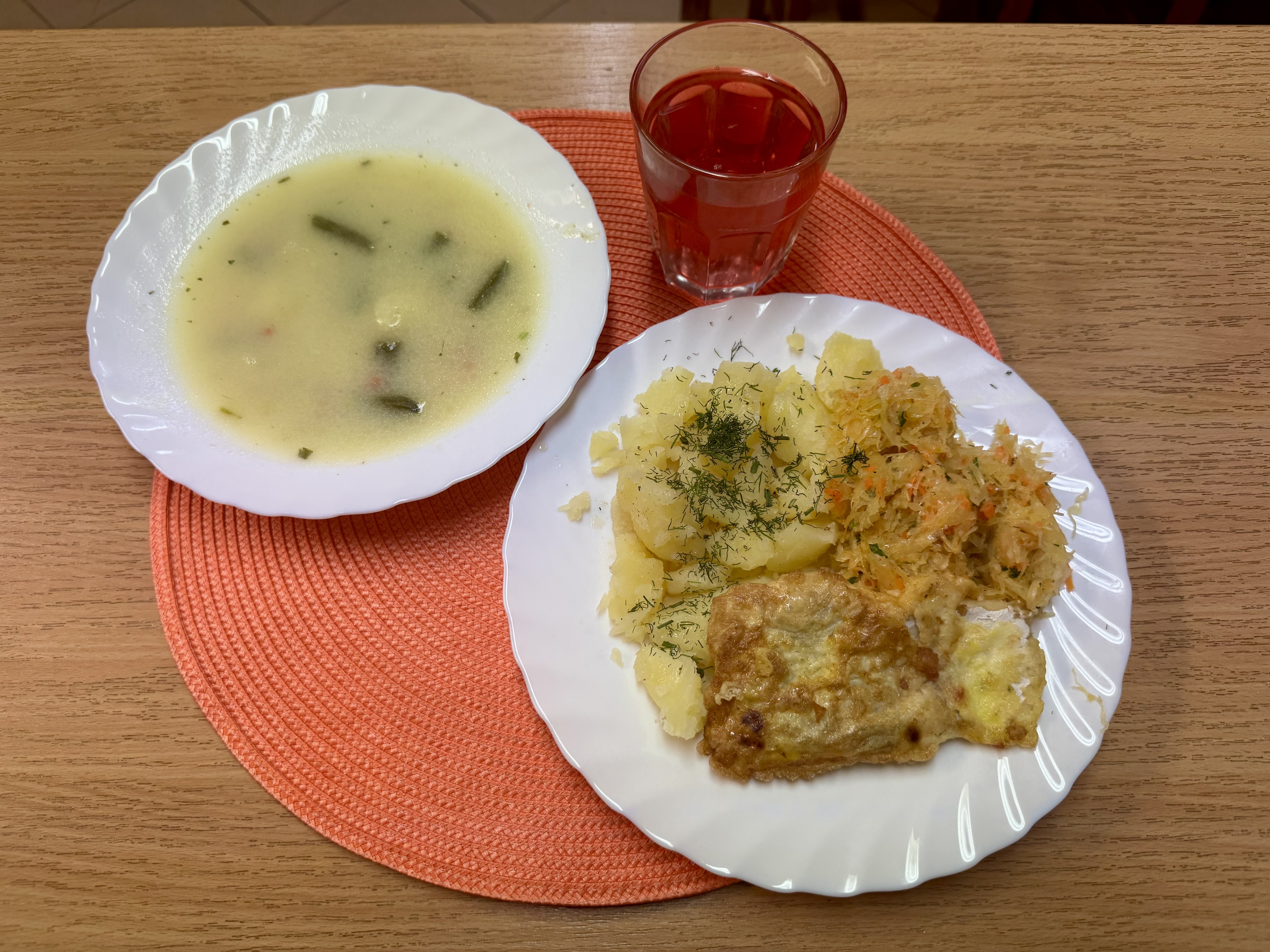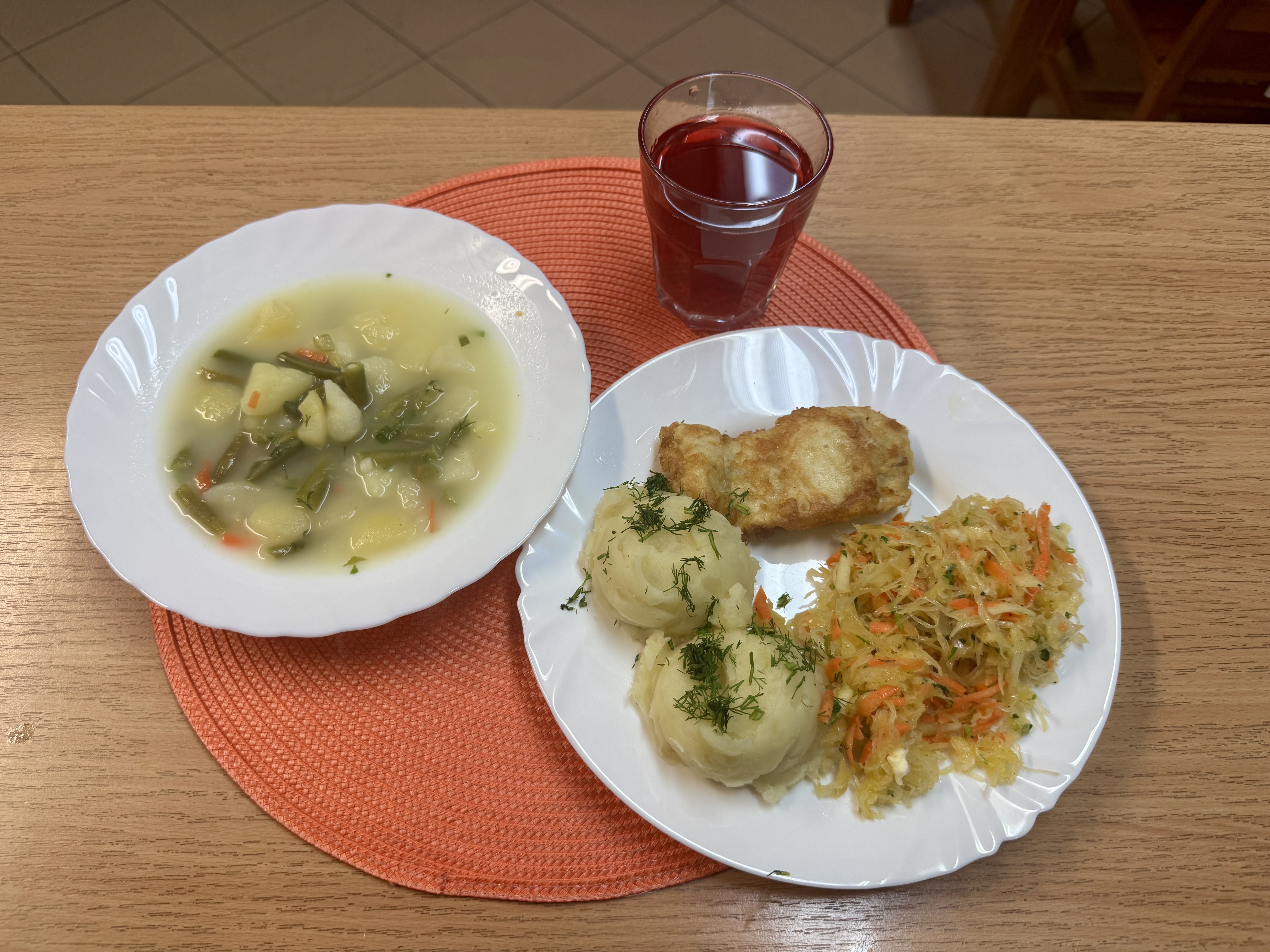 | Zupa z fasolką szparagową 300 ml (MLE) Ryba na parze 70 g (RYB) Ziemniaki 200g Surówka z kiszonej kapusty 140 ml Kompot owocowy b/c 250 ml |