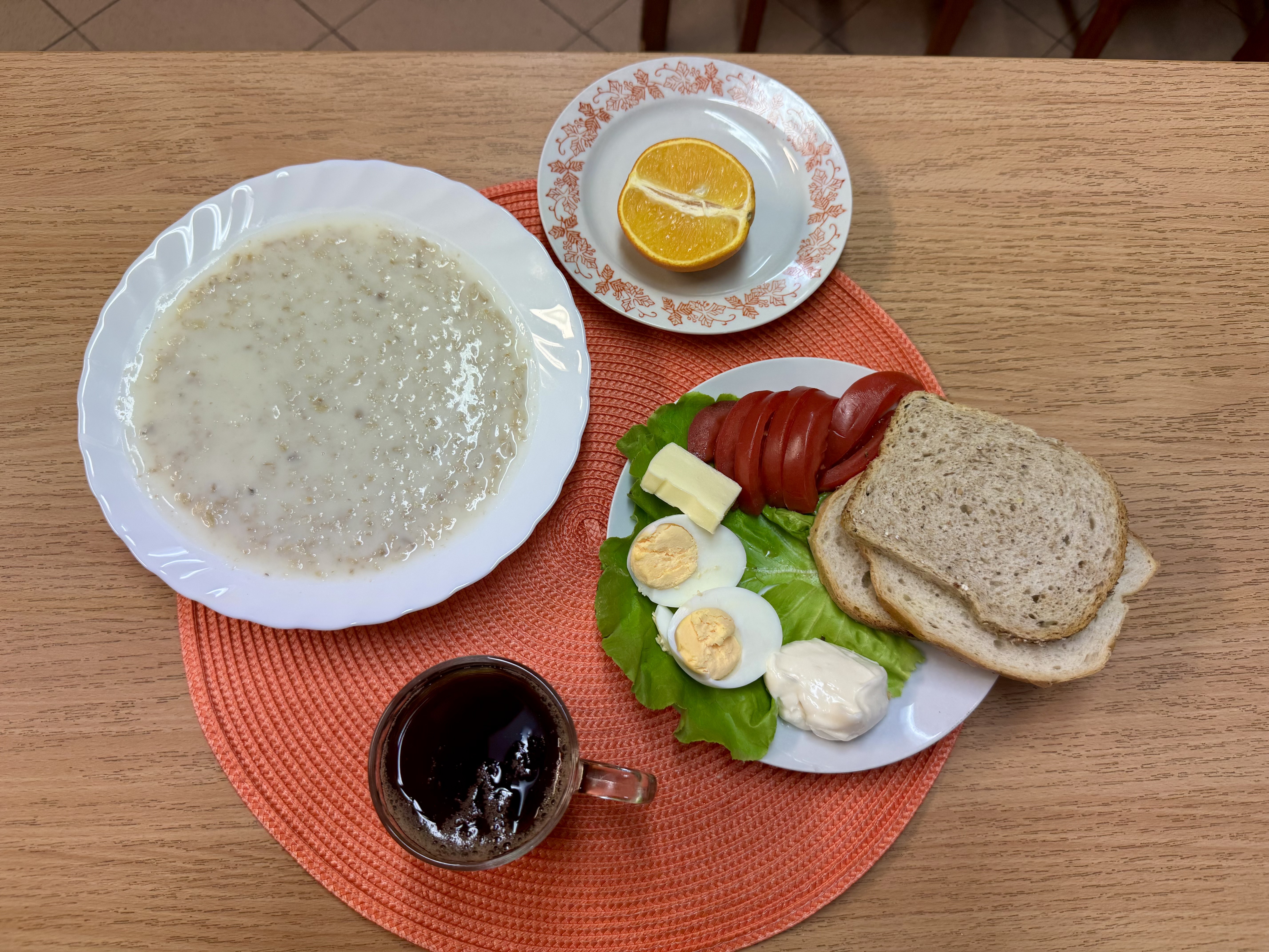 | Zupa ml. z płatkami owsianymi 300ml (GLU, MLE) Herbata 250ml Chleb razowy 30g (GLU) Chleb zwykły 100g Masło 10g (MLE) Jajko got. na twardo kl. M 1szt. (JAJ) Majonez 15g (JAJ, GOR) Pomidor 70g Sałata 20g Owoc 70g |