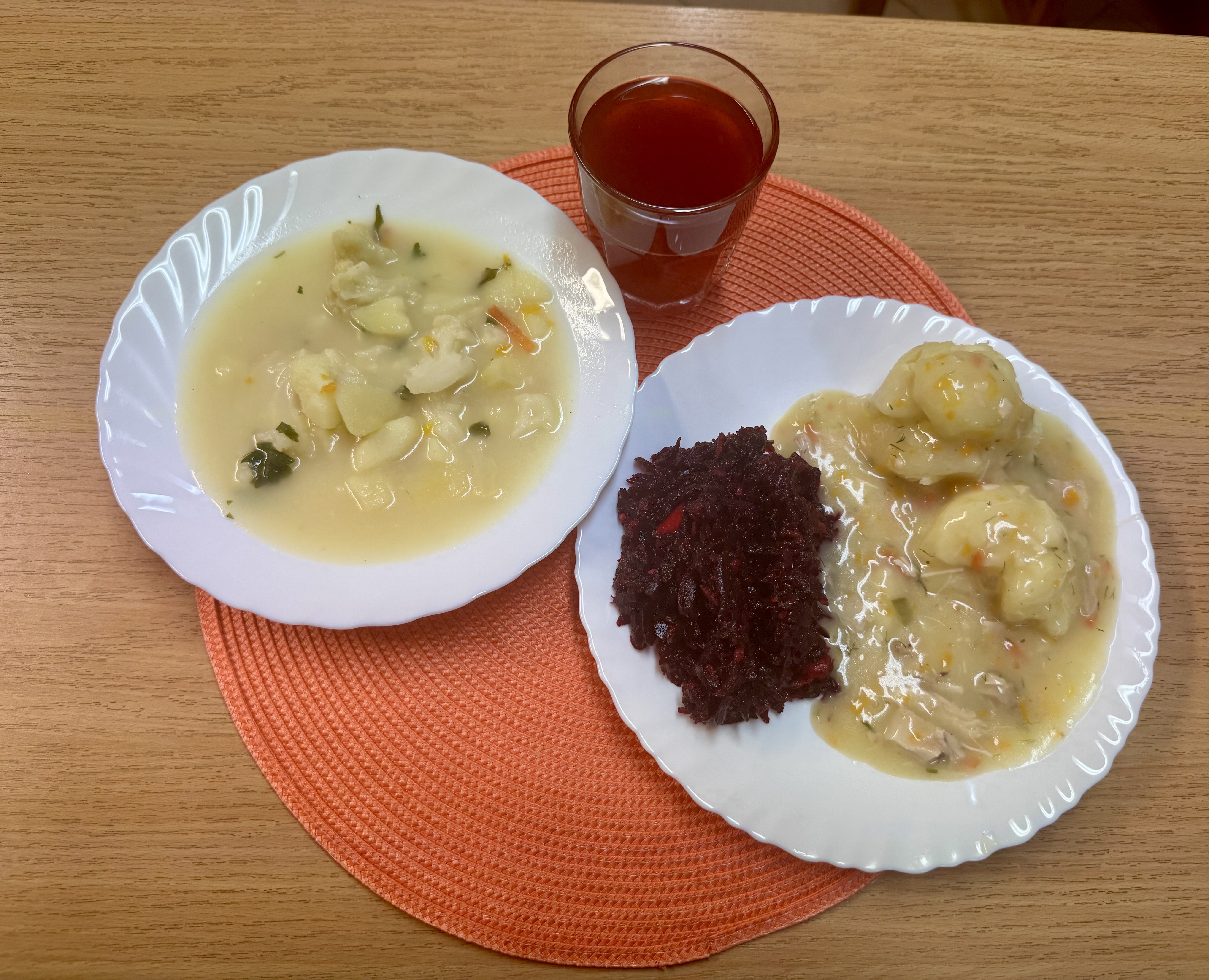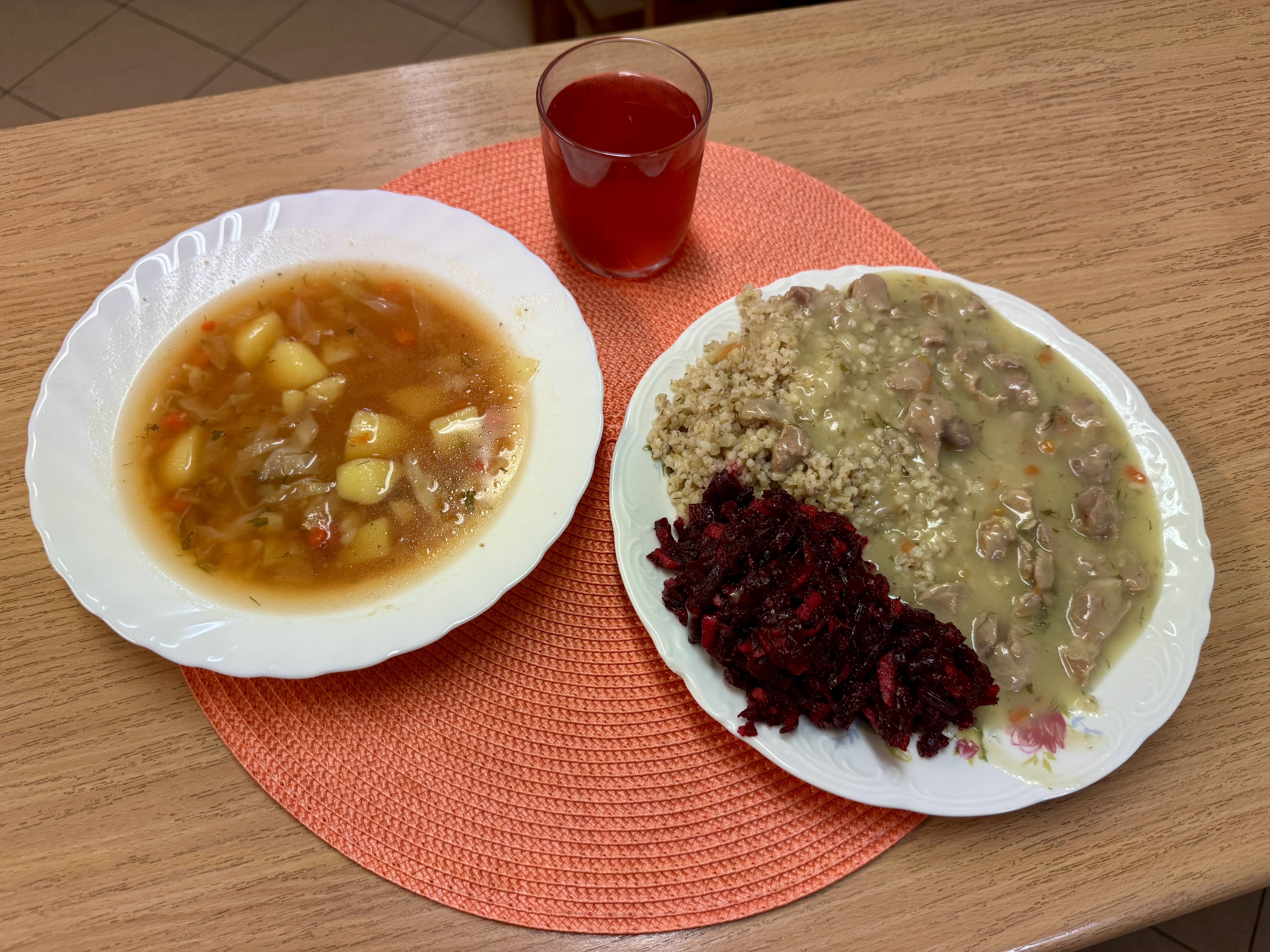 | Zupa pejzanka z ziemniakami 300ml (MLE) Gulasz z żołądków drobiowych duszony b/mąki 150g (GLU) Kasza jęczmienna 200g (GLU) Surówka z buraczków i jabłka z olejem 140g Kompot owocowy b/c 250ml |