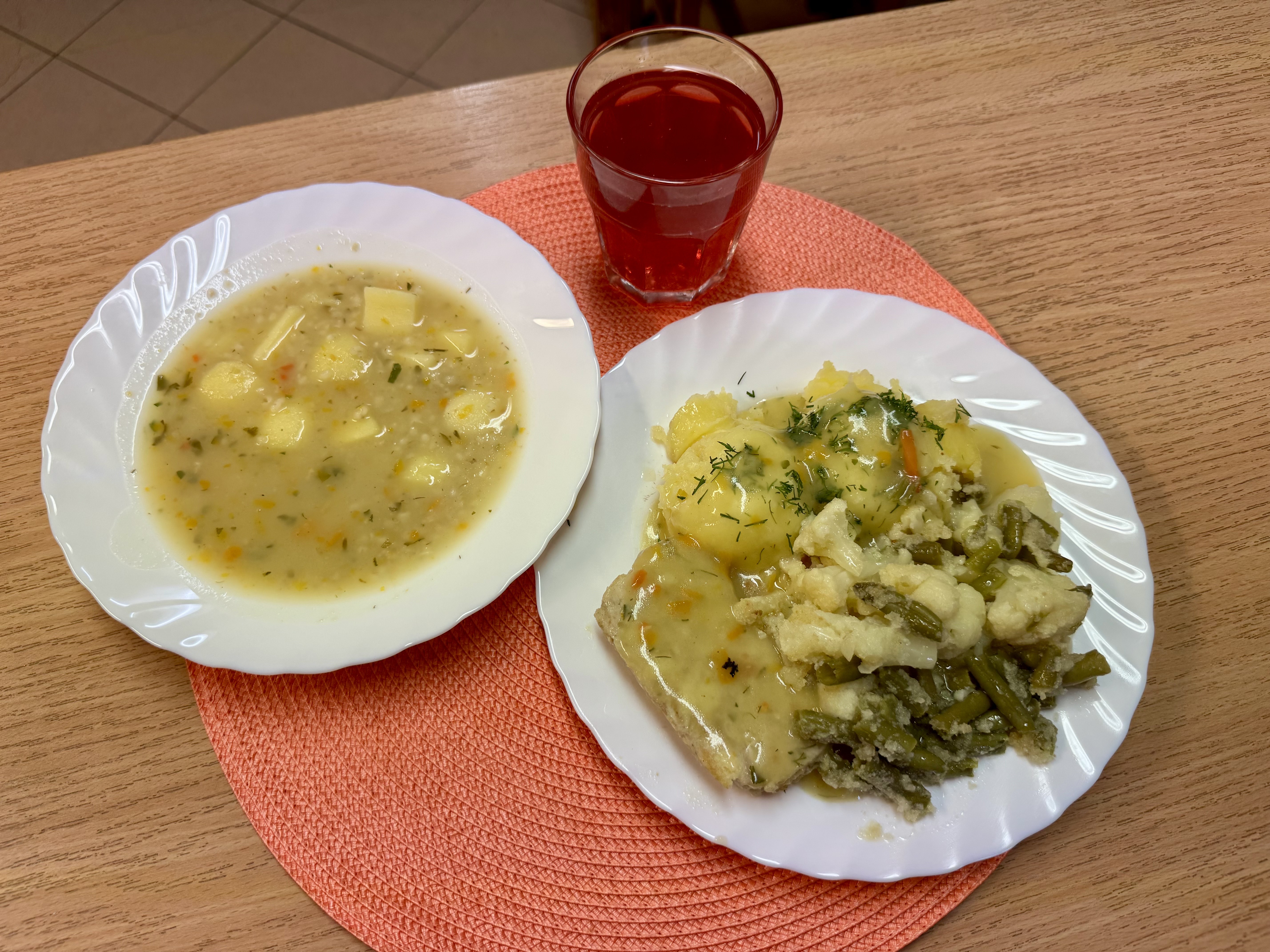 | Zupa z fasolką szparagową 300 ml (MLE) Ryba na parze 70 g (RYB) Ziemniaki 200g Surówka z kiszonej kapusty 140 ml Kompot owocowy 250 ml |