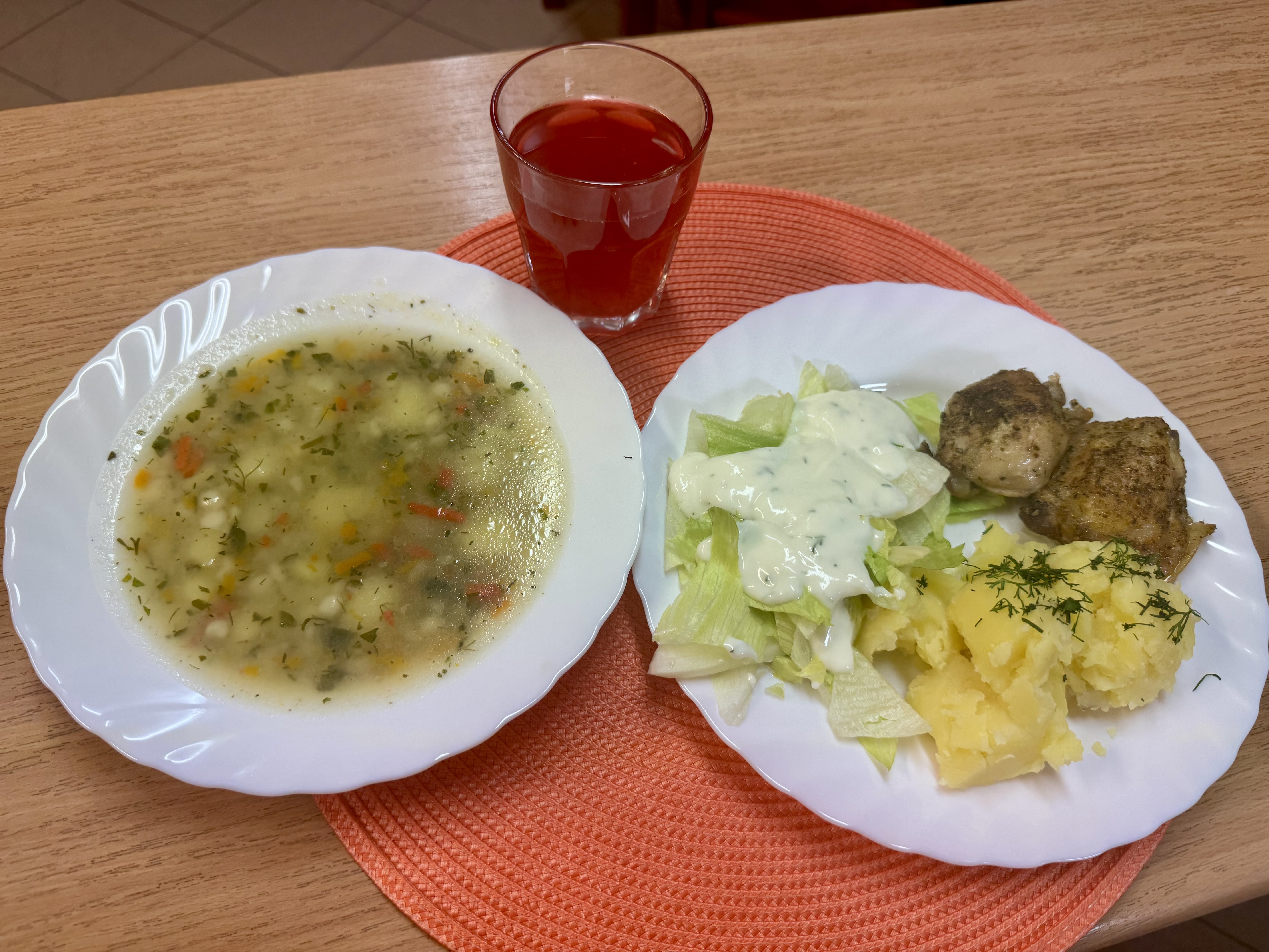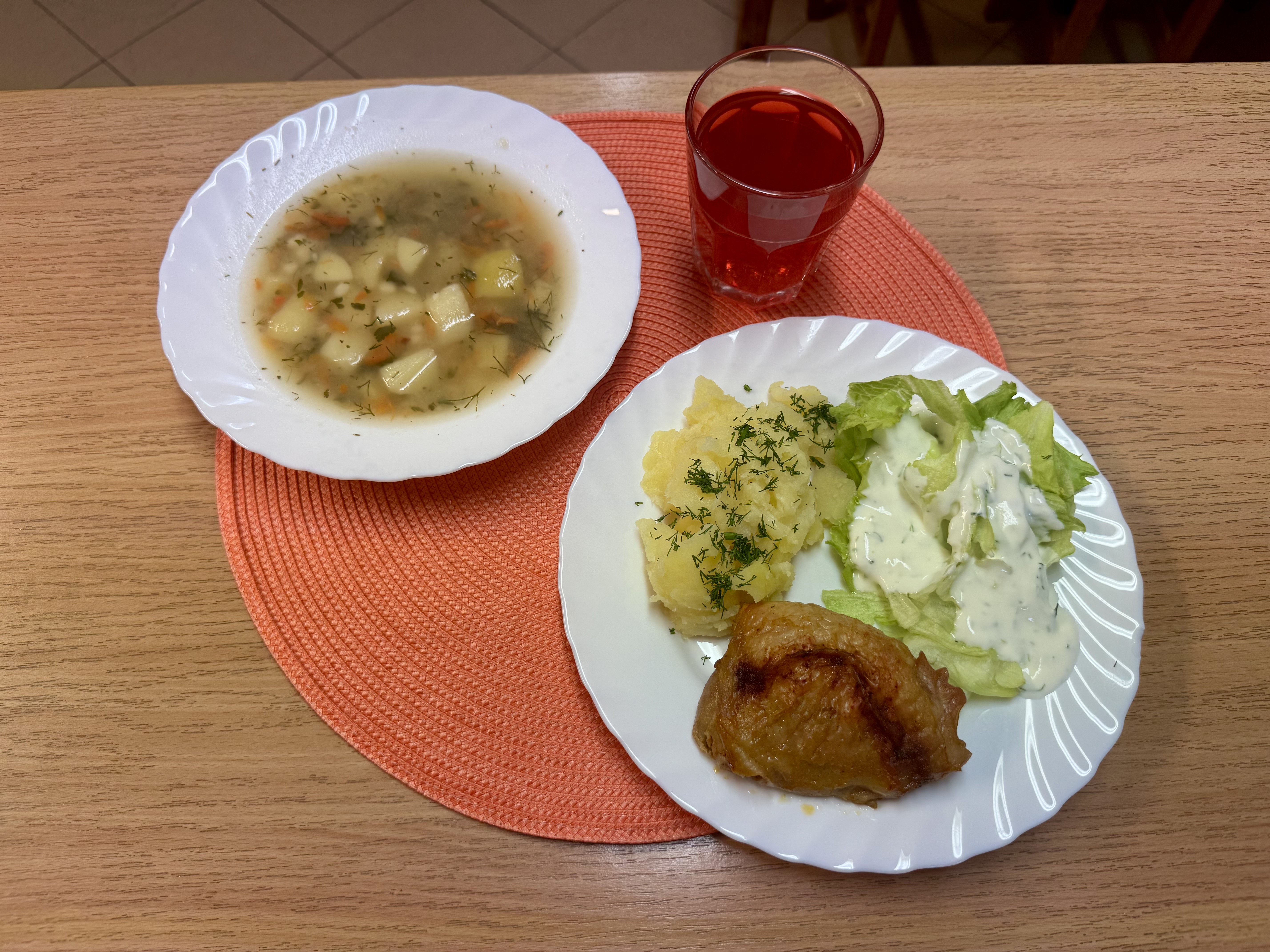 | Zupa zacierkowa 300ml (MLE) Udko opiekane 100g Ziemniaki 200g Sałata lodowa z jogurtem 140g Kompot owocowy b/c 250ml |