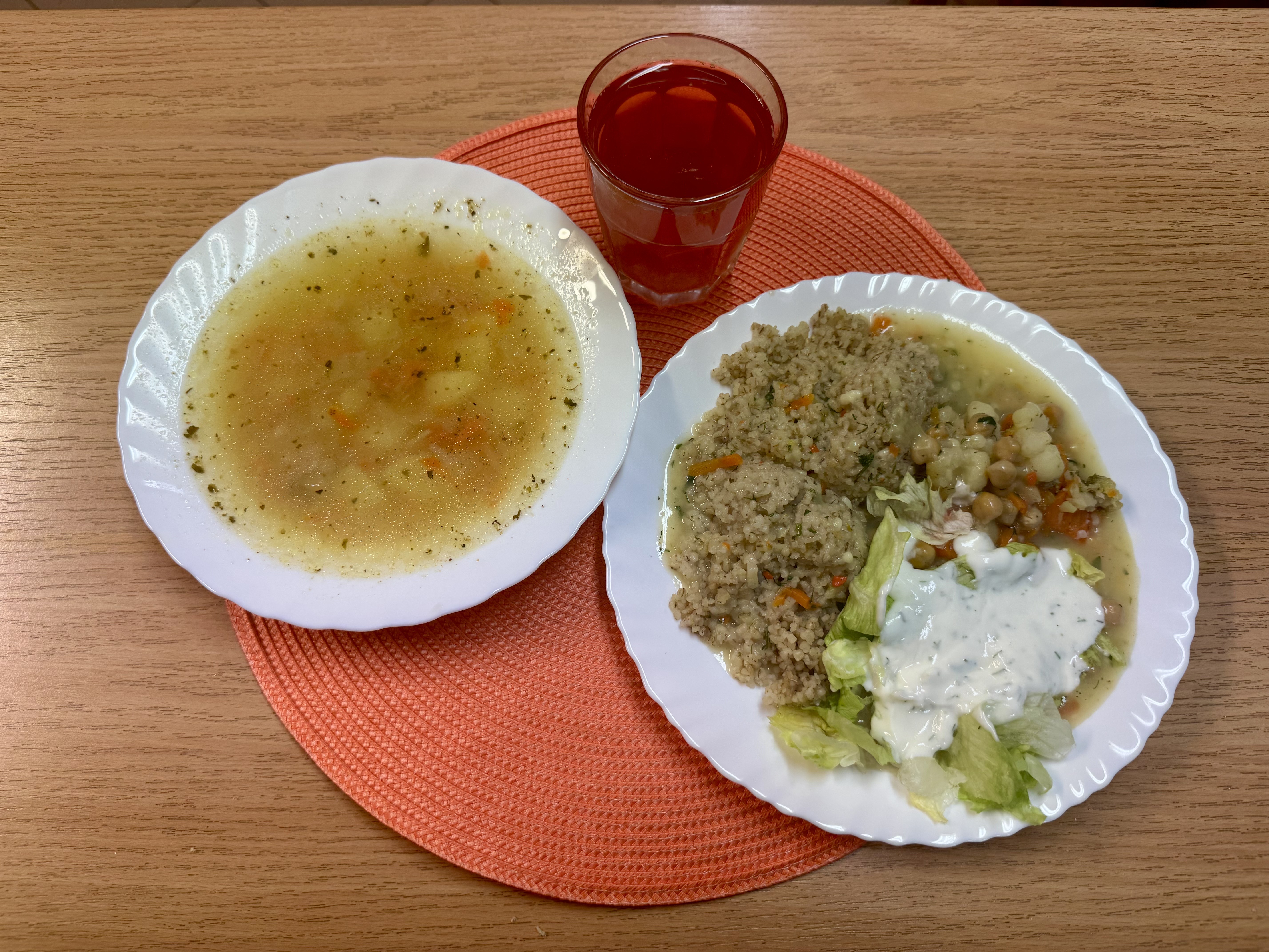 | Zupa 300ml Kaszotto z warzywami i cieciorką (WEGE) 300g (GLU) Sałata z jogurtem 100g (MLE) Kompot owocowy 250ml |