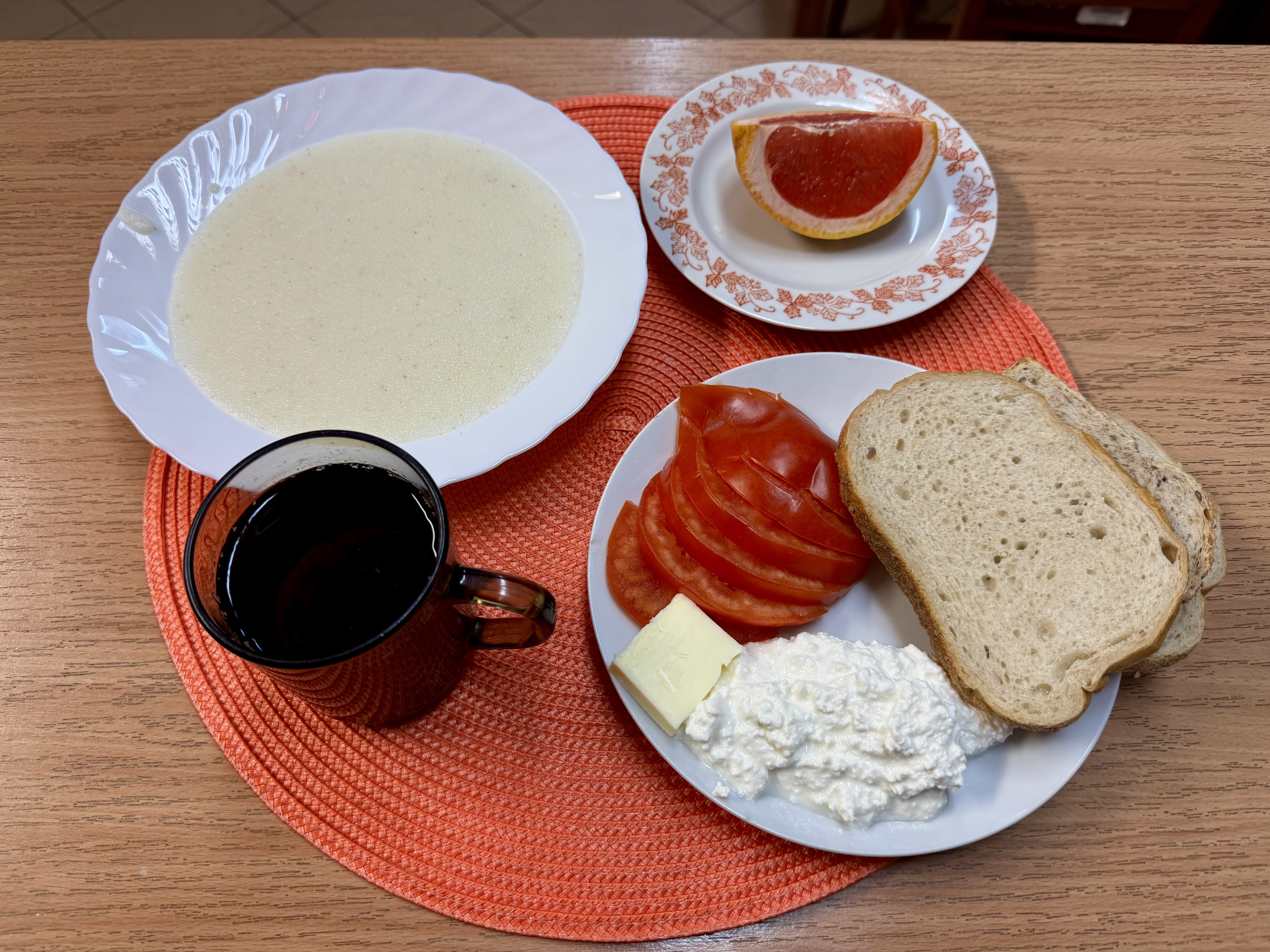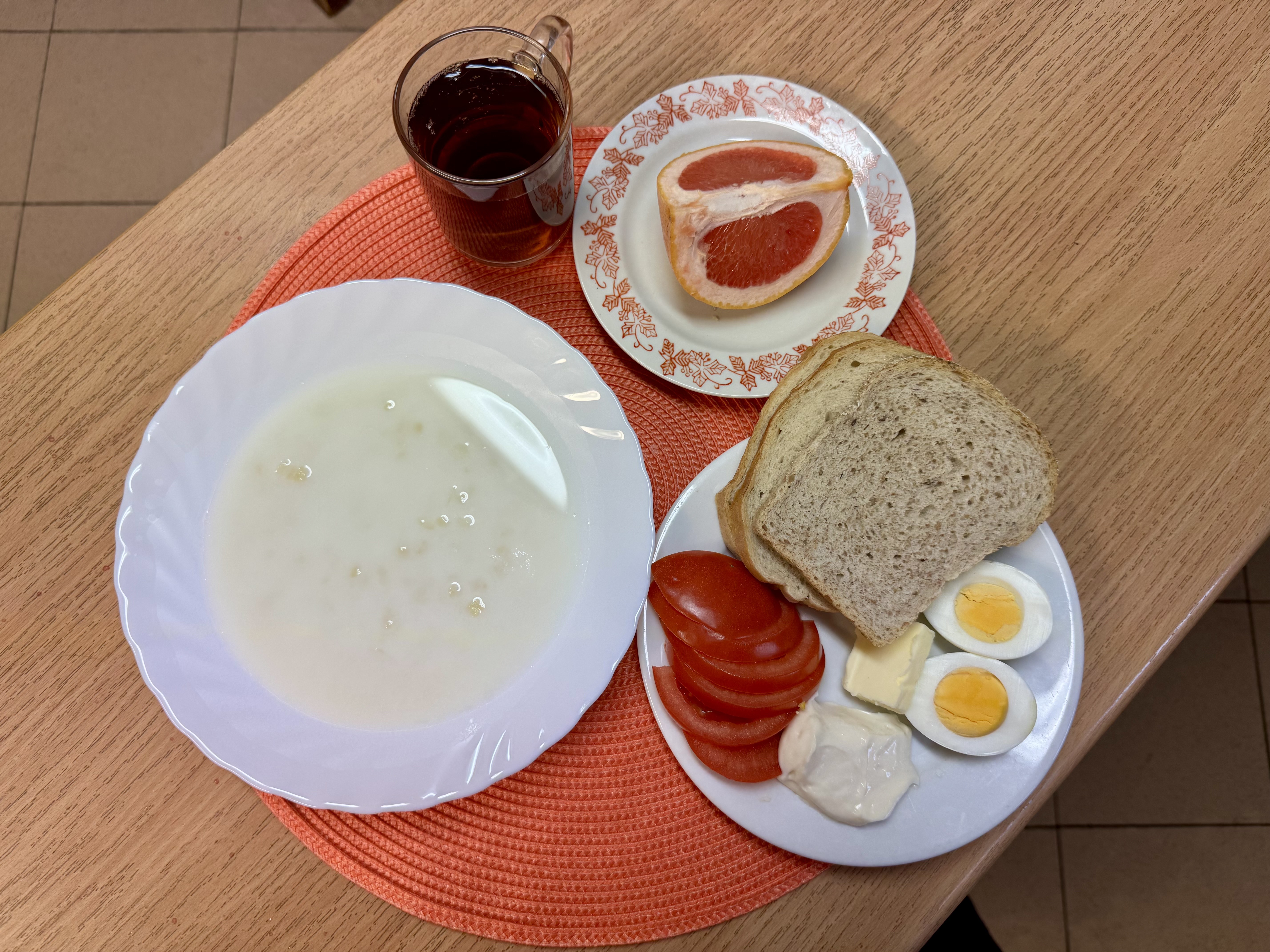 | Zupa ml. z kaszą manną 300ml (GLU, MLE) Herbata z cukrem 250ml Chleb zwykły 100g (GLU, SOJ, JAJ) Chleb razowy 30g (GLU, SOJ) Masło 10g (MLE) Pasta twarogowa 60g (MLE) Owoc 70g Pomidor 90g |