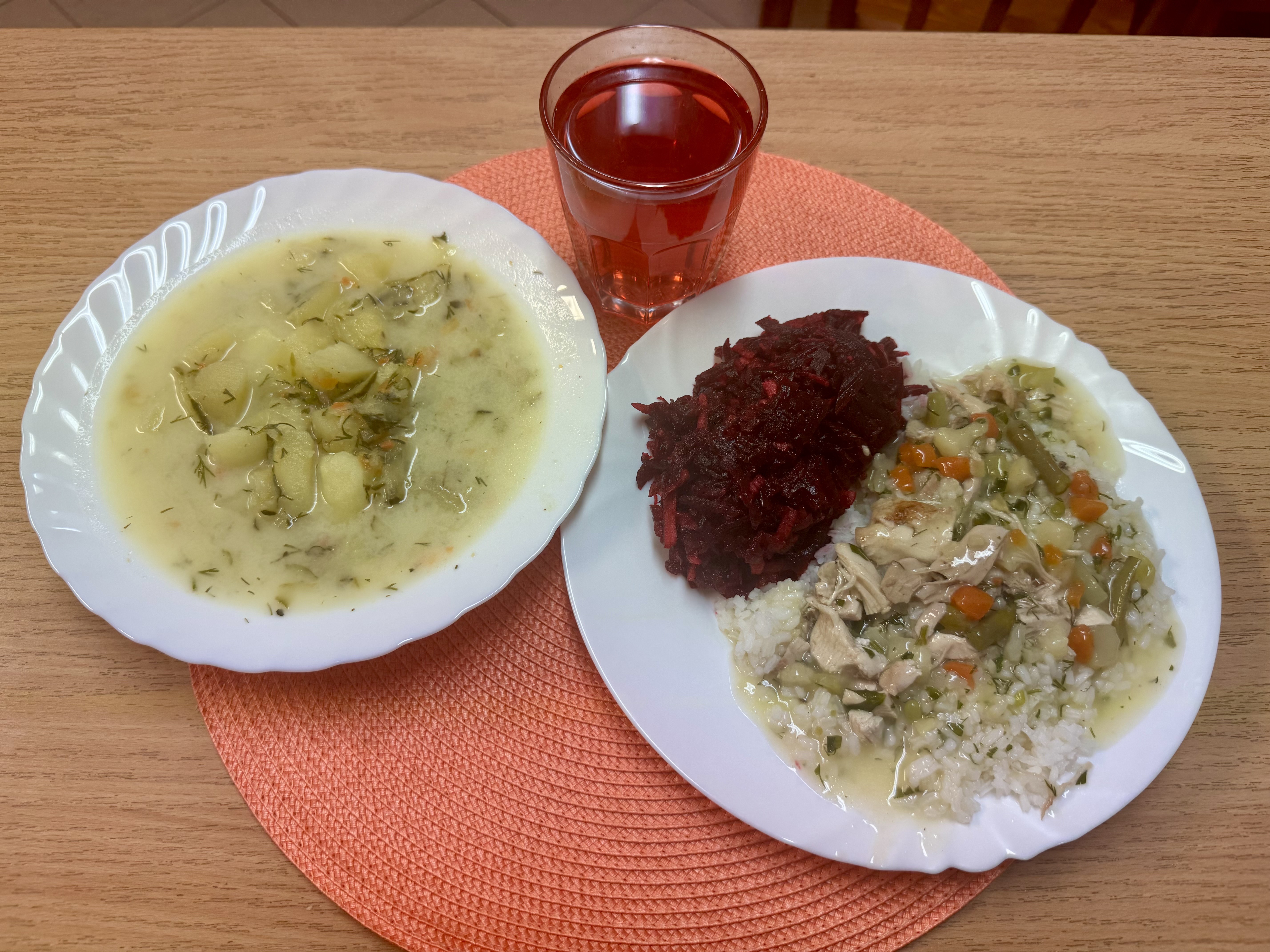 | Zupa ogórkowa z ziemniakami 300 ml (MLE) Potrawka drobiowa 150g (GLU) Ryż 200g Sałatka z buraków i jabłka z olejem 140g Kompot owocowy b/c 250ml |
