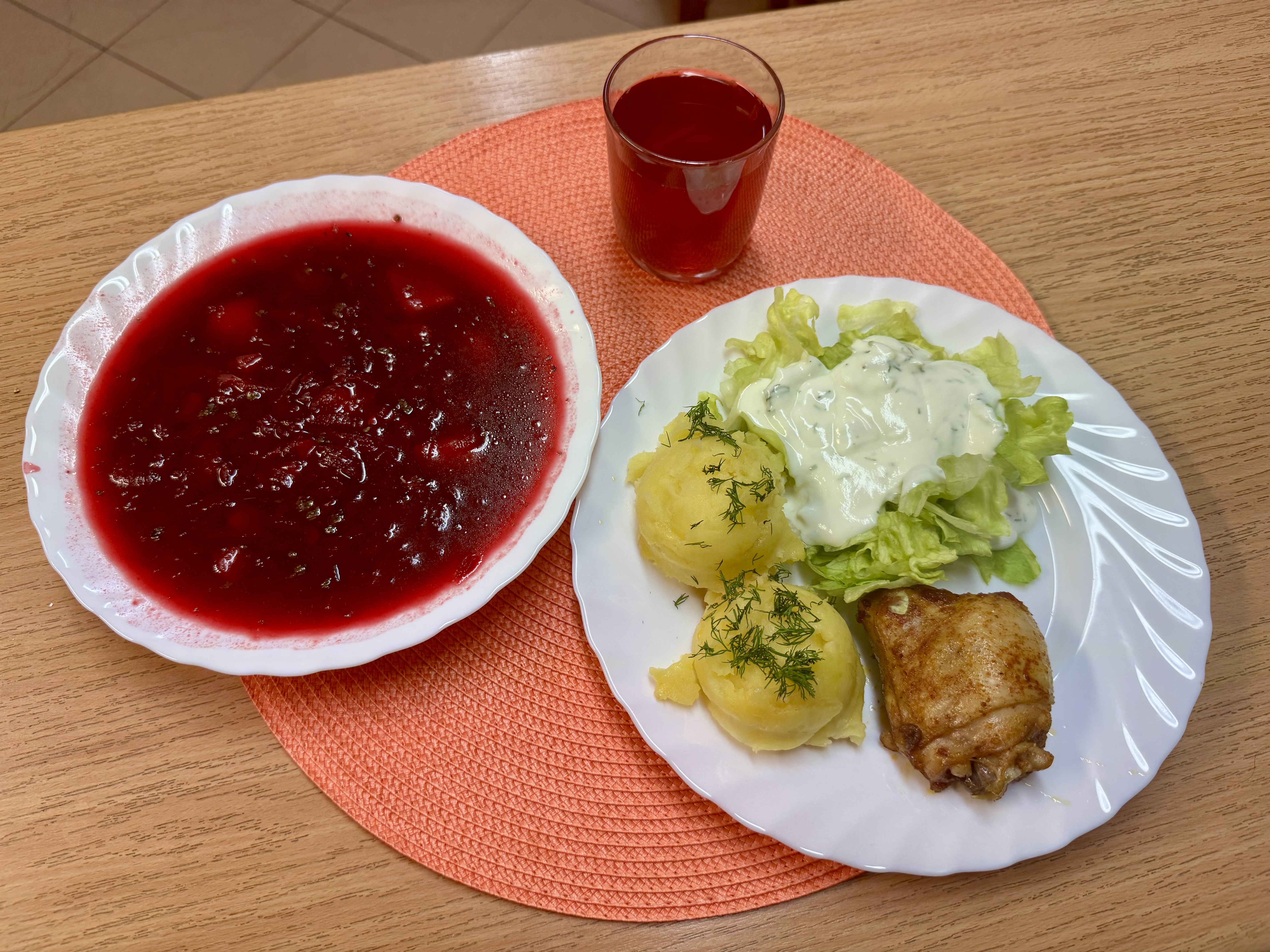 | Zupa barszcz czerwony z ziemniakami 300ml (MLE) Udko opiekane 100g Ziemniaki 200g Sałata lodowa z warzywami i sosem winegret 140g Kompot owocowy b/c 250ml |