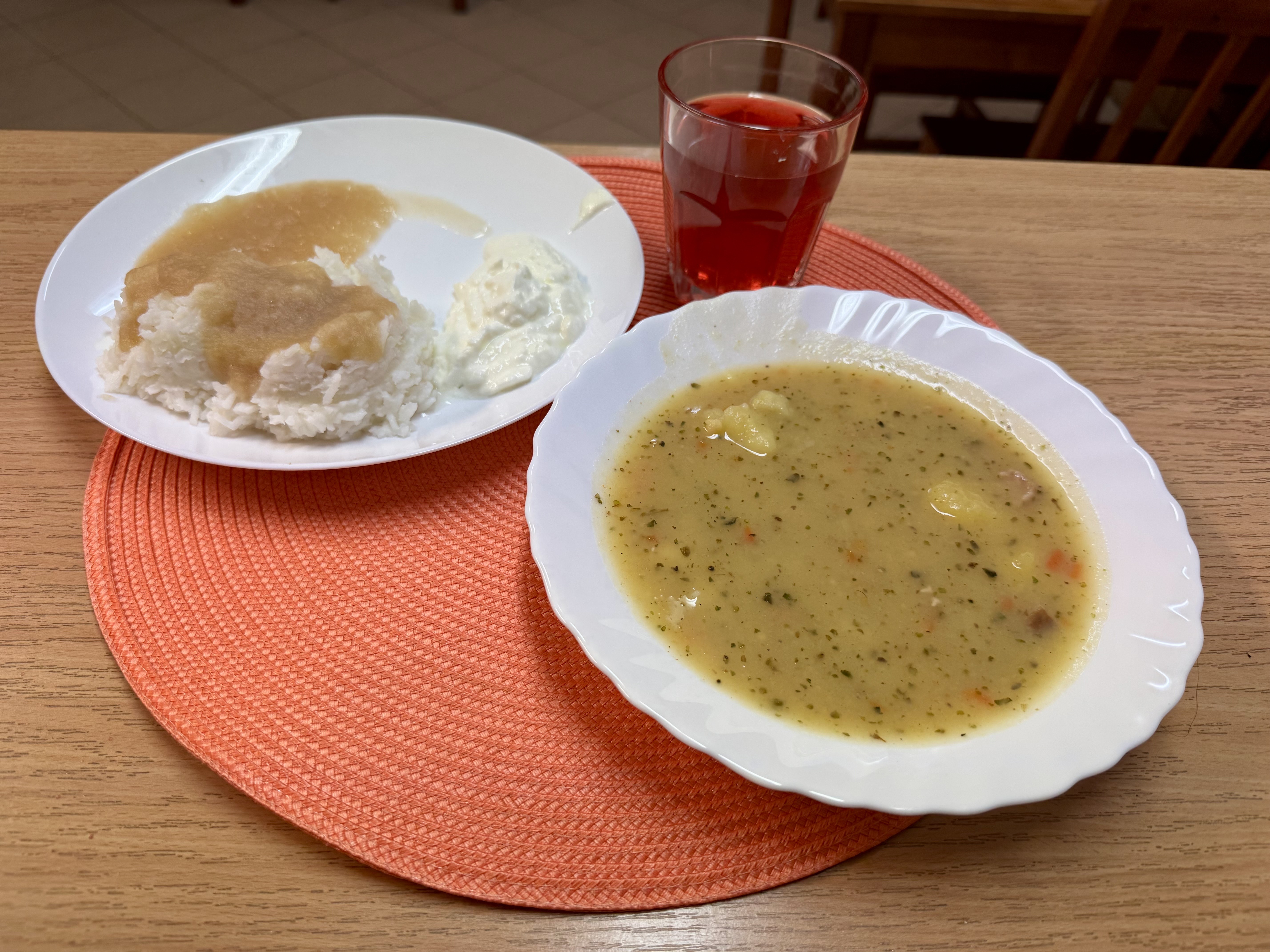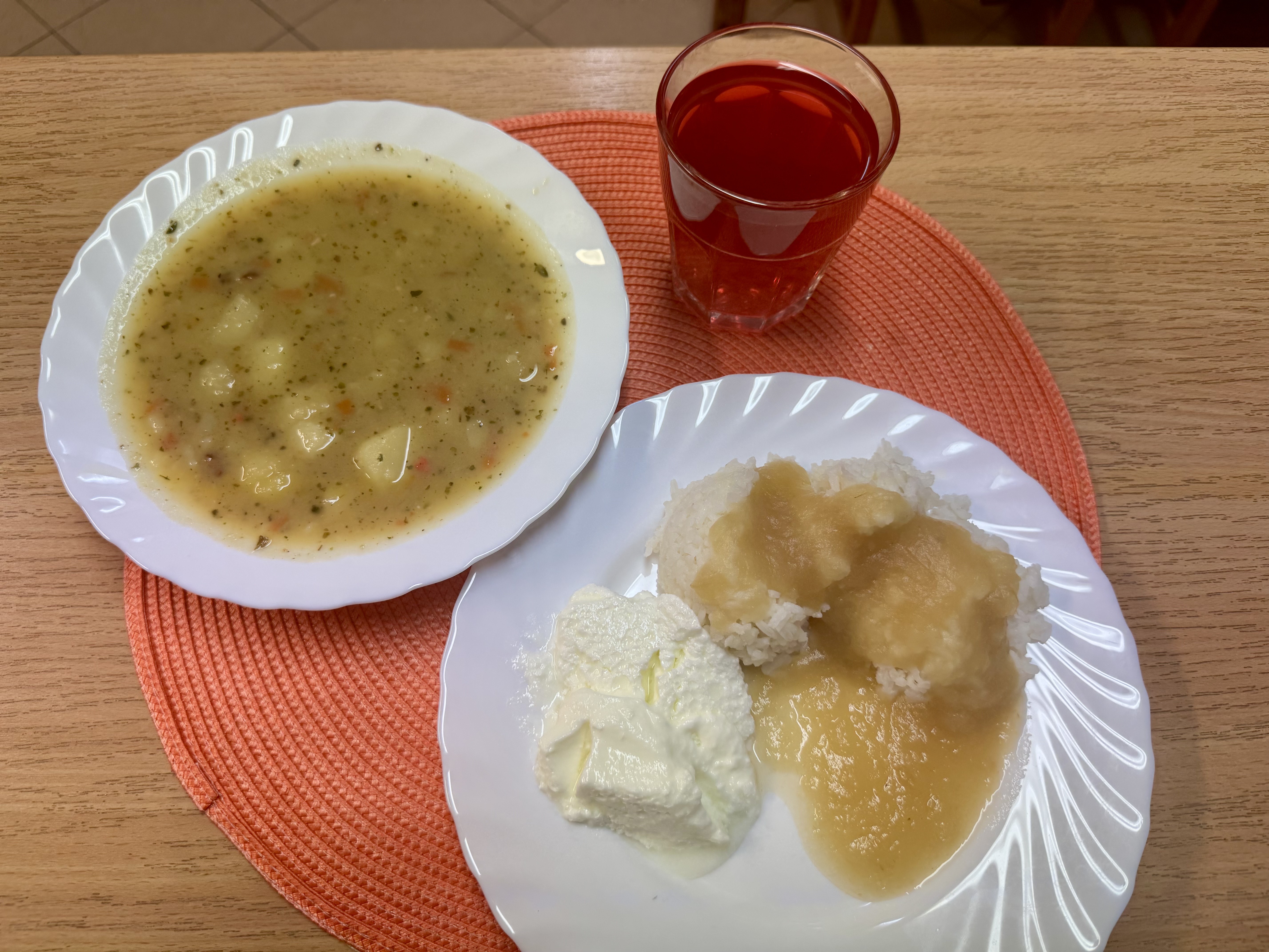 | Zupa grochówka z ziemniakami 300ml Ryż z jabłkiem i cynamonem 300g Jogurt naturalny 50g (MLE) Kompot owocowy 250ml |