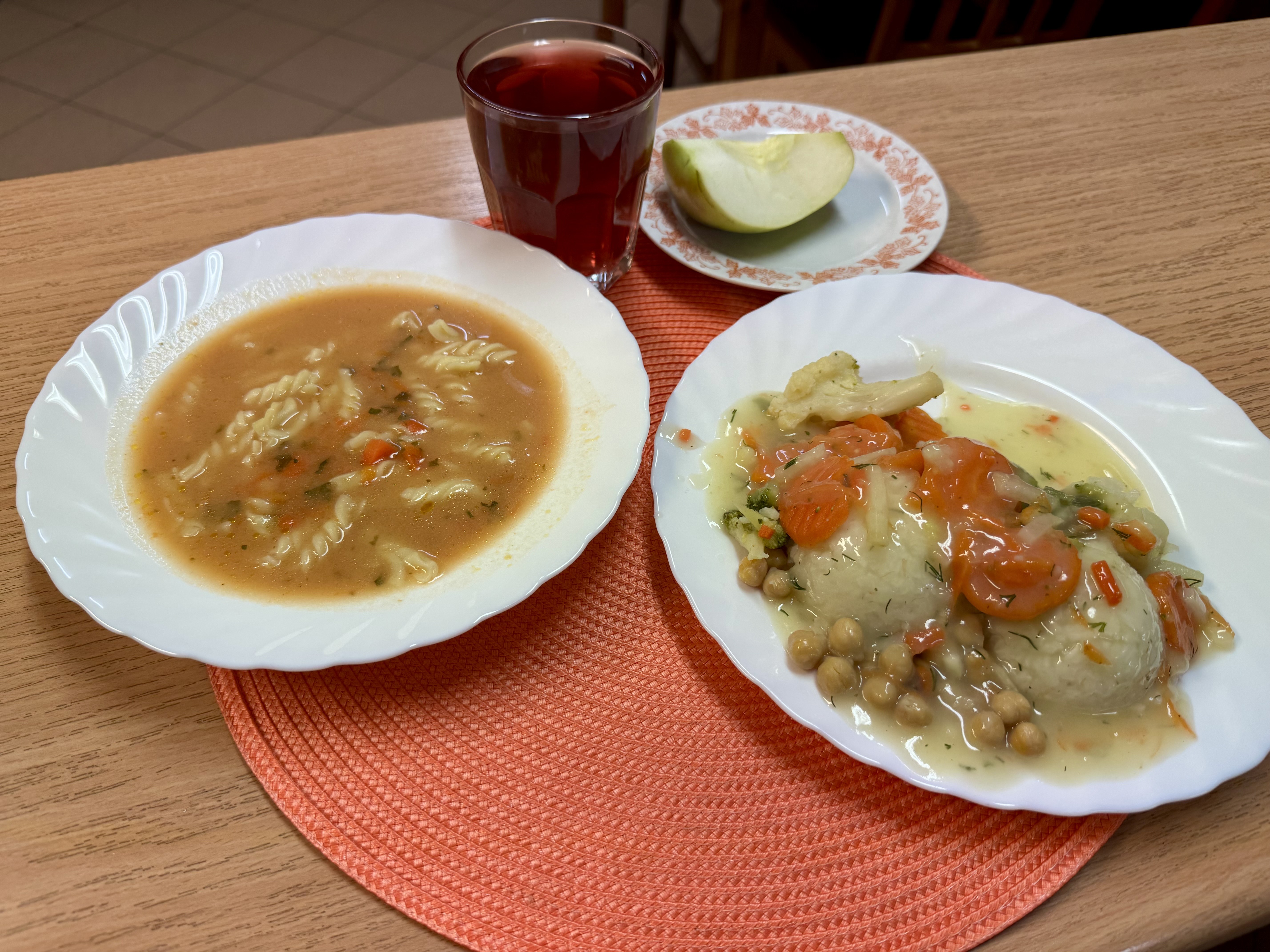 | Rosół z makaronem 300ml (GLU) Risotto z warzywami i kurczakiem 300g Jabłko 150g Kompot owocowy b/c 250ml |