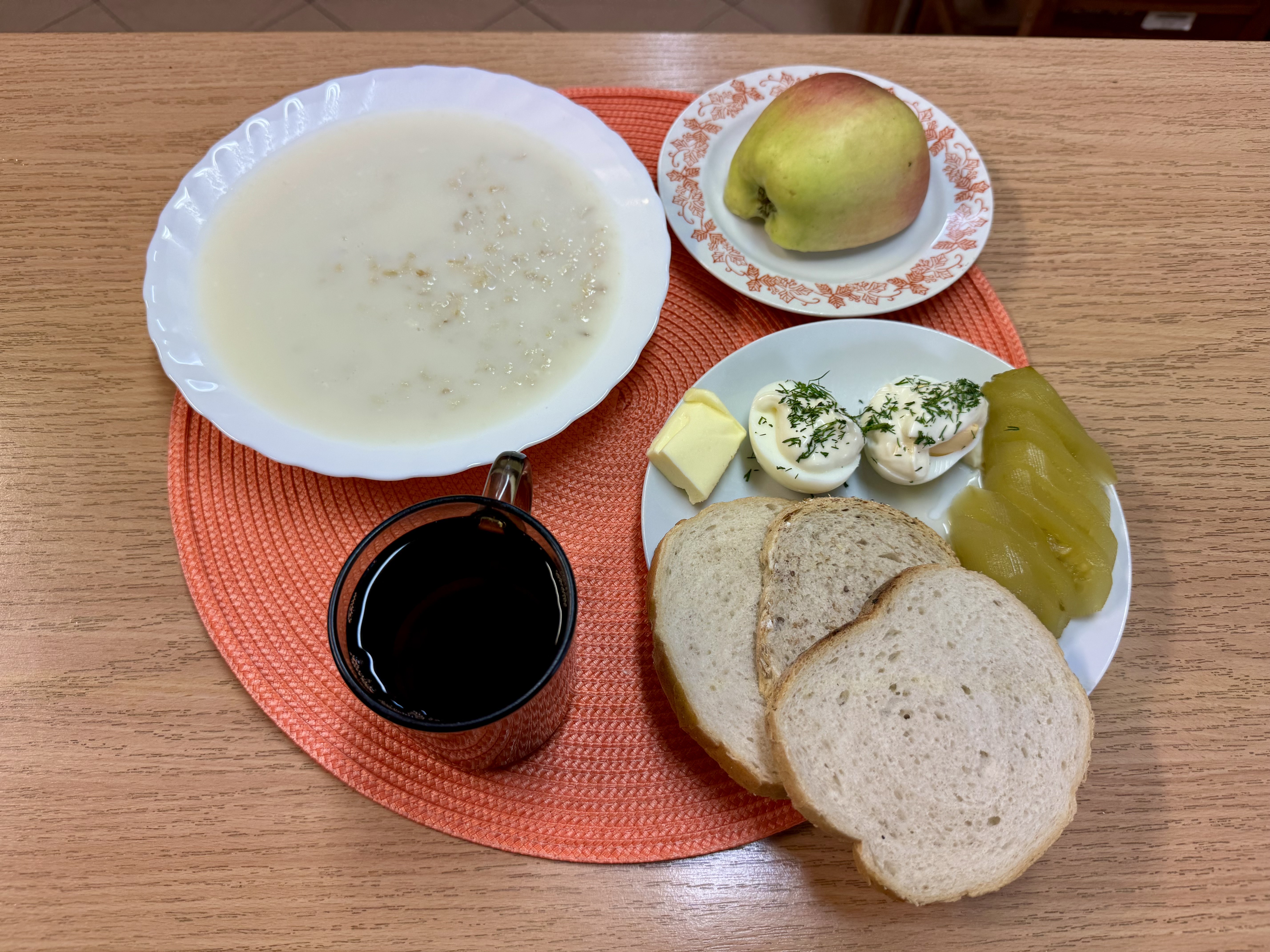 | Zupa ml. z płatkami owsianymi 300ml (GLU, MLE) Herbata 250ml Chleb razowy 30g (GLU) Chleb zwykły 100g Masło 10g (MLE) Jajko got. na twardo kl. M 1szt. (JAJ) Majonez 15g (JAJ, GOR) Ogórek kiszony 70g Sałata 20g Owoc 70g |
