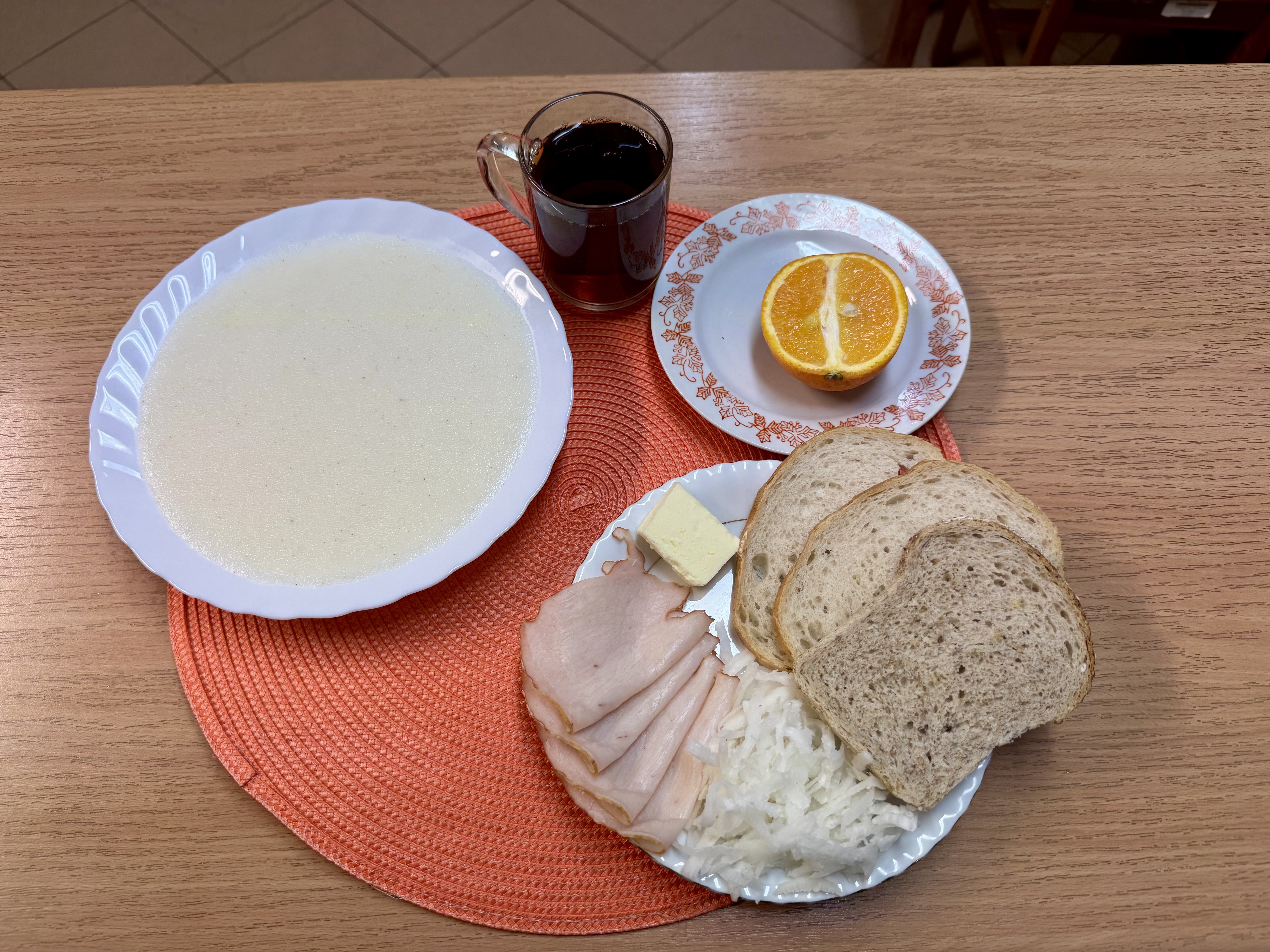 | Zupa ml. z kaszą manną 300ml Herbata z cukrem 250ml Chleb zwykły 100g Chleb razowy 30g Masło 10g Polędwica ani 50g Rzodkiewka 90g Owoc 70g |