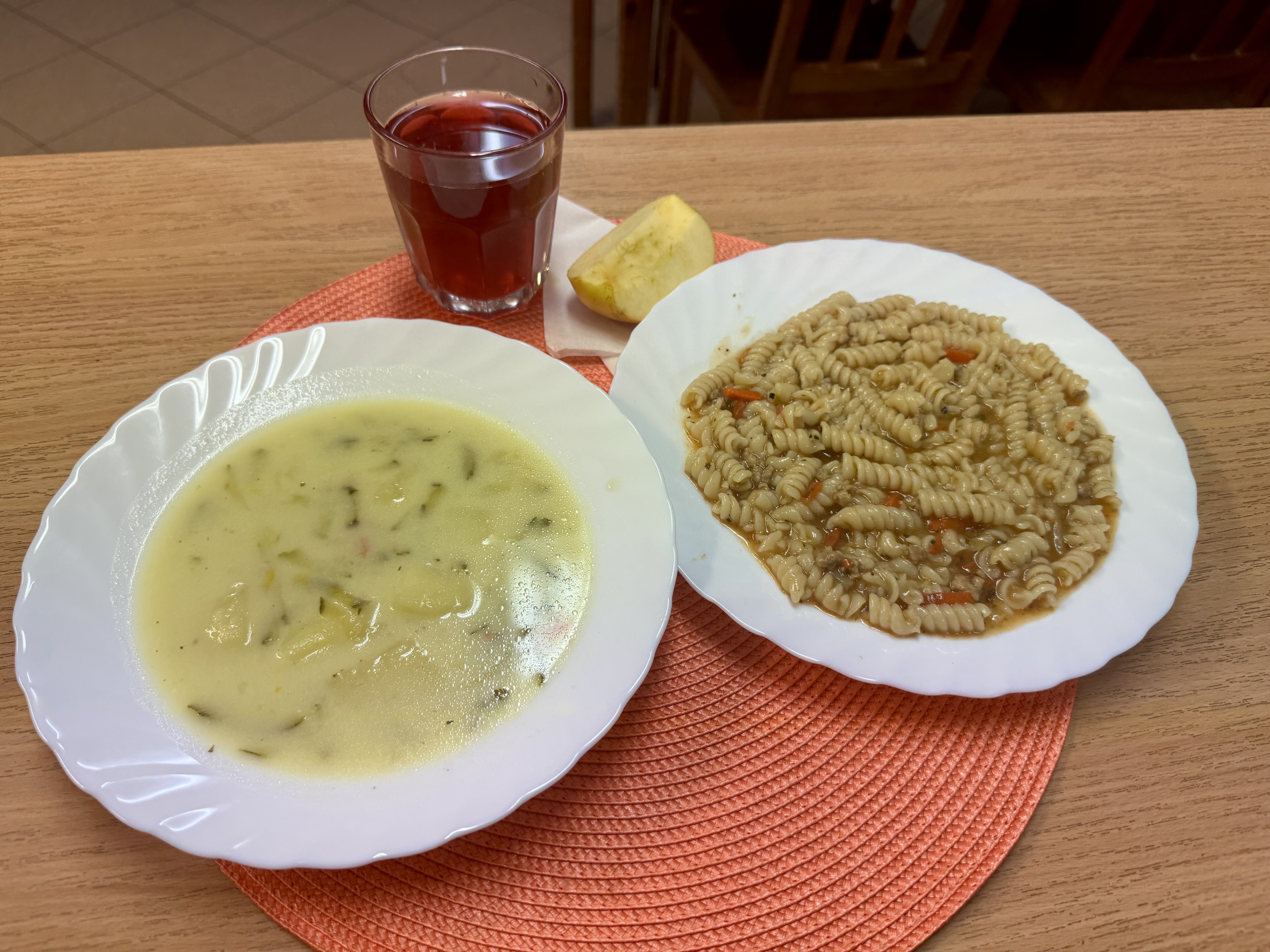 | Zupa ogórkowa z ziemniakami 300ml Makaron Spaghetti z sosem bolognese Jabłko 140g Kompot owocowy 250ml |