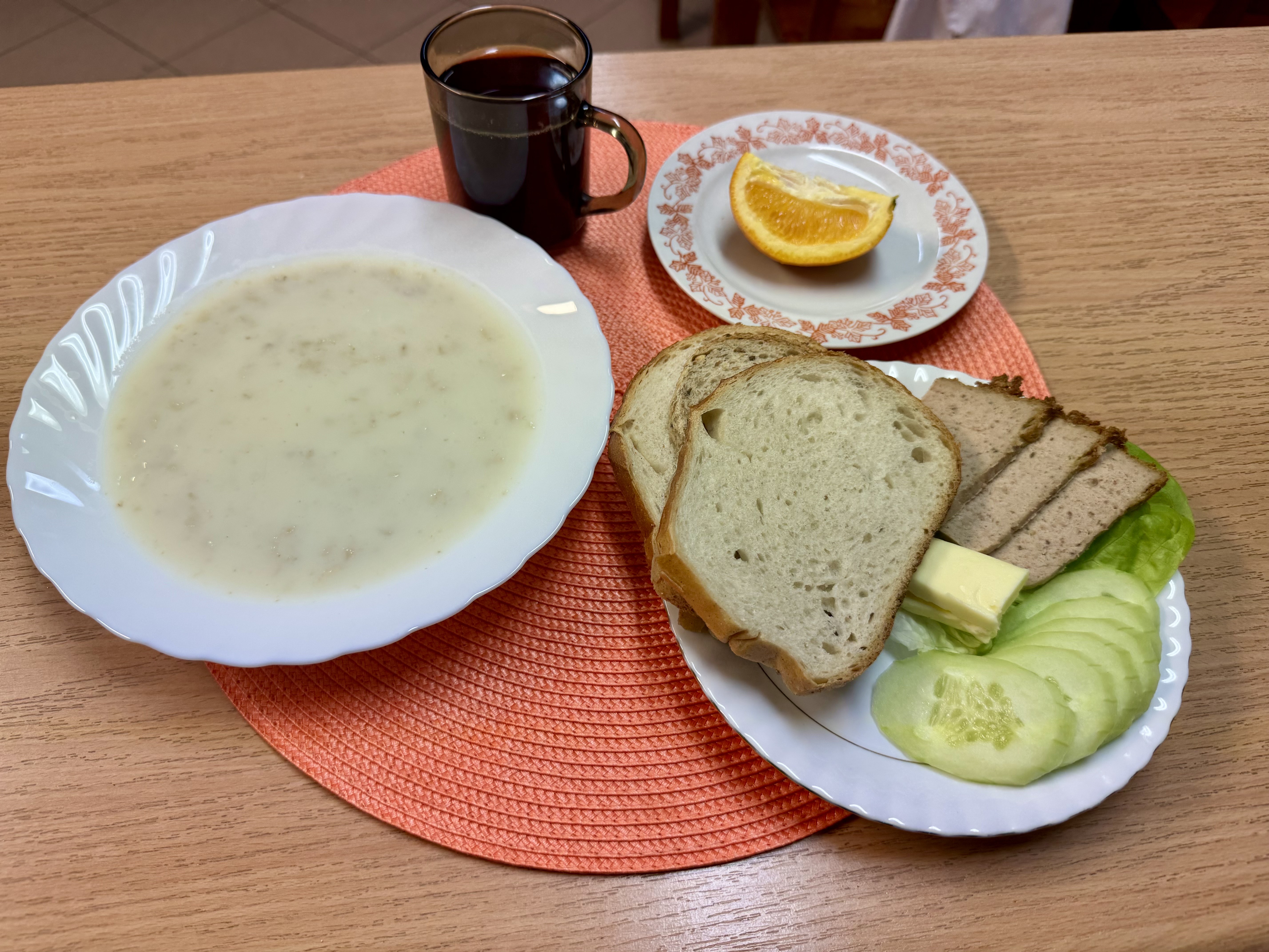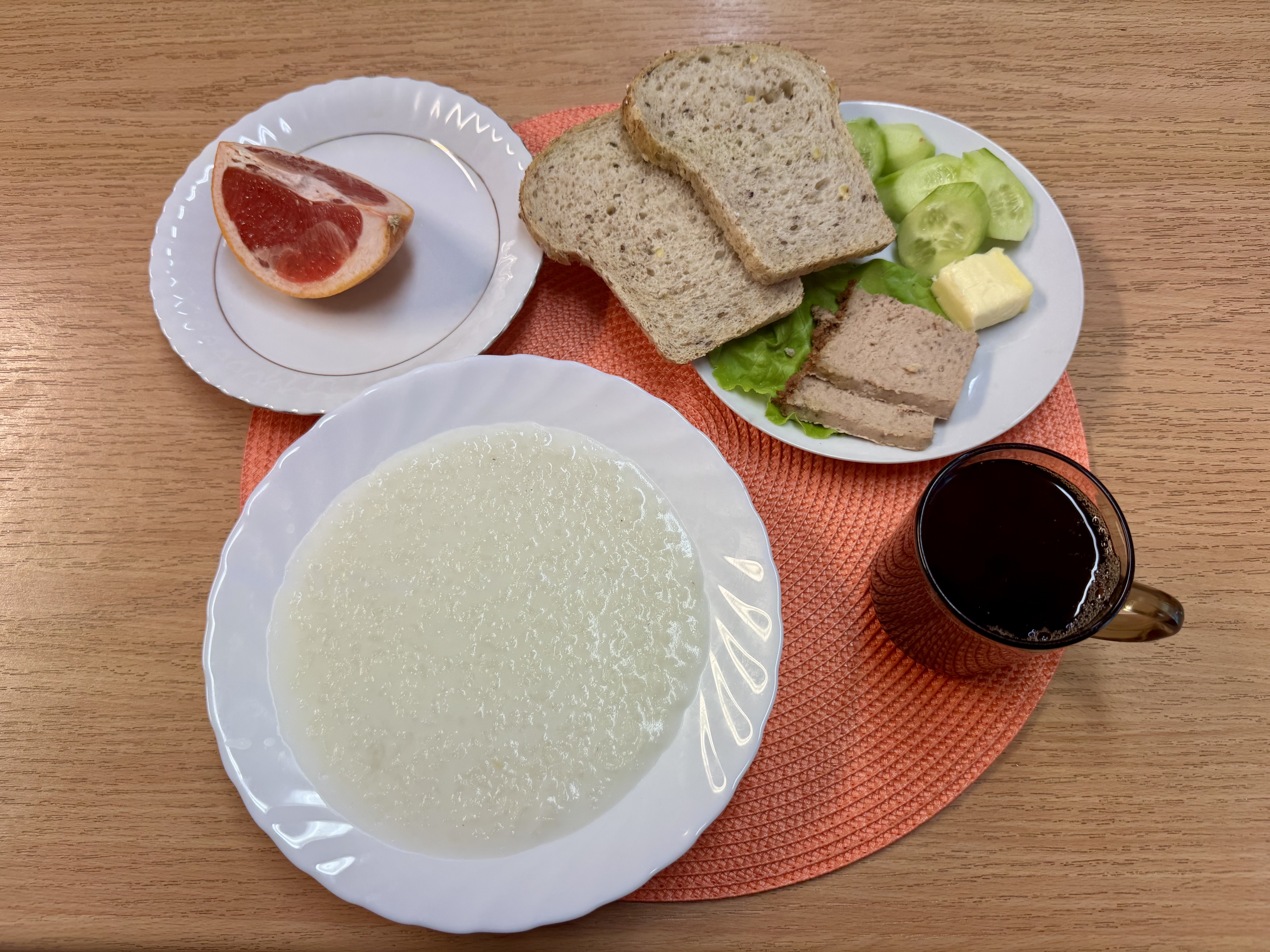| Zupa ml. z płatkami owsianymi 300ml (GLU, MLE) Herbata 250ml Chleb razowy 30g (GLU, SOJ) Chleb zwykły 100g (GLU, JAJ, SOJ) Masło 10g (MLE) Pasztet pieczony 60g (MLE) Owoc 70g ogórek świeży 90g Sałata |