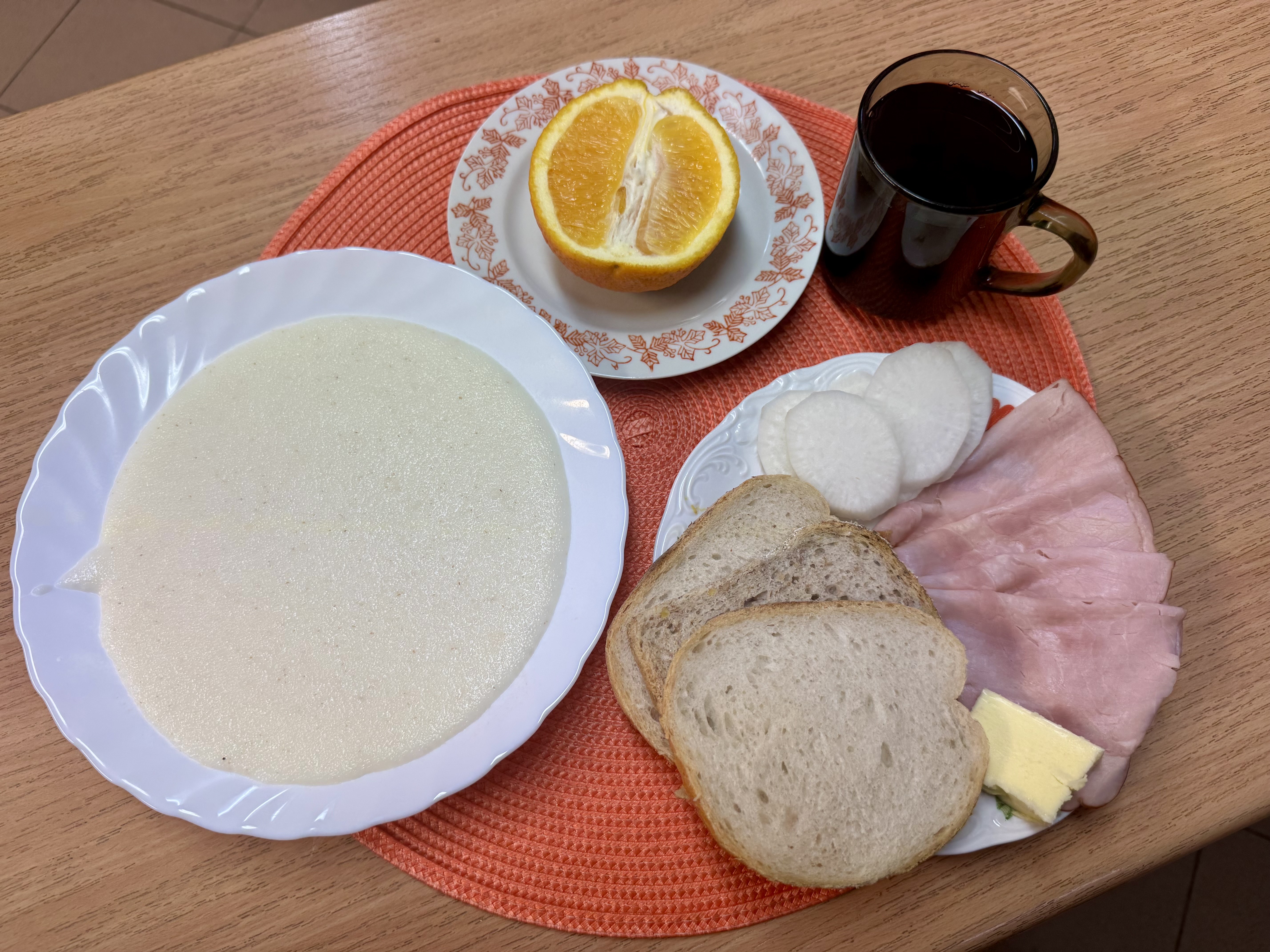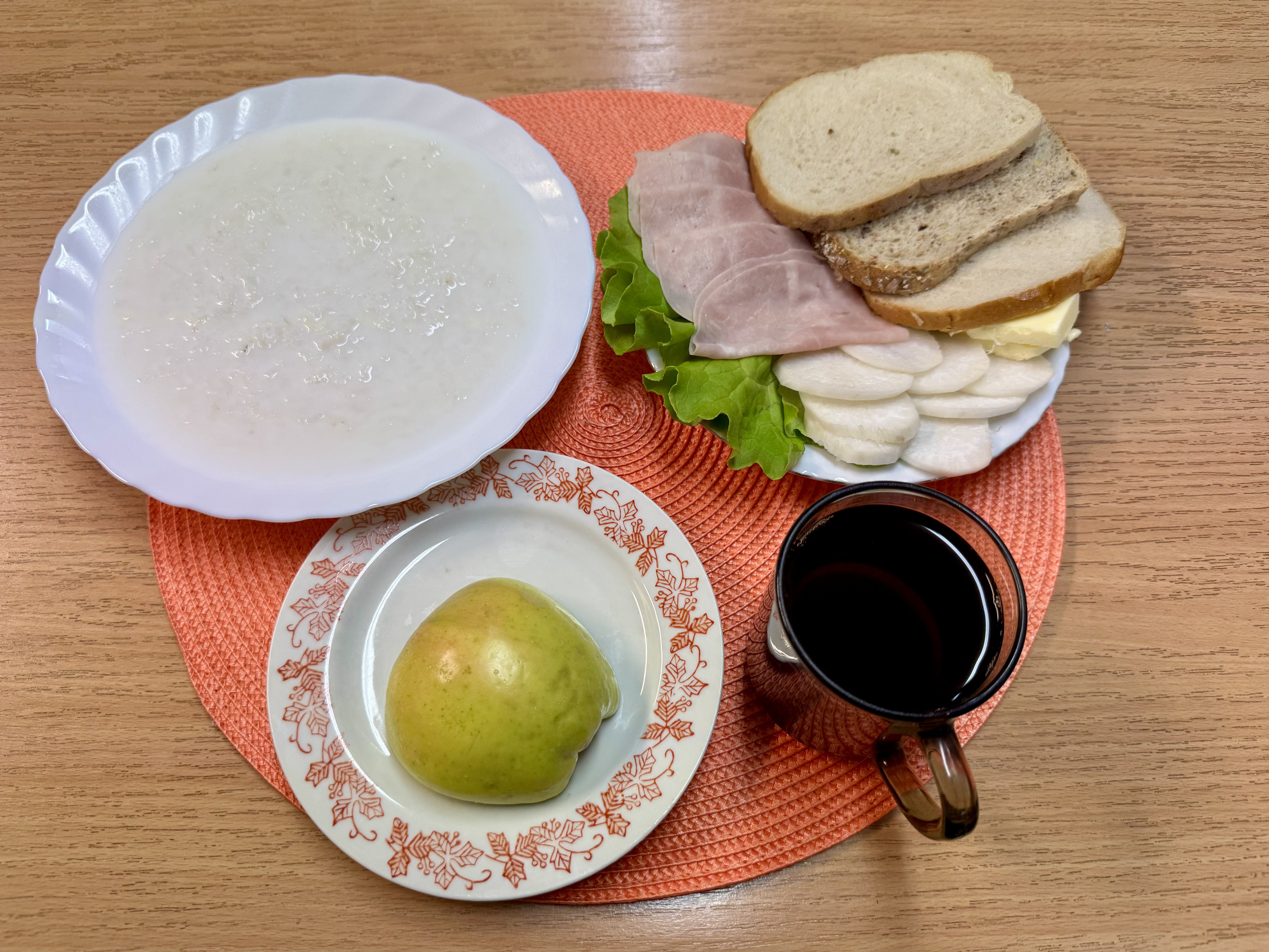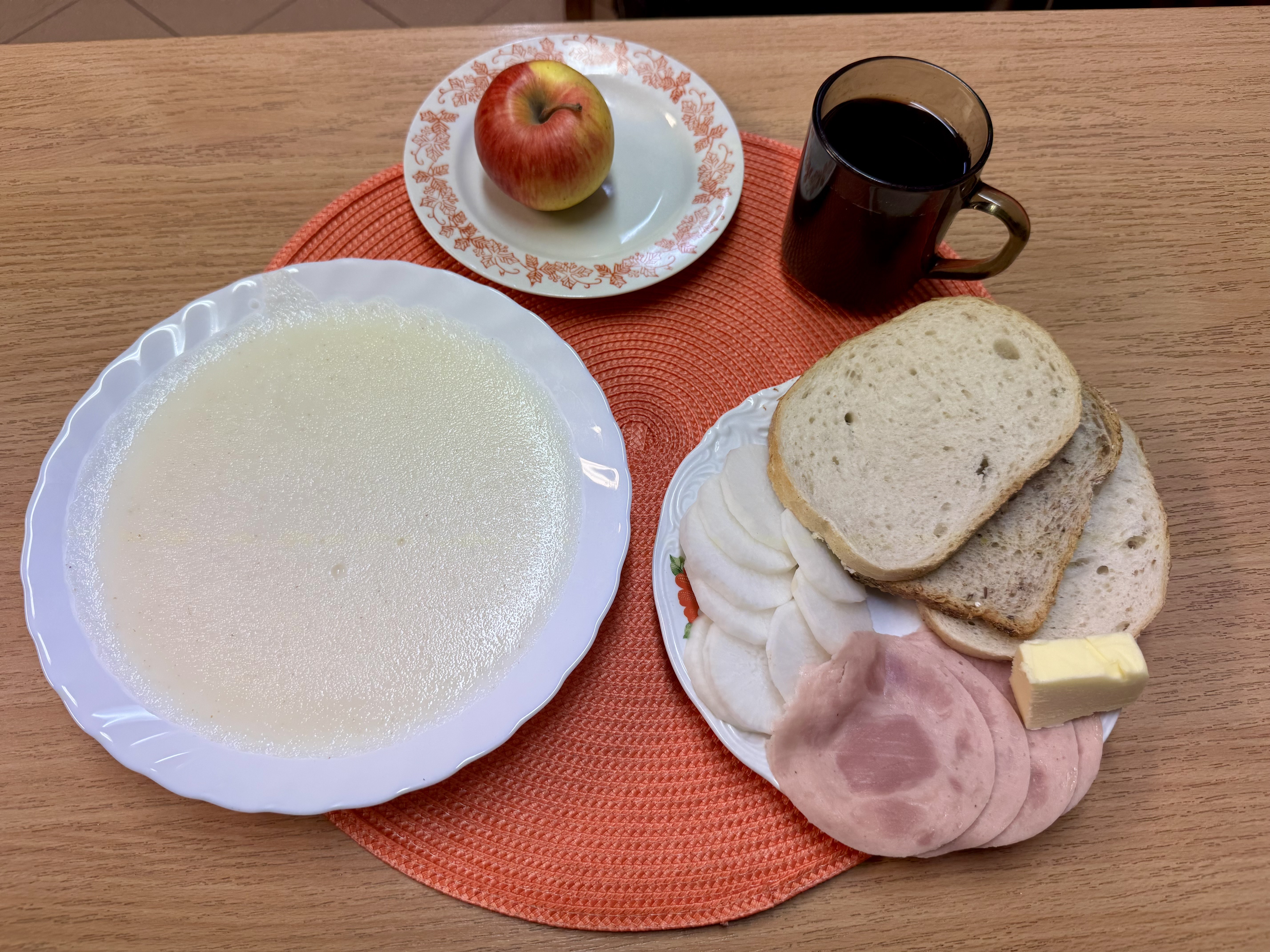 | Zupa ml. z kaszą manną 300ml Herbata z cukrem 250ml Chleb zwykły 100g Chleb razowy 30g Masło 10g Polędwica ani 50g Rzodkiewka 90g Owoc 70g |