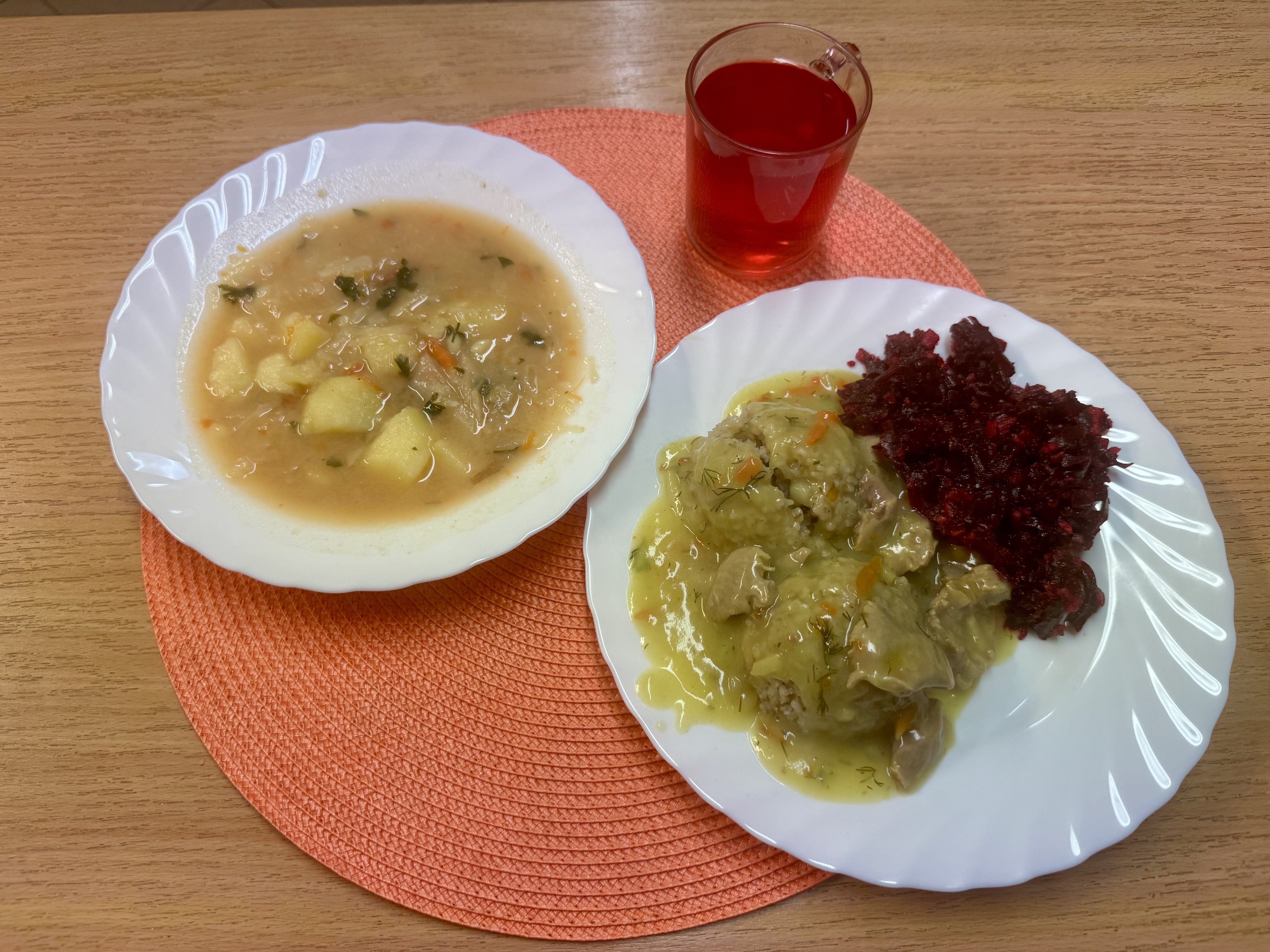 | Zupa pejzanka z ziemniakami 300ml (MLE) Gulasz z żołądków drobiowych duszony b/mąki 150g (GLU) Kasza jęczmienna 200g (GLU) Surówka z buraczków i jabłka z olejem 140g Kompot owocowy 250ml |
