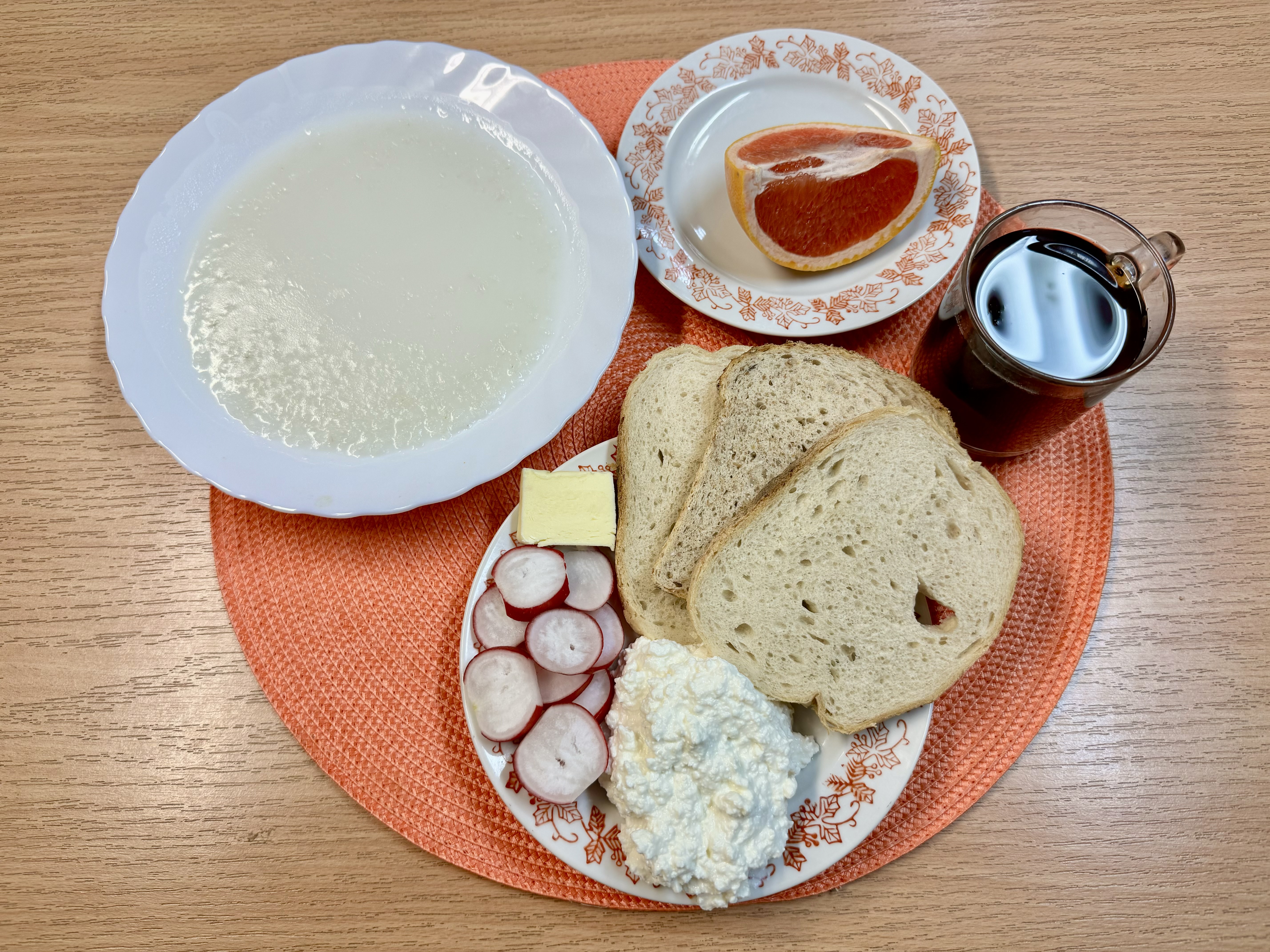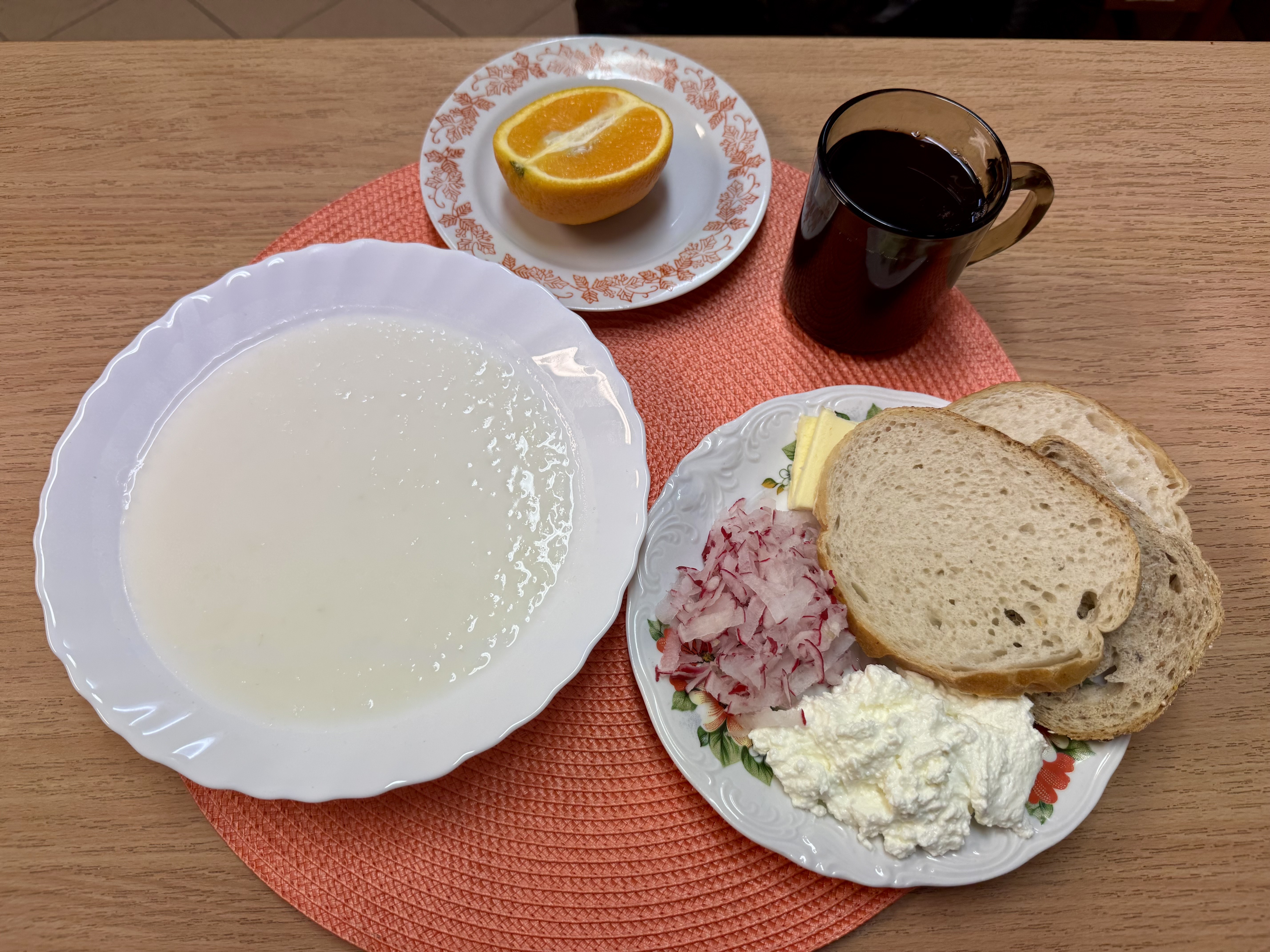 | Zupa ml. z ryżem 300ml (MLE) Herbata z cukrem 250ml Chleb zwykły 100g Chleb razowy 30g Masło 10g (MLE) Twaróg 50g (MLE) Rzodkiewka 90g Owoc 70g |