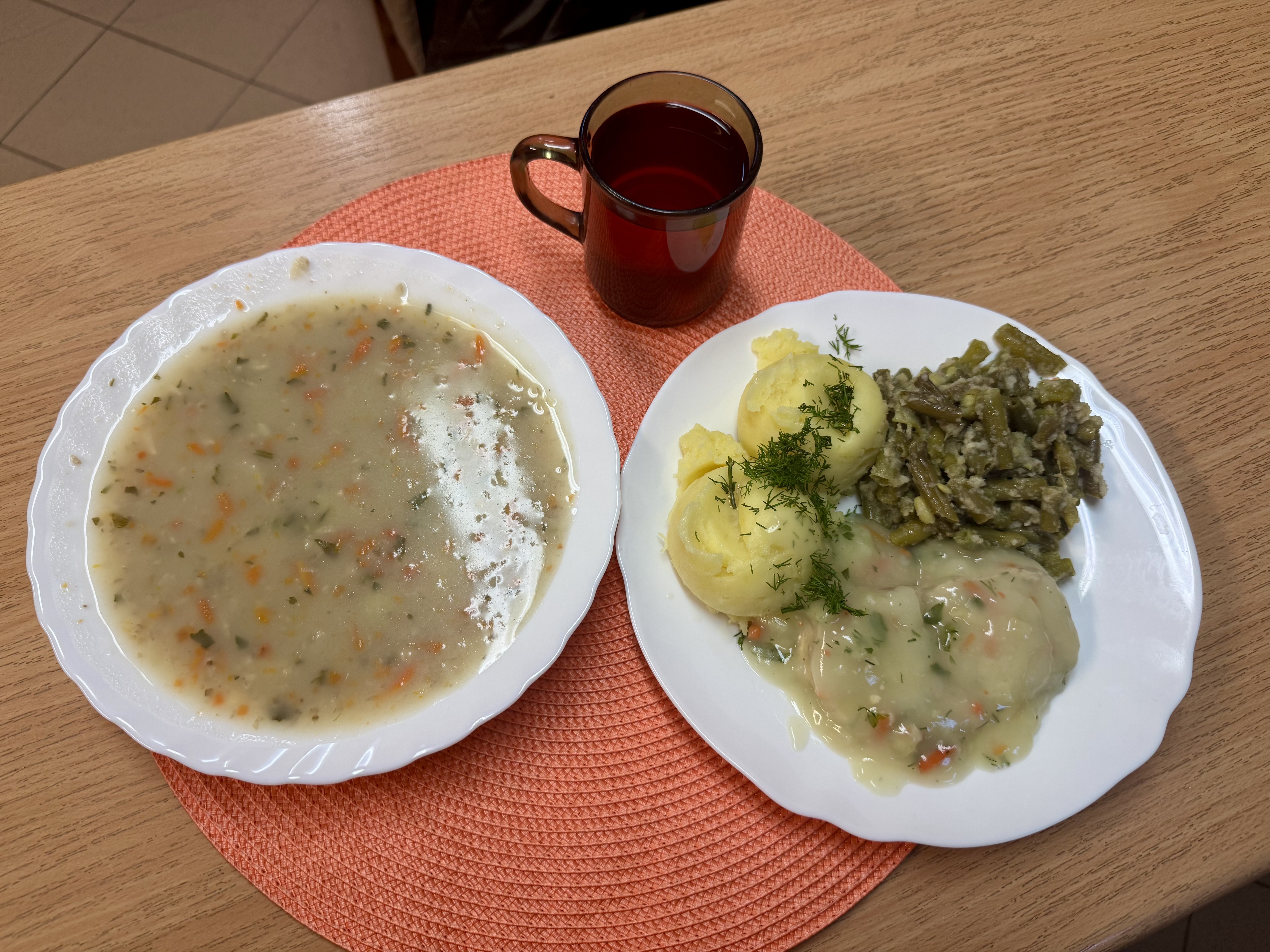 | Krupnik z kaszy jęczmiennej z ziemniakami (GLU, MLE) Rolada drobiowa mielona z marchewką i pietruszką gotowana na parze 90g Ziemniaki 200g Fasolka gotowana na parze 140g Kompot owocowy b/c 250ml |