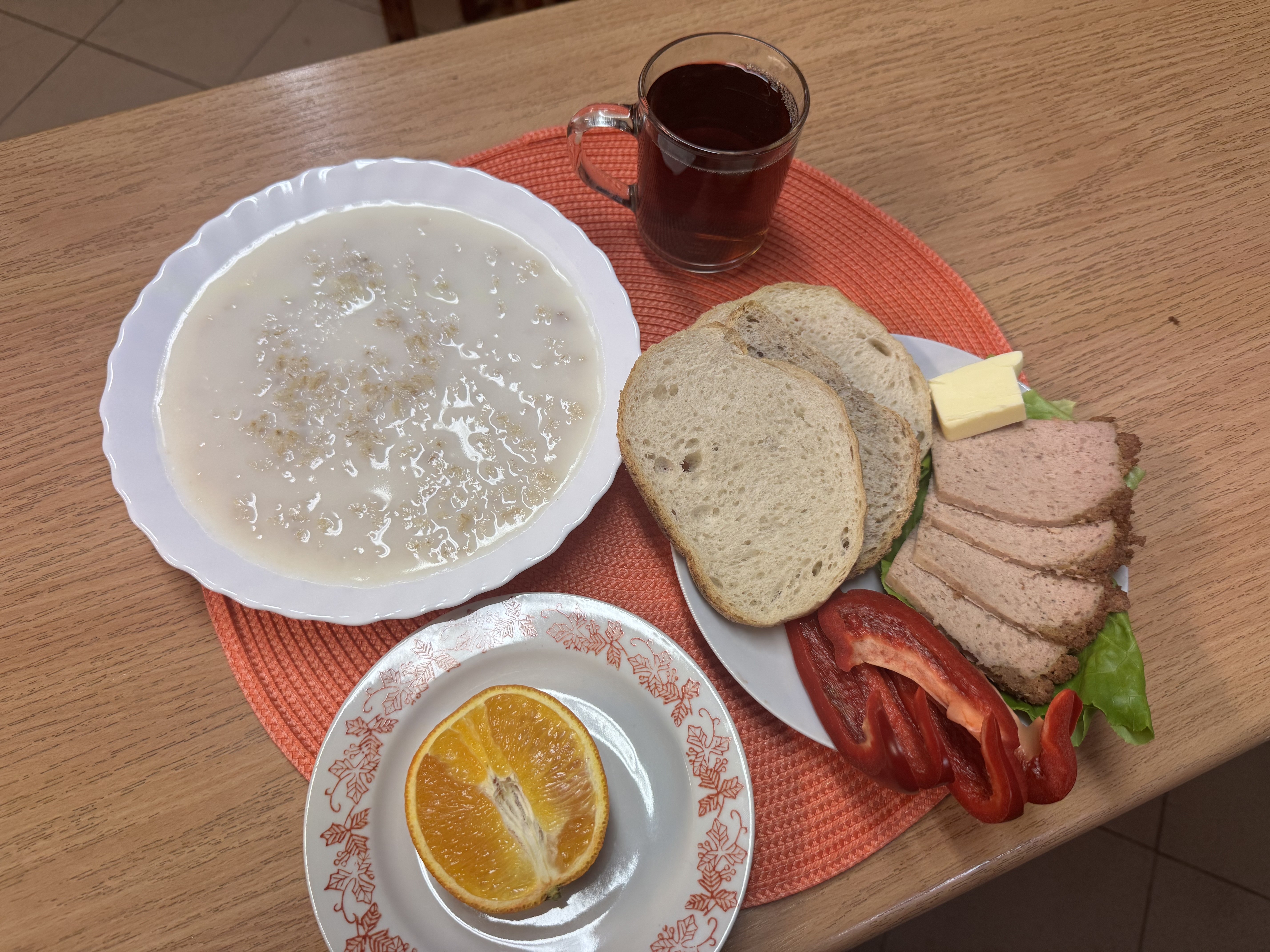 | Zupa ml. z płatkami owsianymi 300ml (GLU, MLE) Herbata 250ml Chleb razowy 100g (GLU) Masło 10g (MLE) Pasztet pieczony drobiowy 50g Papryka świeża 80g Owoc 70g |