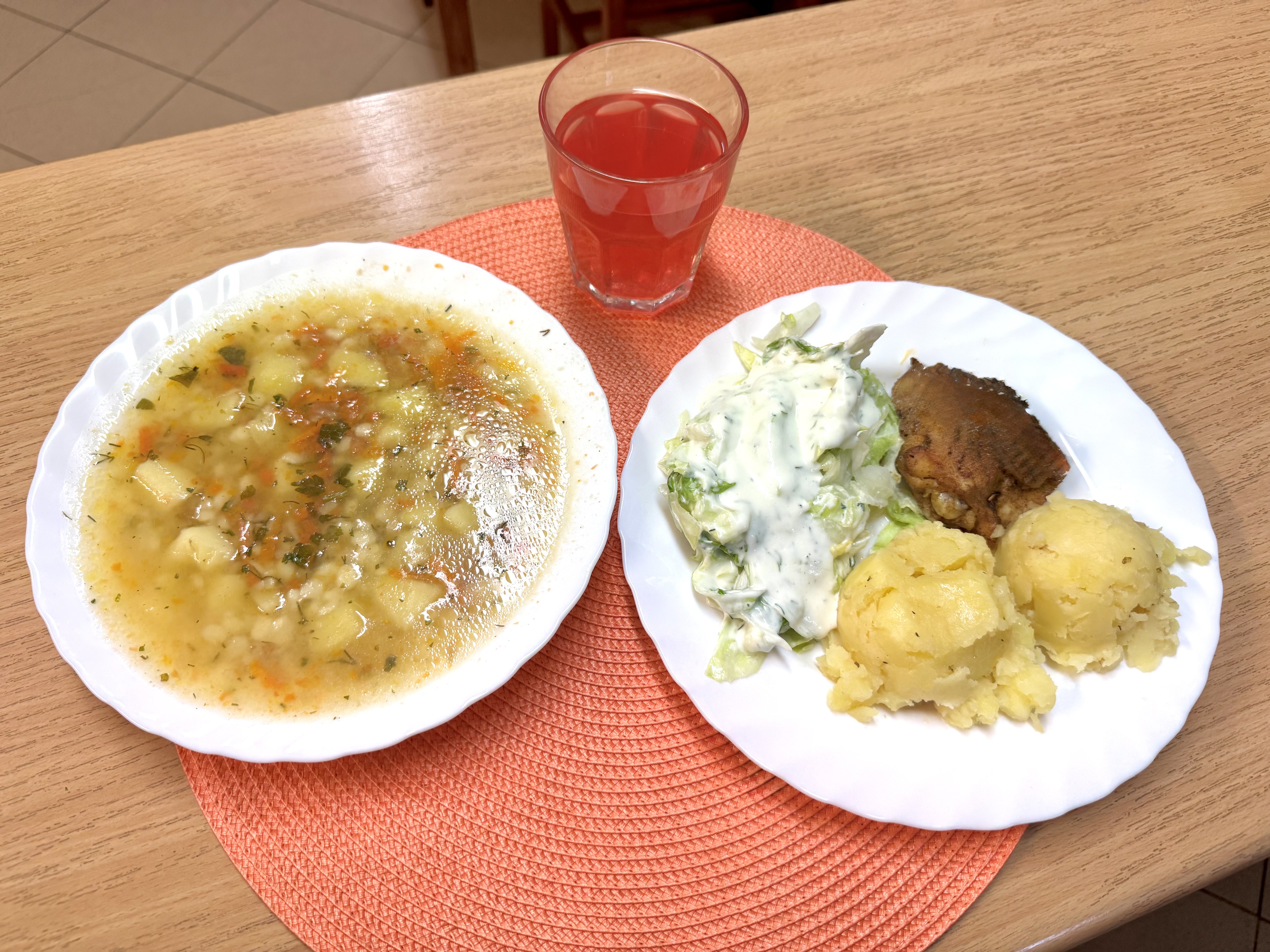 | Barszcz biały z makaronem 300 ml (MLE) Ryba na parze 70 g (RYB) Ziemniaki 200g Warzywa po grecku Kompot owocowy 250 ml |
