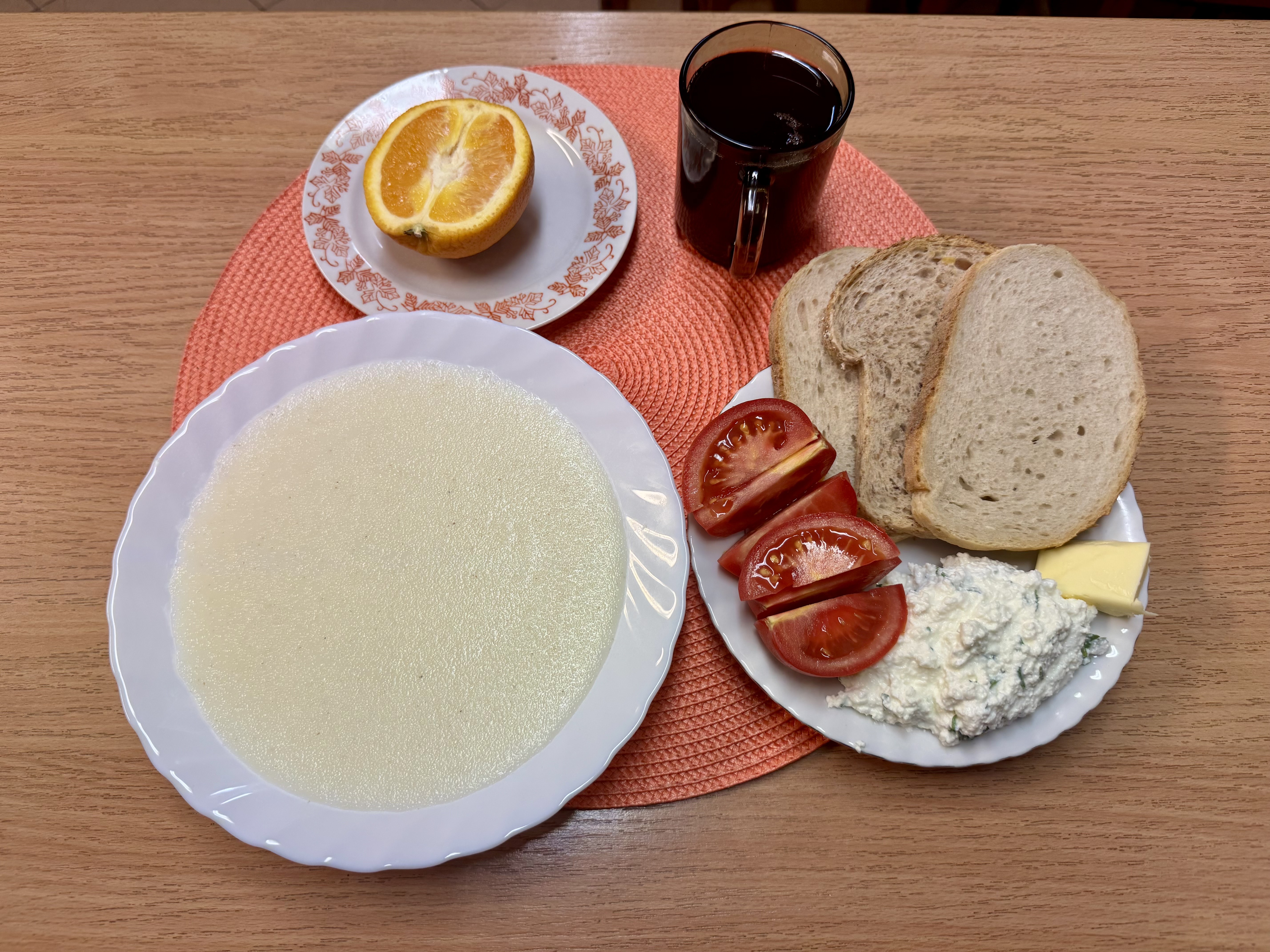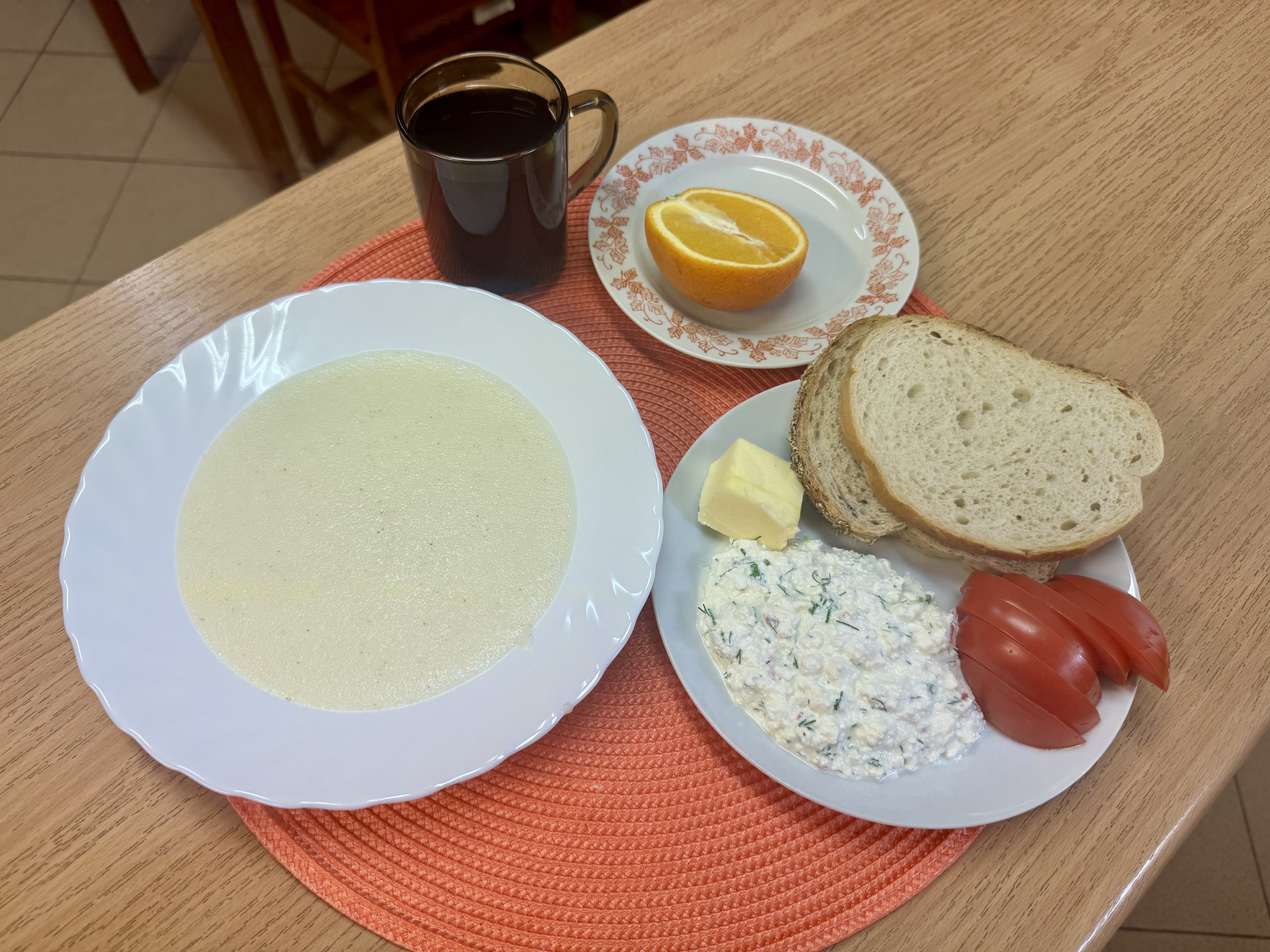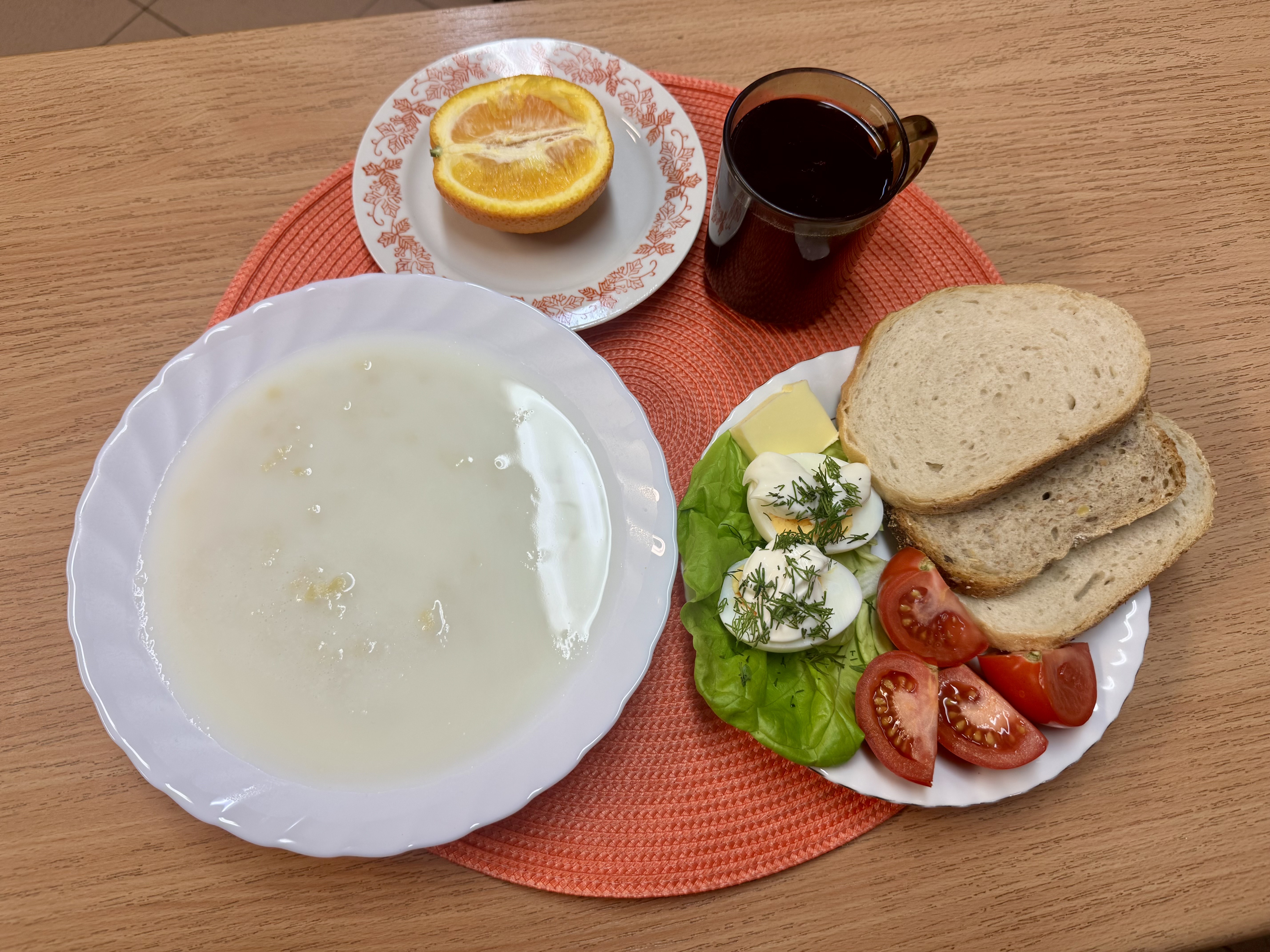 | Zupa mleczna 300ml (GLU, MLE) Herbata z cukrem 250ml Chleb razowy 30g (GLU, SOJ) Chleb zwykły 100 g (GLU, SOJ, MLE) Masło 10g (MLE) Pasta twarogowa 60g (MLE) Owoc 70g Pomidor 90g |