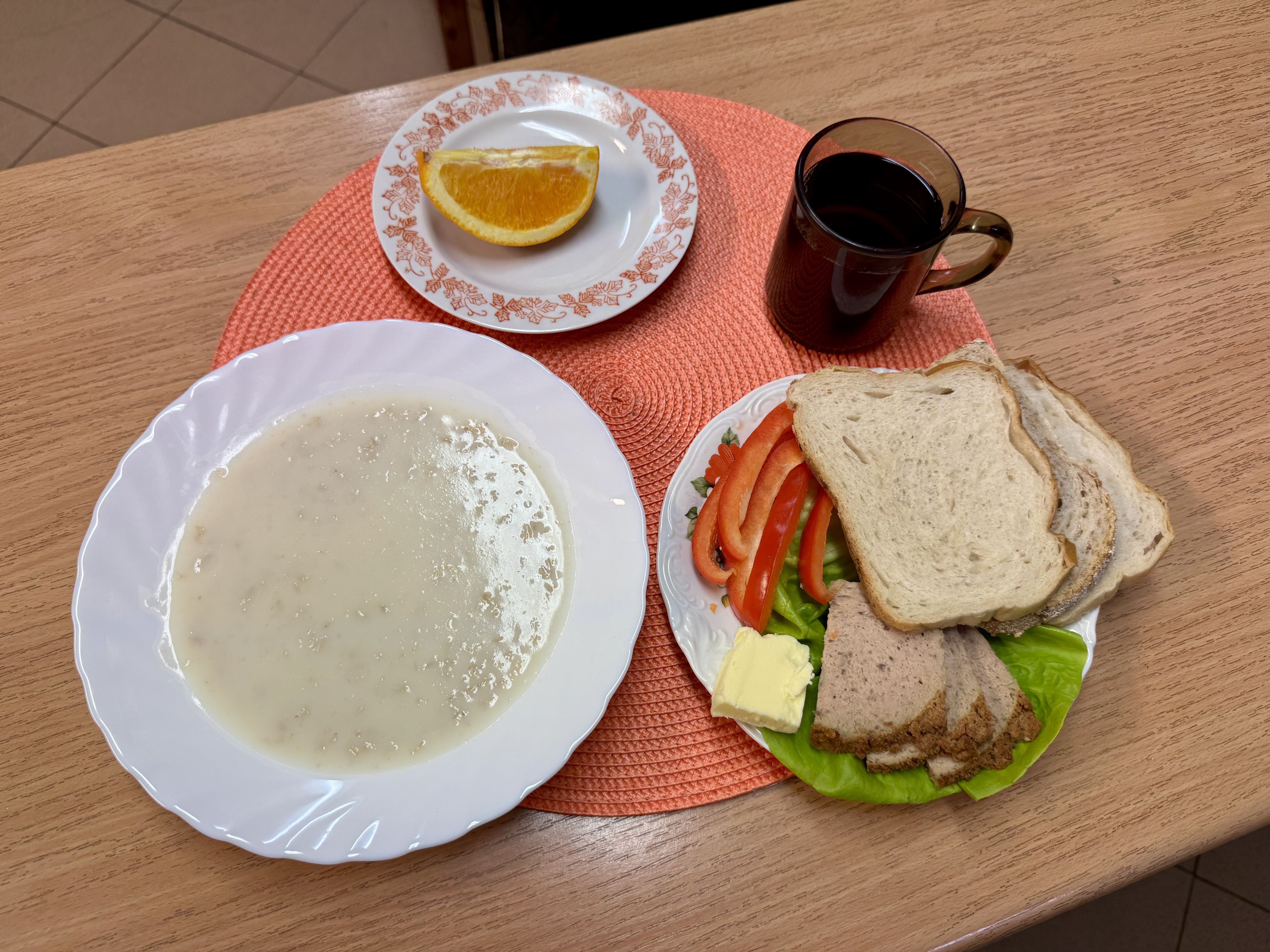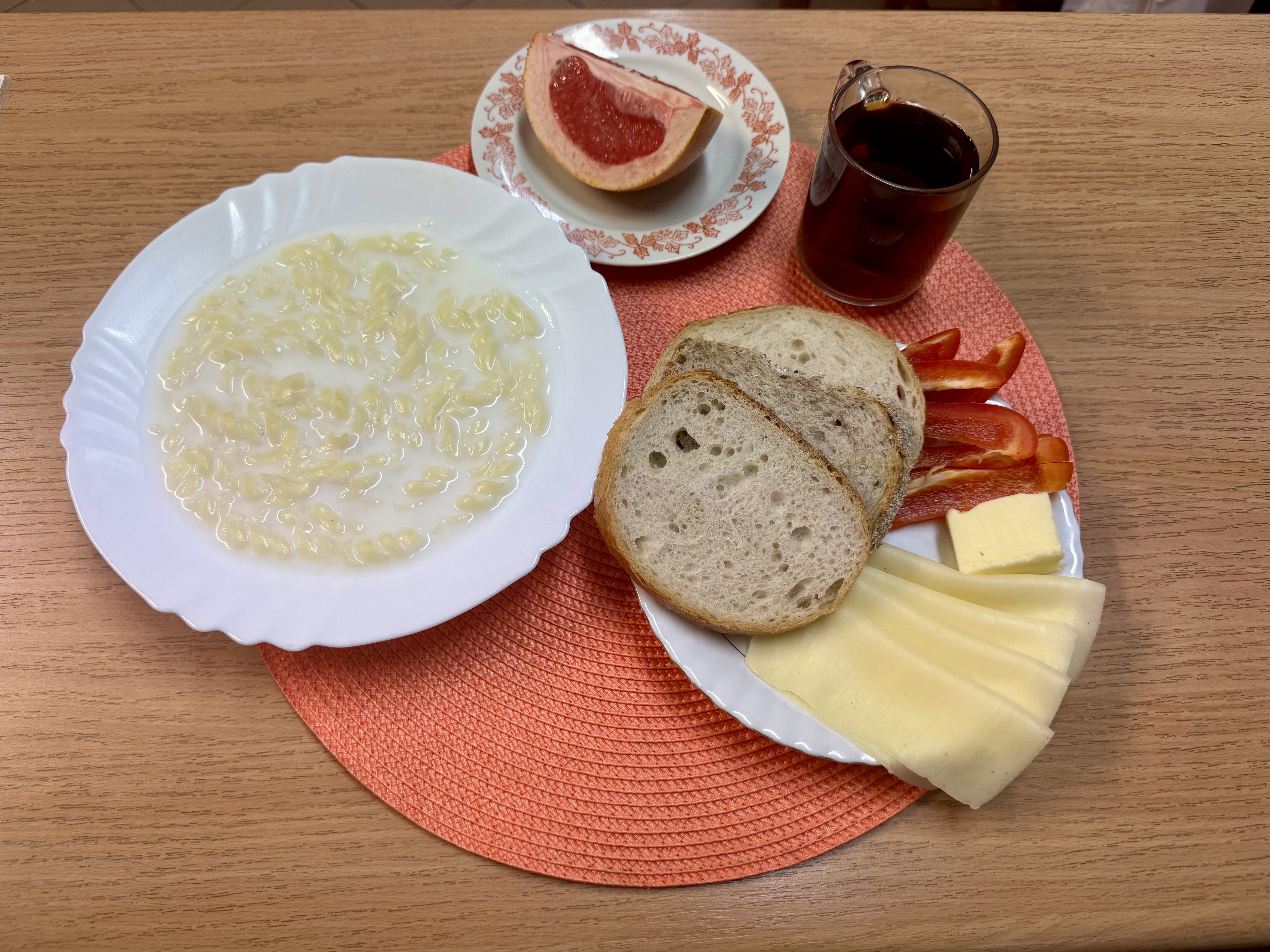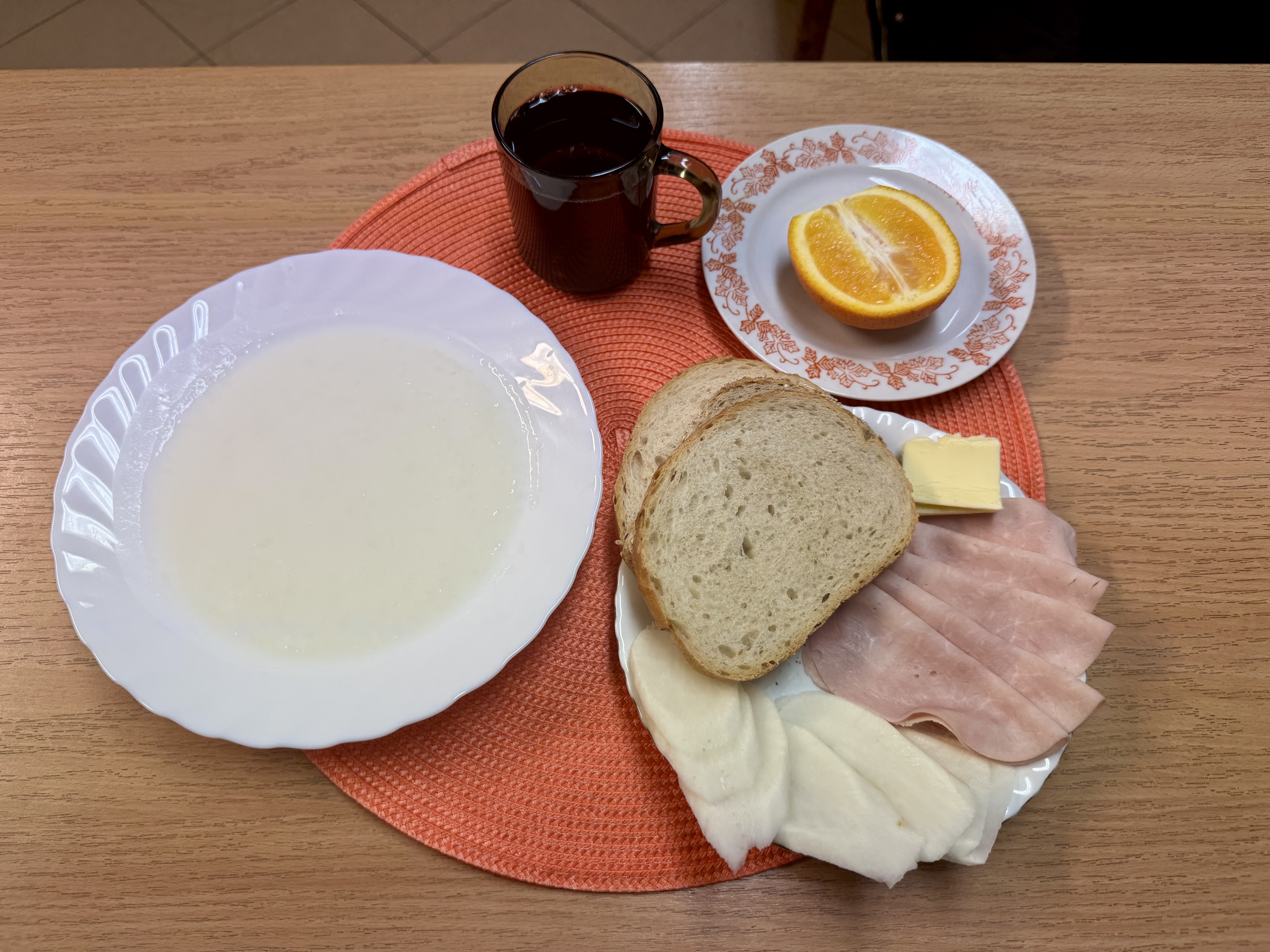 | Zupa mleczna 300ml (GLU, MLE) Herbata z cukrem 250ml Chleb razowy 30g (GLU, SOJ) Chleb zwykły 100 g (GLU, SOJ, MLE) Masło 10g (MLE) Pasta twarogowa 60g (MLE) Owoc 70g Pomidor 90g |