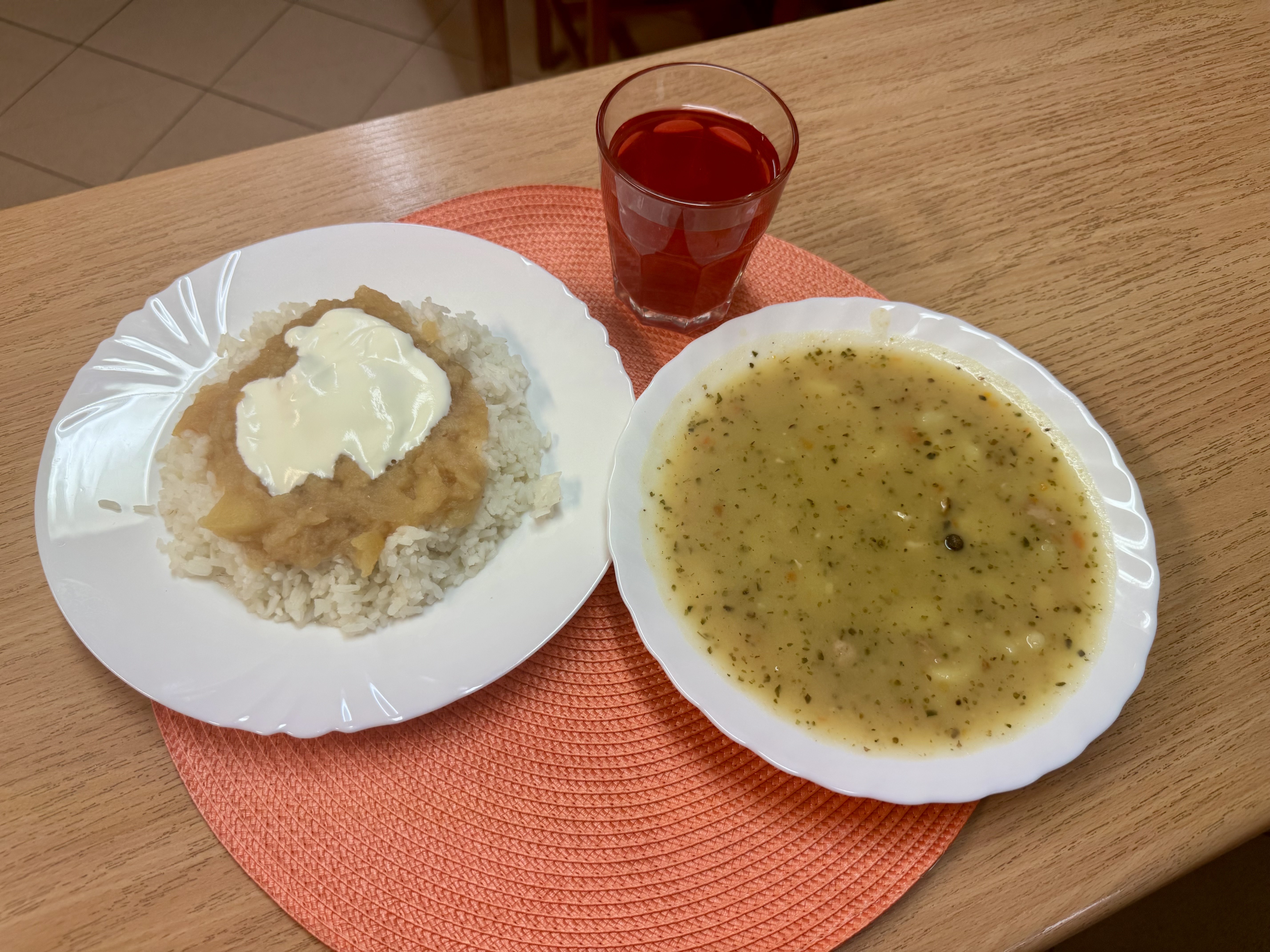 | Zupa grochówka z ziemniakami 300ml Ryż z jabłkiem i cynamonem 300g Jogurt naturalny 50g (MLE) Kompot owocowy 250ml |