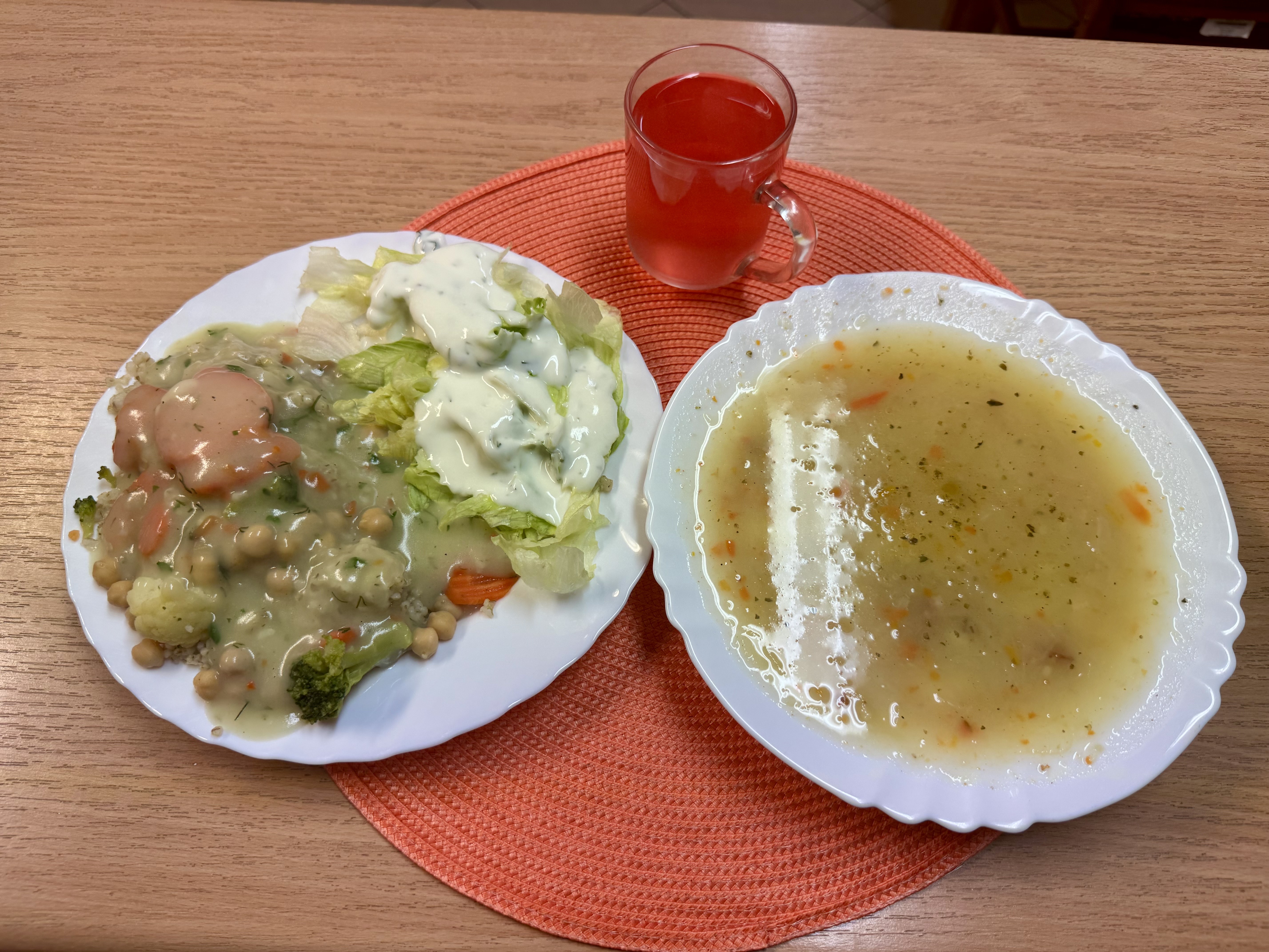 | Zupa kapuśniak z warzywami 300ml Kaszotto z warzywami i ciecierzycą 300g (GLU) Sałata z jogurtem 100g (MLE) Kompot owocowy 250ml |