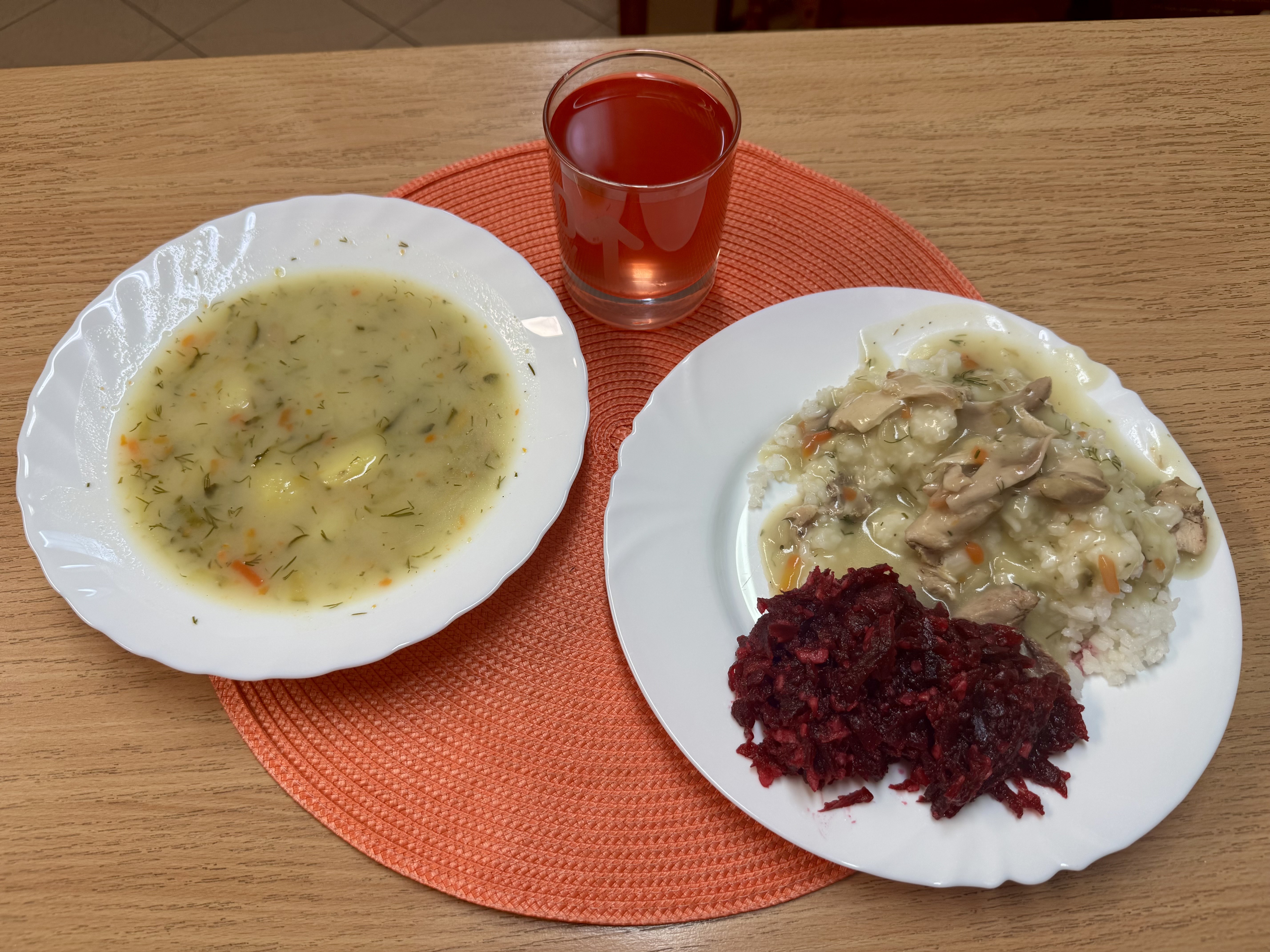 | Zupa ogórkowa z ziemniakami 300 ml (MLE) Potrawka drobiowa 150g (GLU) Ryż 200g Sałatka z buraków i jabłka z olejem 140g Kompot owocowy b/c 250ml |