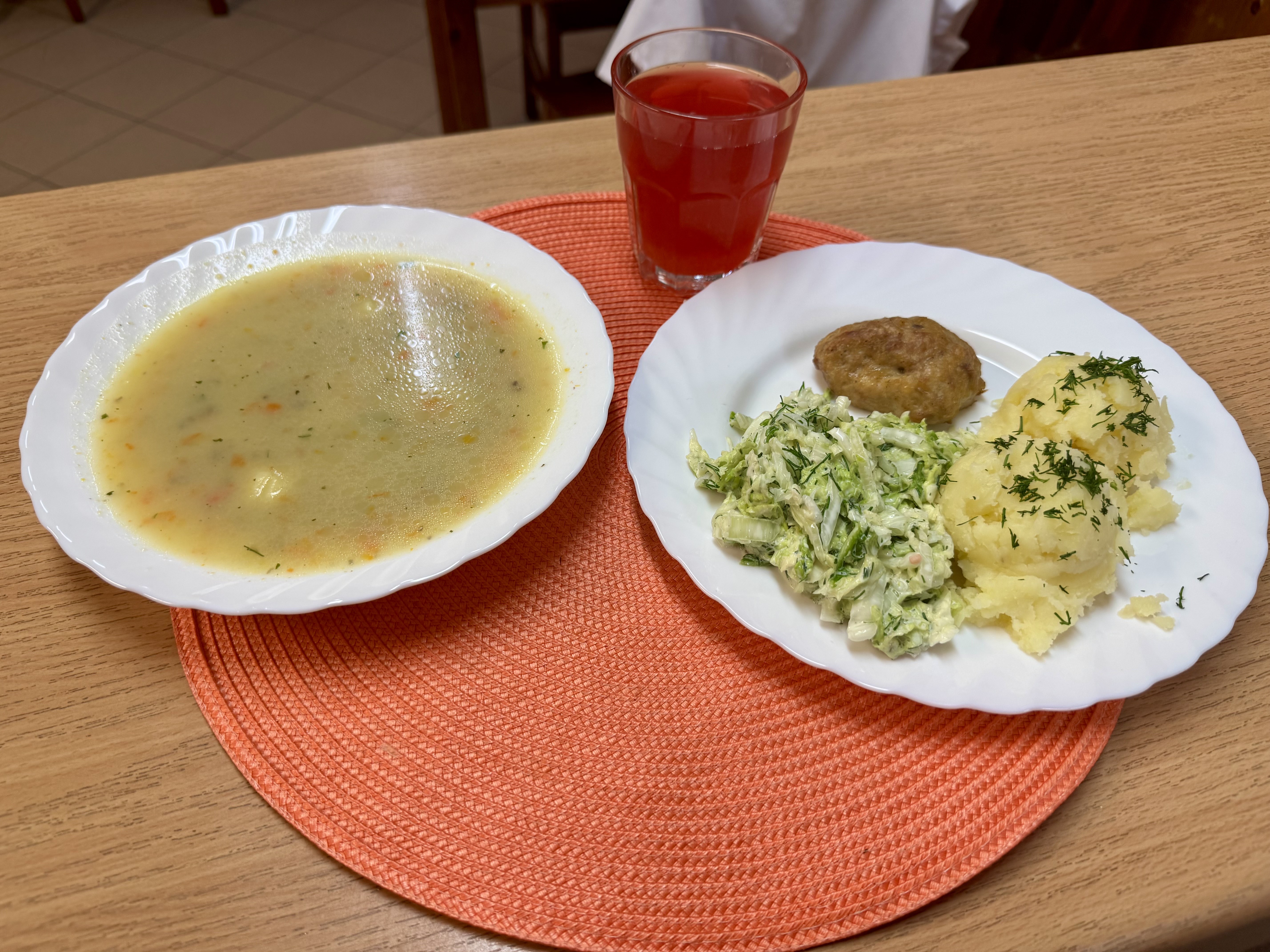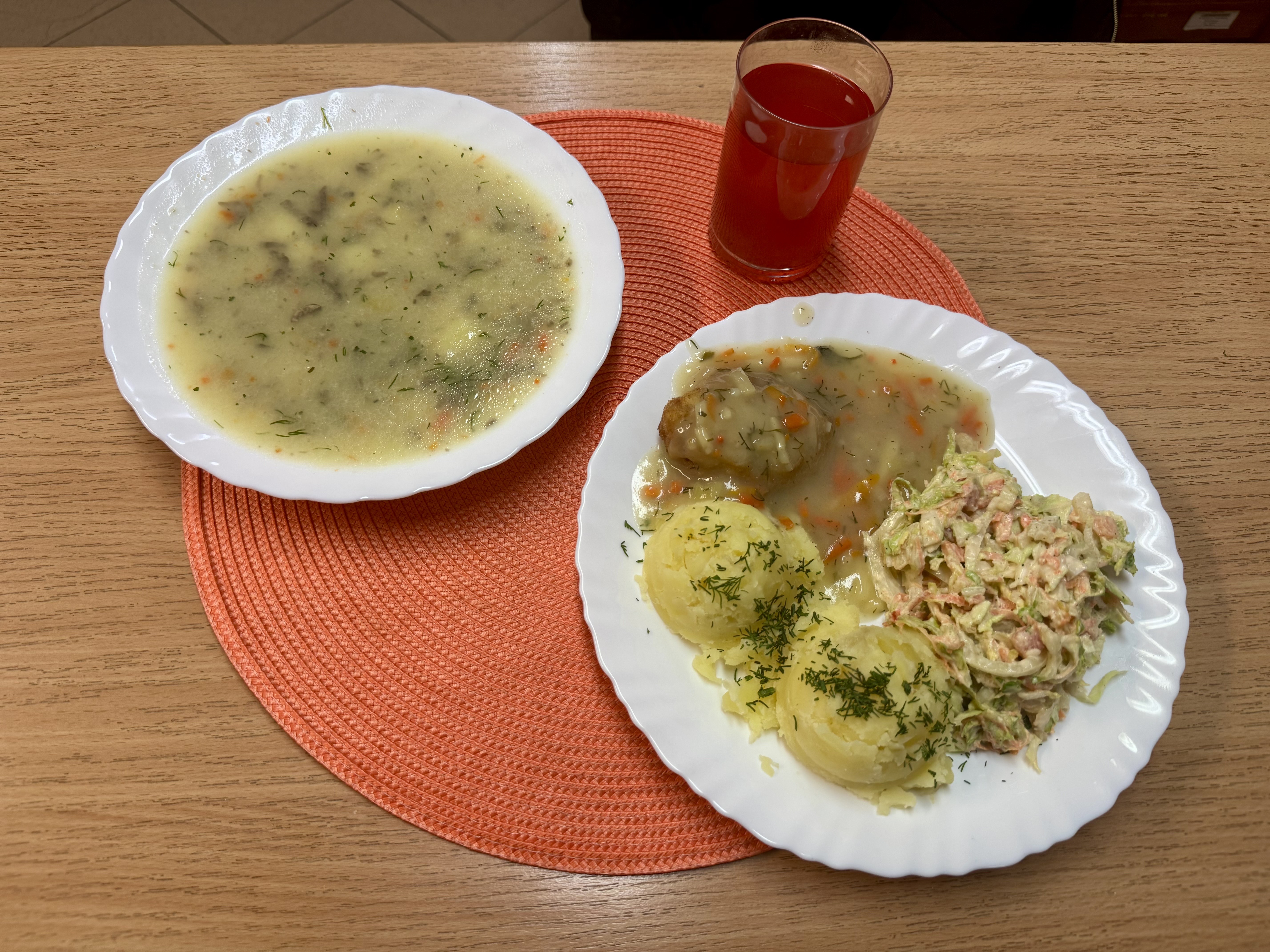 | Zupa pieczarkowa z ziemniakami 300ml (MLE) Kotlet pożarski 90g (GLU, JAJ) Ziemniaki 200g Surówka z kapusty pekińskiej z olejem 140g Kompot owocowy 250ml |