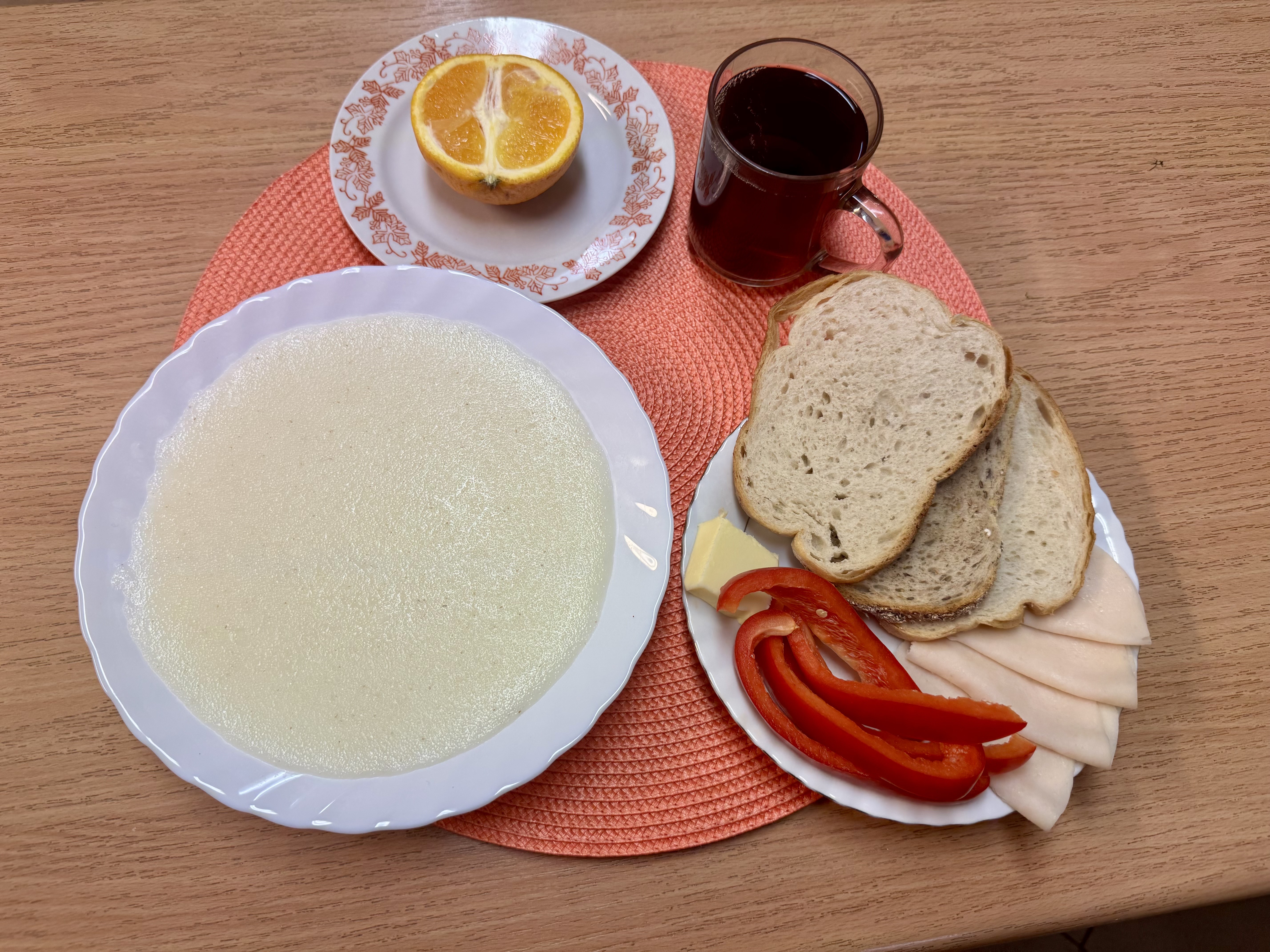 | Zupa ml. z kaszą manną 300ml (GLU, MLE) Herbata z cukrem 250ml Chleb razowy 100g (GLU, SOJ) Masło 10g (MLE) Polędwica Ani 50g (MLE) Owoc 70g Papryka 90g |
