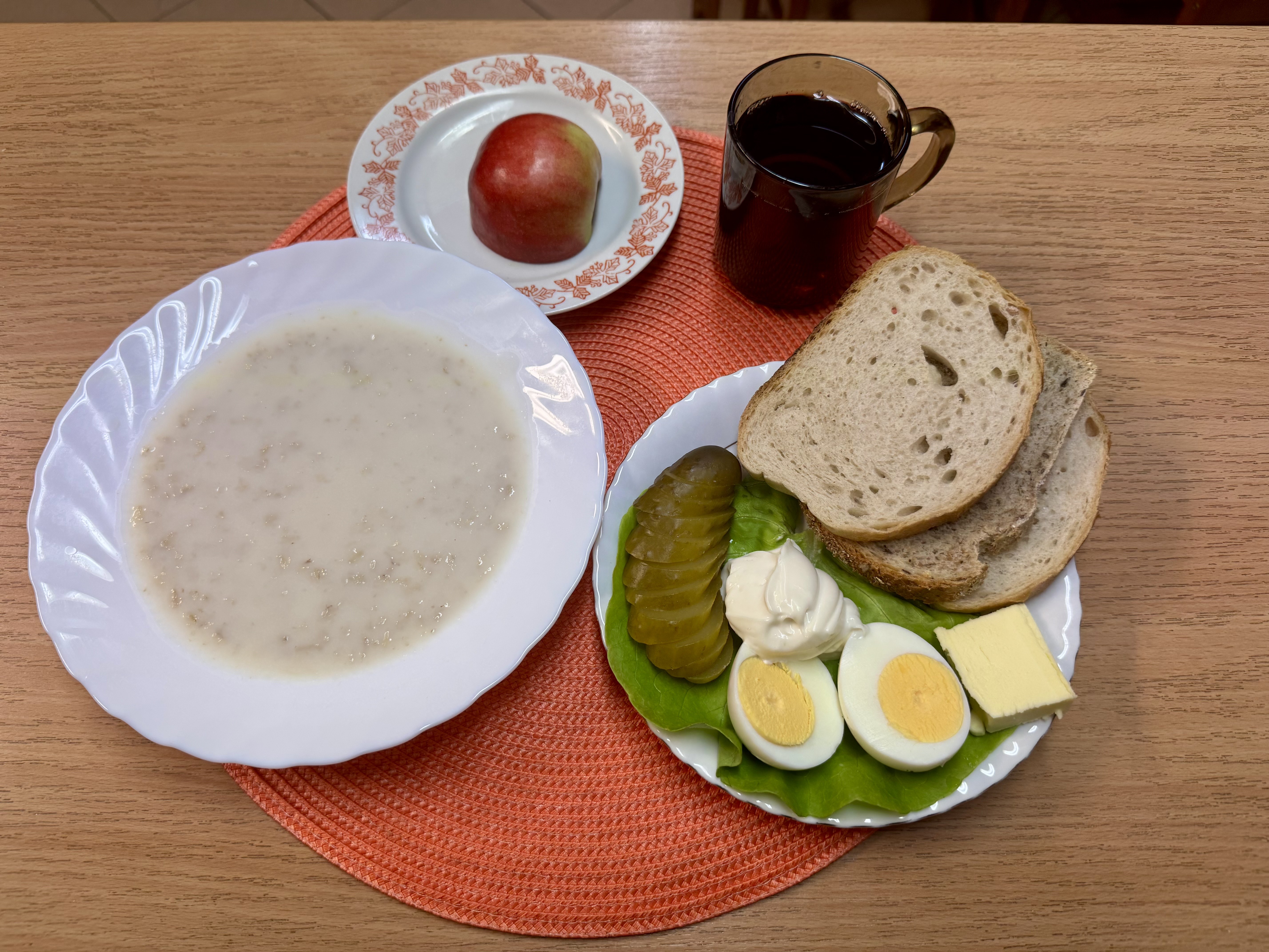 | Zupa ml. z zacierkami 300ml (MLE) Herbata 250ml Chleb razowy 30g (GLU) Chleb zwykły 100g (GLU, SOJ, JAJ) Masło 10g (MLE) Jajko got. na twardo kl. M 1 szt. (JAJ) Majonez 20g (JAJ, GOR) Pomidor 90g Owoc 70g |